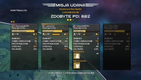 Teoretycznie walki w Helldrivers nie mają końca. W obronie Super Ziemi lub podboju Galaktyki biorą udział gracze z całego świata. Ograniczyć może nas tylko ilość wolnego czasu lub platynowe trofeum, które jest tylko czasochłonne. System rankingowy także jest tutaj zbliżony do tego z Dead Nation.