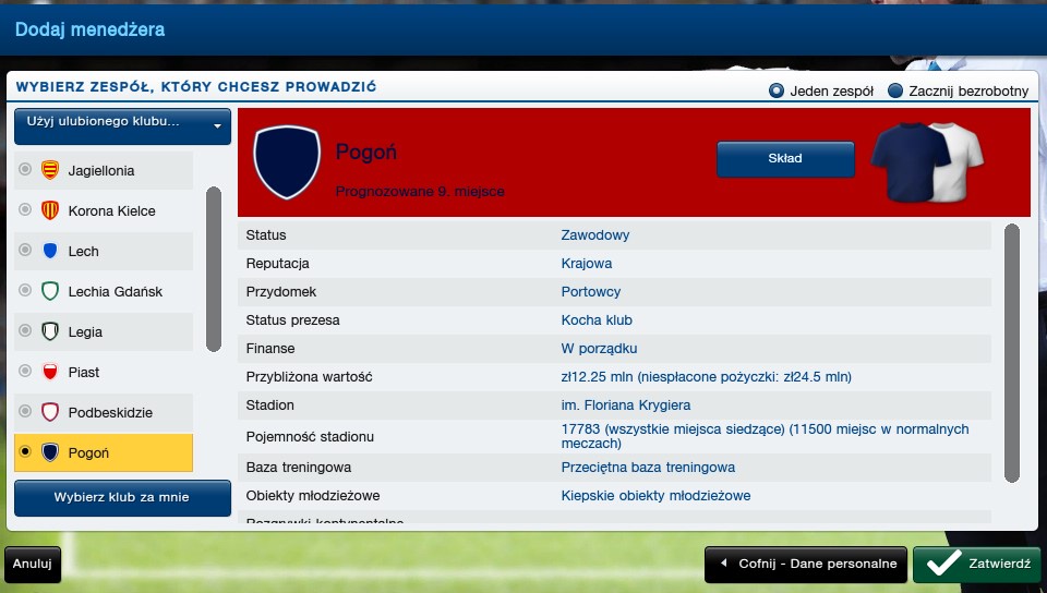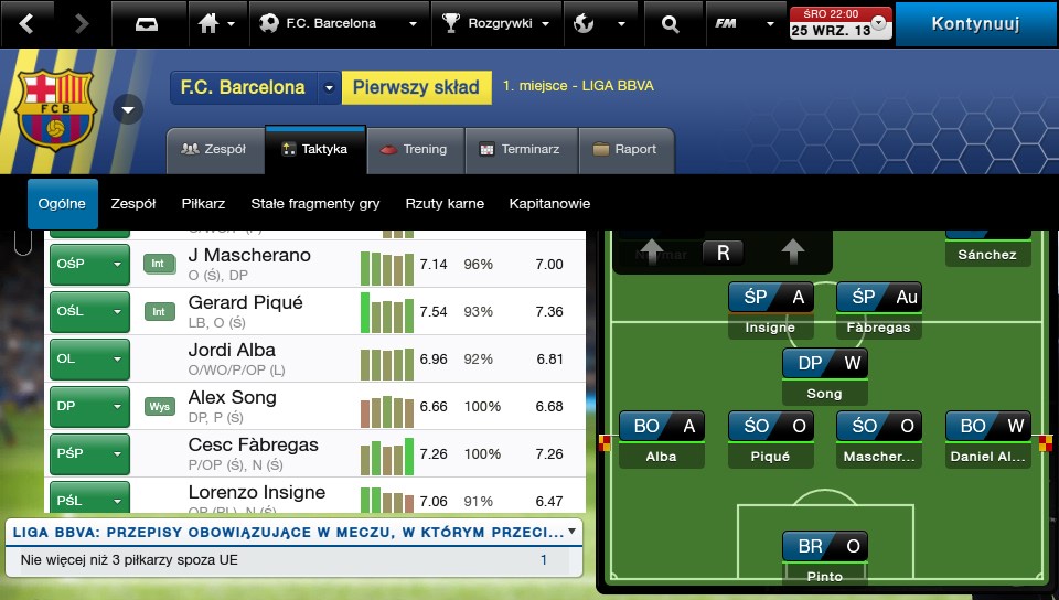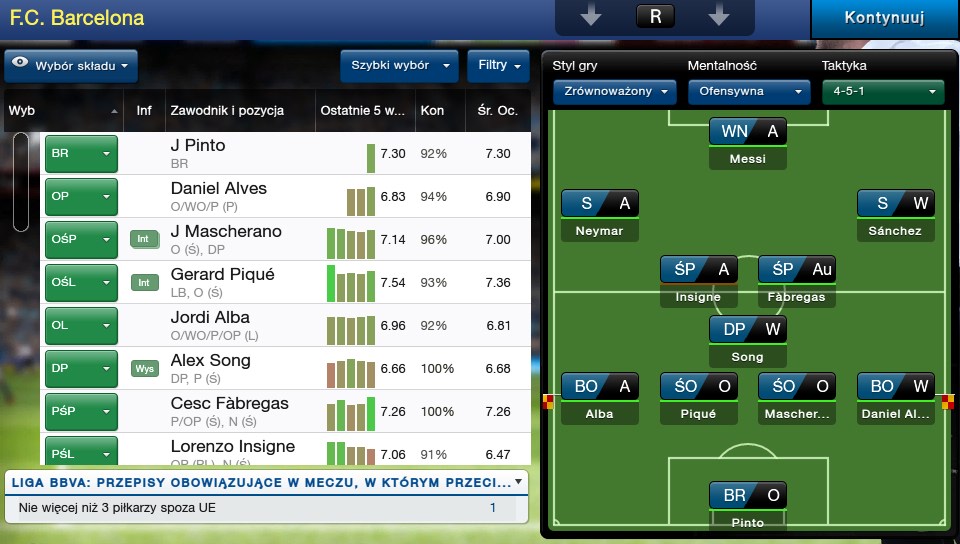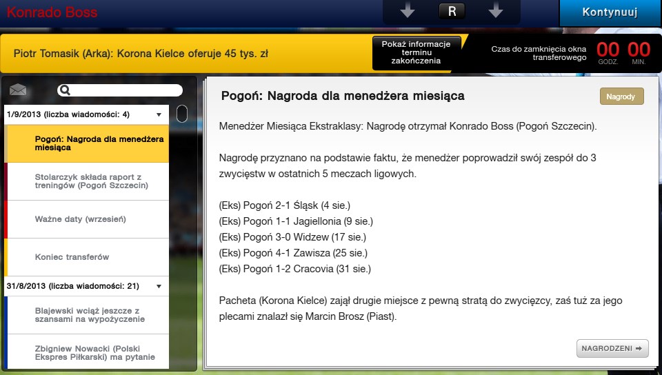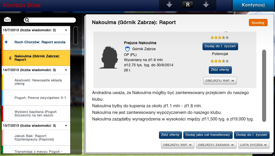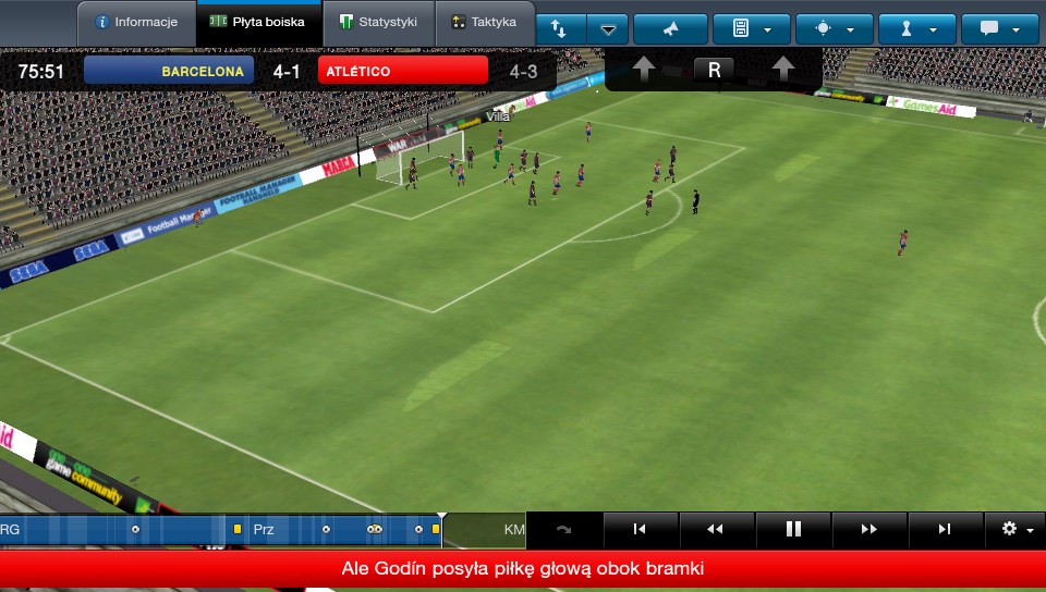Rozgrywając sezon Barceloną świetnie się bawiłem gromiąc kolejne zespoły w lidze. Zupełnie inaczej sytuacja wyglądała, gdy zdecydowałem się pograć w naszej Ekstraklasie. Jak wiecie, w naszej lidze każdy może wygrać z każdym, nie ma konkretnego dominatora. Wybrałem swój ulubiony zespół ekstraklasowy – Pogoń Szczecin. Na początku szło mi nawet przyzwoicie, po pięciu kolejkach byłem na pierwszym miejscu. Niestety, po siódmej przyszły kontuzje, trzech graczy wyjechało do Reprezentacji i nie miałem kim grać. Musiałem powołać kilku graczy z drużyny rezerw, zmienić całą taktykę na bardziej defensywną. Zaczęły się problemy z posiadaniem piłki, skuteczność spadła i przyszły pierwsze porażki lub ledwo wywalczone remisy. W takich momentach granie w FMC 2014 daje najwięcej frajdy. Nie raz, nie dwa patrzyłem się kilka minut w ekran konsoli, główkując nad taktyką – ta gra jest strasznym pożeraczem czasu, jeszcze tylko jeden mecz…