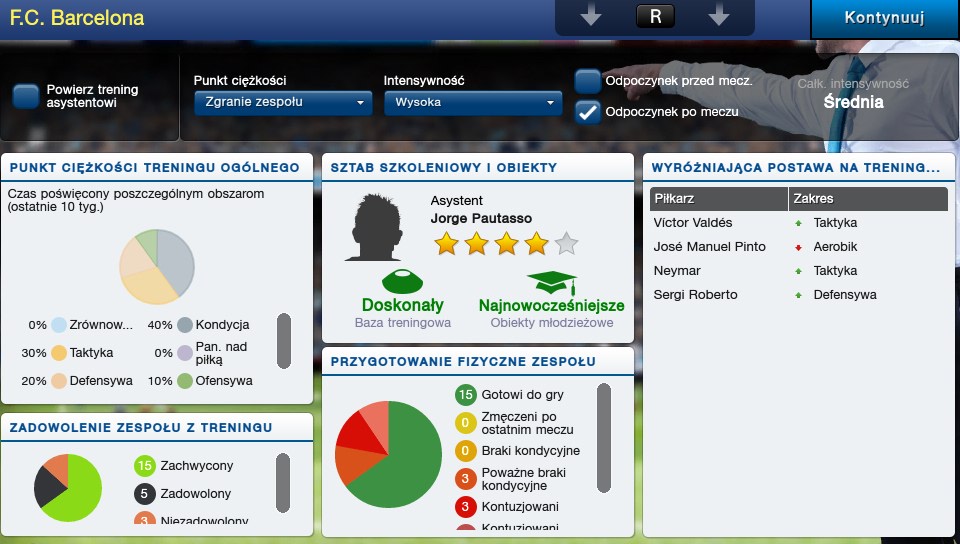 Niestety, kwestie treningowe zostały mocno ograniczone, co jest dla mnie dużą wadą. Trenowanie zespołu możemy oddać asystentowi albo sami możemy wybrać punkty treningowe takie jak: kondycja, panowanie nad piłką, zgranie zespołu, atak i obrona. Nie ma za to w FMC 2014 indywidualnych treningów dla pojedynczych zawodników, a szkoda, bo taki Robak w Pogoni ma ogromne problemu ze skutecznością i nie przypomina swojego prawdziwego odpowiednika, który jest najlepszym strzelcem Ekstraklasy.