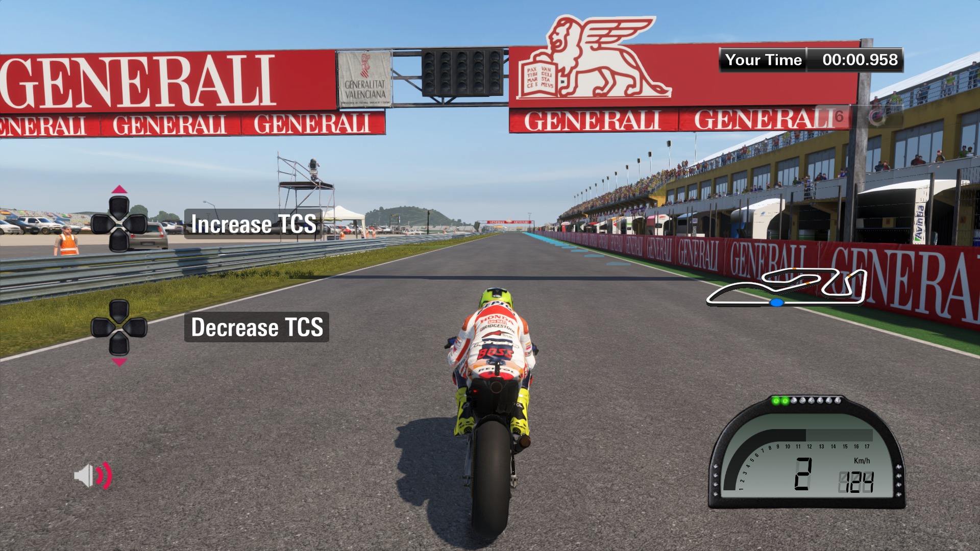 Dźwiękowcy wyraźnie nie chcieli być gorsi od grafików, bo efekt ich pracy także jest rewelacyjny. Dźwięk jest dynamicznie dostosowywany, zależnie od naszego punktu ustawienia kamery. Jeżeli, jak ja, lubicie jeździć korzystając z kamery imitującej kask, to odgłosy pracy silnika będą tłumione. Korzystając z kamery pierwszoosobowej dźwięk będzie bardzo głośny, jakbyście jechali bez kasku. Natomiast używając kamery z trzeciej osoby, czyli mając cały motocykl przed sobą i zaczniecie obracać kamerę, to dźwięk będzie się wyraźnie zmieniał. Inaczej będzie tłumiony z boku, a inaczej gdy spojrzymy na motocykl od przodu. Co do dźwięku samych silników i tłumików, to jest to już klasa mistrzowska. Niestety odgłosy małych motocykli z klasy Moto3 nikogo nie zachwycą, gdyż nie różnią się dużo od kosiarek. Natomiast biorąc udział w zawodach klasy mistrzowskiej MotoGP, mając podpięte dobrej jakości kolumny, można odnieść wrażenie, jakby się naprawdę pod sobą miało tego sportowego ścigacza.
