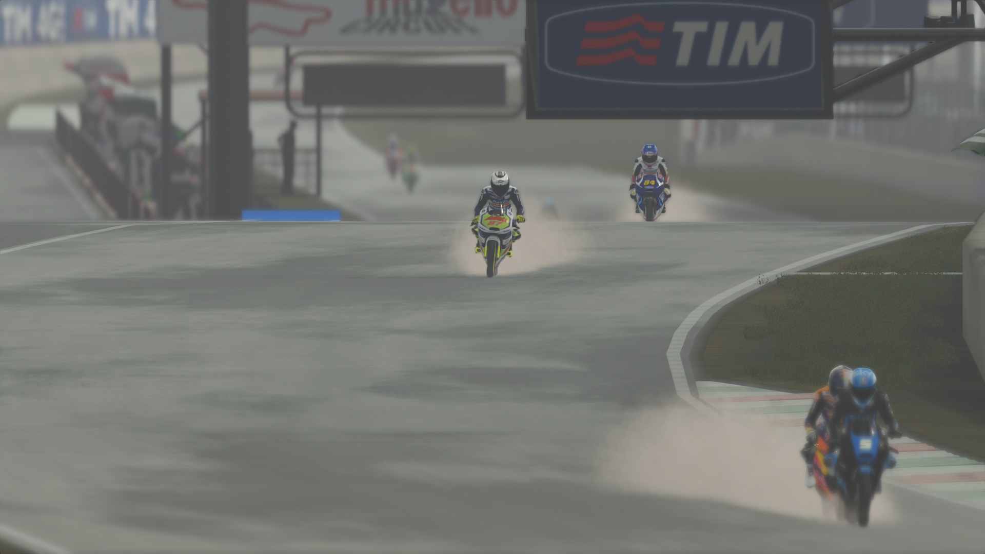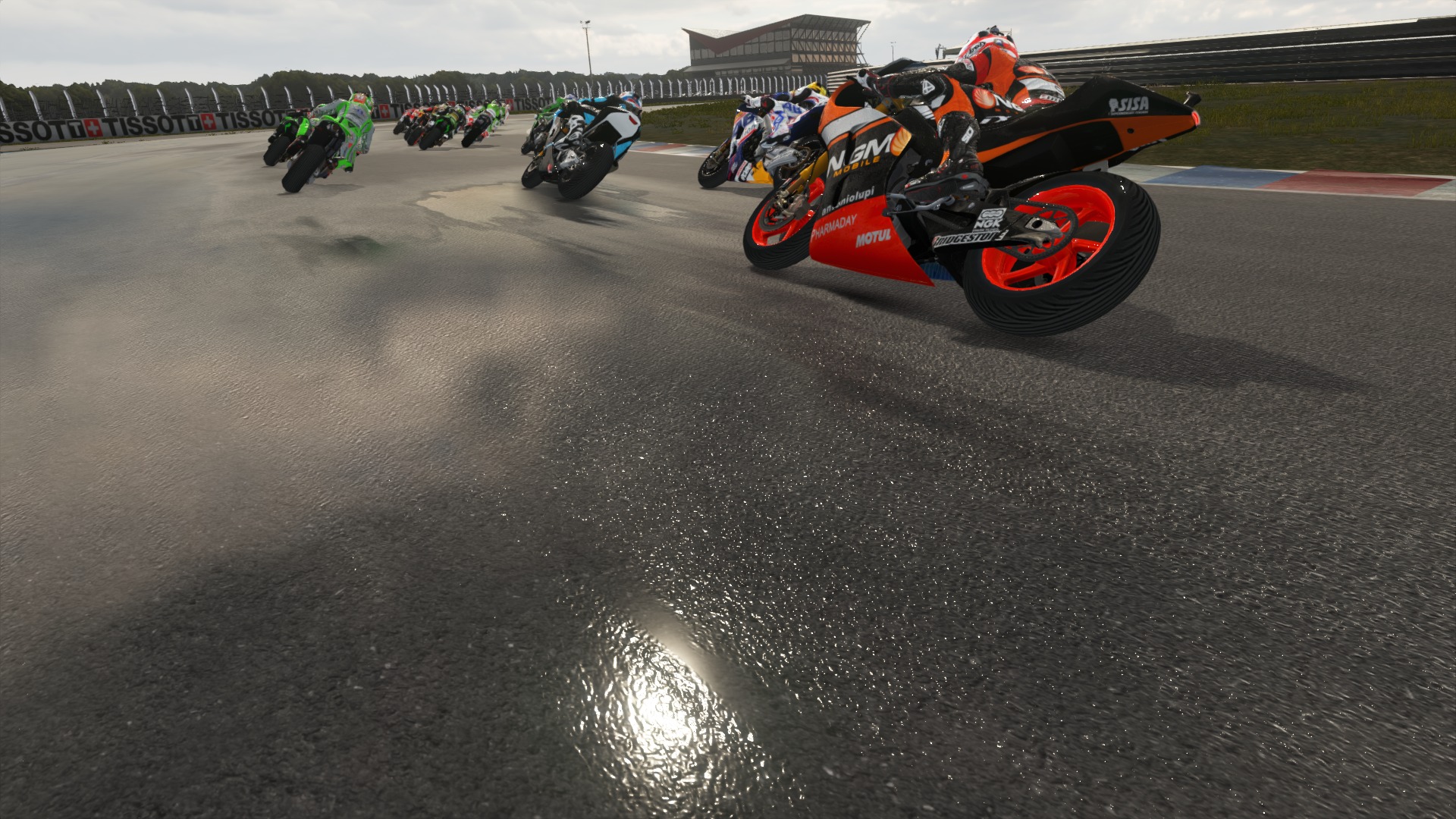 Przejdźmy do strony technicznej. Tutaj najnowsza konsola Sony dała Włochom sporo możliwości do popisu. Milestone przebudowało swój silnik graficzny, dzięki czemu kierowcy, jak i motocykle otrzymali sporą liczbę detali – wyglądają fenomenalnie! Kombinezony, jak i kaski wyglądają jak prawdziwe, a loga sponsorów są w końcu wyraźnie widoczne. Podobnie motocykle; oczywiście w czasie jazdy nie dostrzeżemy wszystkich detali, ale gdy zatrzymamy grę oraz przełączymy się na bardzo dobry tryb fotograficzny i zaczniemy przyglądać się z bliska naszemu motocyklowi, to będziemy pod dużym wrażeniem jego szczegółowości. W tak dynamicznych i szybkich wyścigach, jakimi są MotoGP efekty wizualne i szczegóły środowiska są niedostrzegane, dlatego rezultaty pracy grafików z Milestone możemy zobaczyć głównie na stop klatkach. Milestone nigdy nie słynęło z wysokiej jakości grafiki, jednak na PlayStation 4 obalili ten stereotyp, a ich graficy wykonali kawał dobrej pracy. MotoGP14 to także pierwsza wirtualna podróż na prawdziwe tory wyścigowe. Silverstone, Mugello, Jerez – witajcie na nowej generacji! To, co najważniejsze, czyli asfalt i tarki, prezentują się bardzo dobrze. Ślad zostawiany na torze przez naszą oponę zostaje w danym miejscu do końca wyścigu. Otoczenie wokół toru zawsze było fatalne w grach Milestone. Tym razem i tutaj Włosi dużo pozmieniali, obiekty nie są już tak kanciaste i rozmazane jak w MotoGP. Nie można napisać jeszcze, że obiekty, czy boksy powalają szczegółami, ale jest wyraźny progres względem edycji ubiegłorocznej.