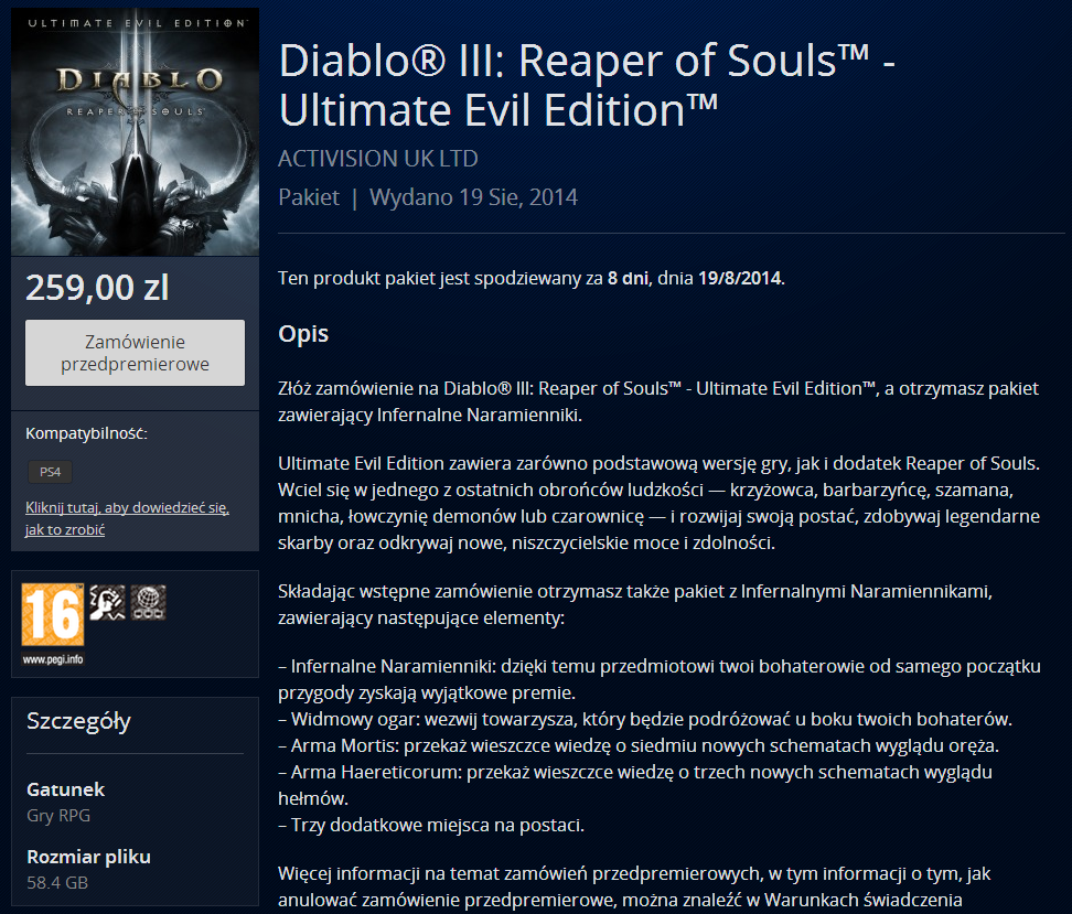Przyglądając się opisowi Diablo III: The Reaper of Souls – Ultimate Evil Edition w wersji na PlayStation 4 w sklepiku Sony, w rubryce rozmiar pliku możemy zobaczyć dosyć sporą wagę gry, która wynosi 58 GB. Dla porównania edycja gry na rynek amerykański wynosi 26 GB, a na meksykański już tylko 20 GB. Ponadto wedle użytkowników słynnego forum NeoGAF wersja europejska ma jeszcze urosnąć do prawie 63 GB.