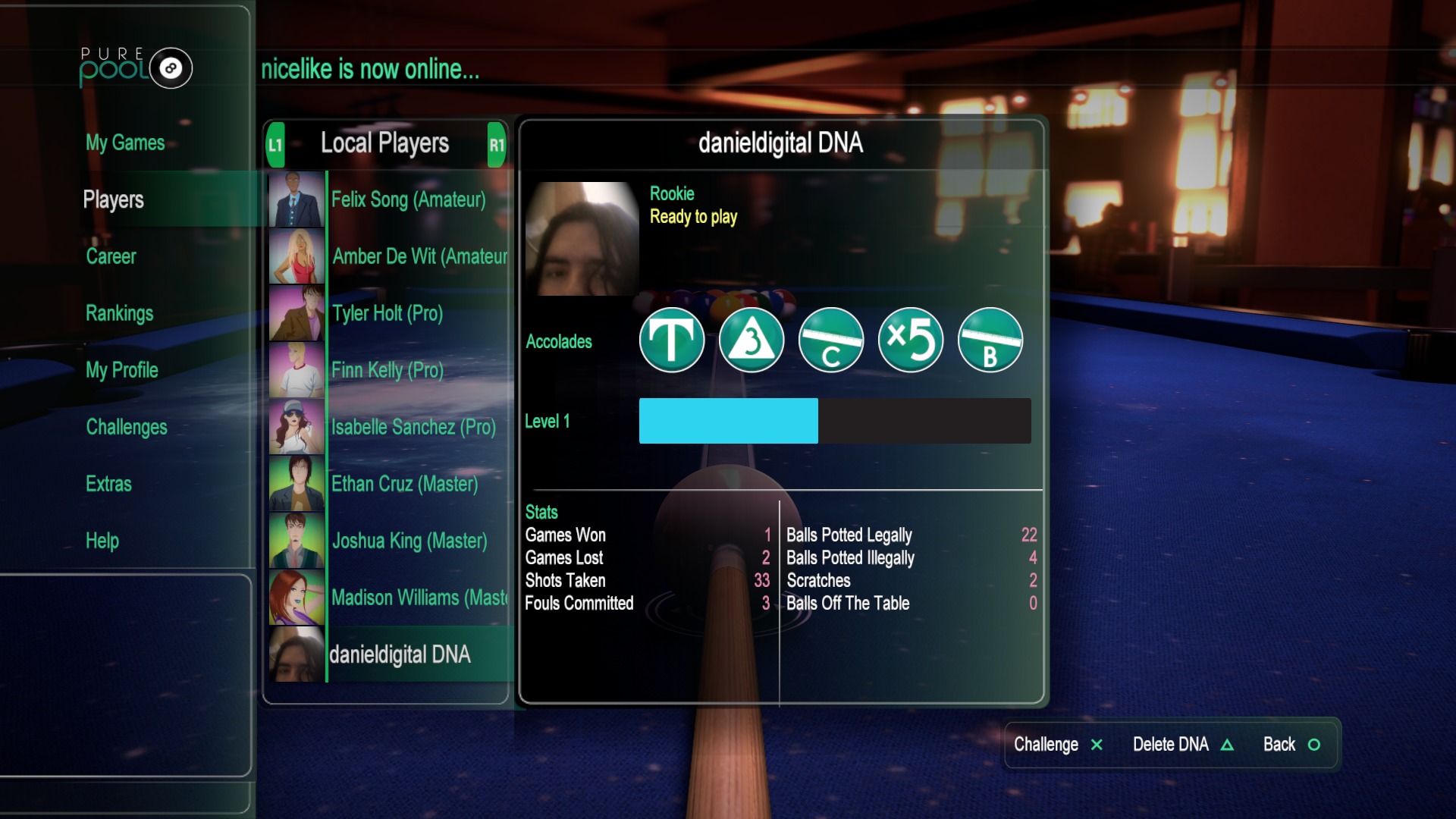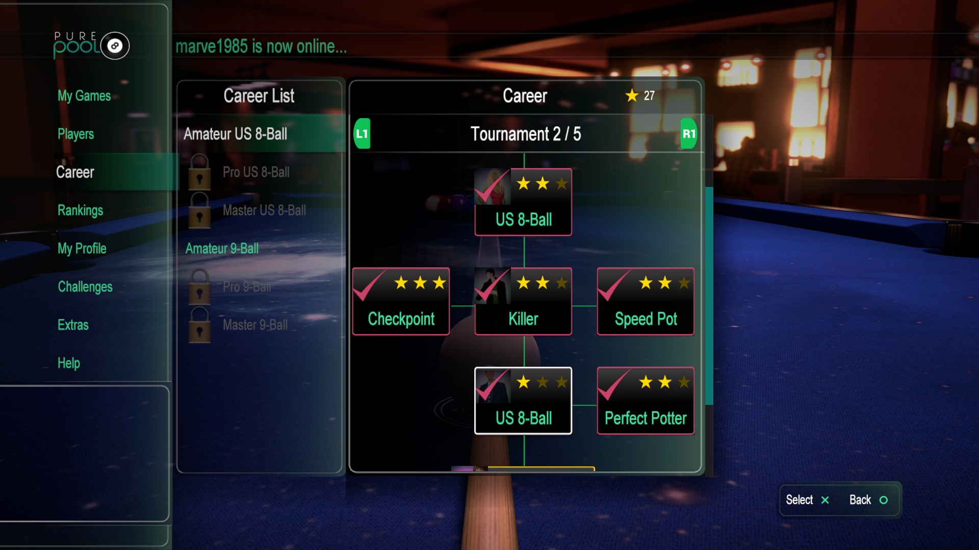 Na koniec zostawiłem tryb kariery, który jest mieszanką wszystkiego, co wyżej opisałem. Kariera dzieli się na dwa rodzaje gry w bilard – wspomnianą ósemkę oraz dziewiątkę. Zaczynamy w ligach amatorskich, a wraz z postępami możemy awansować do ligi Pro oraz finałowej – Master. Możemy równocześnie prowadzić rozgrywki w bilardzie ósemkowym i dziewiątce. Każda klasa rozgrywek dzieli się na pięć turniejów, a każdy z nich to mieszanka meczy z NPC oraz wyzwań.