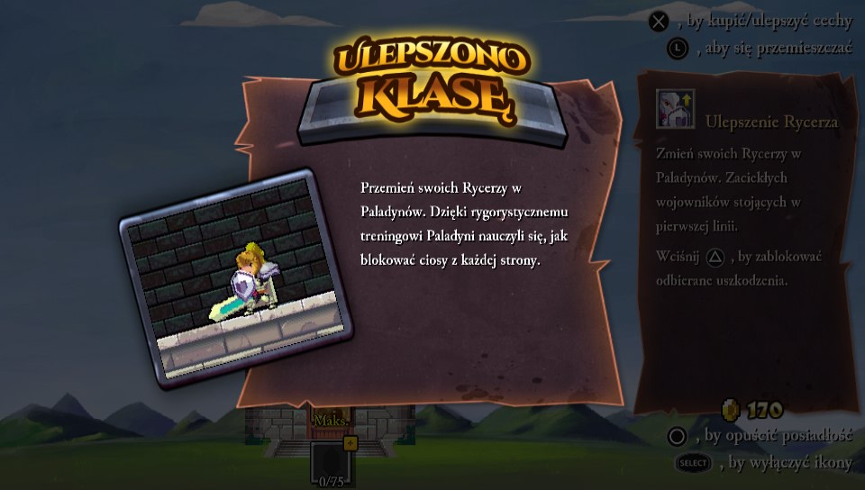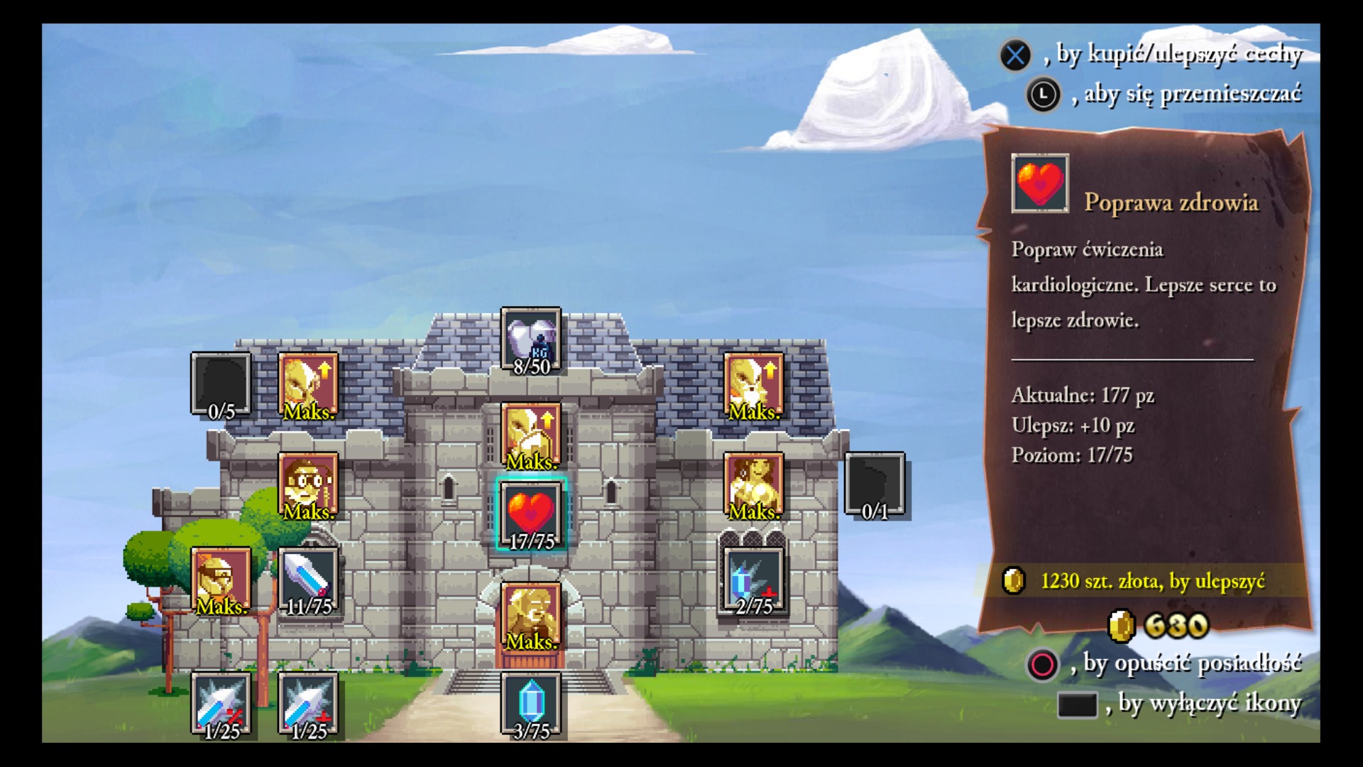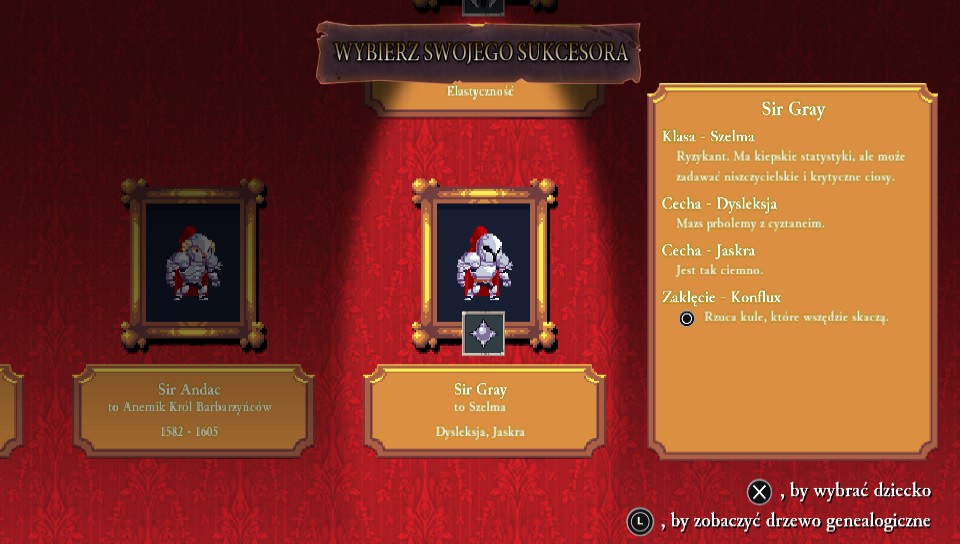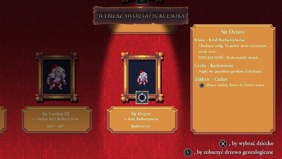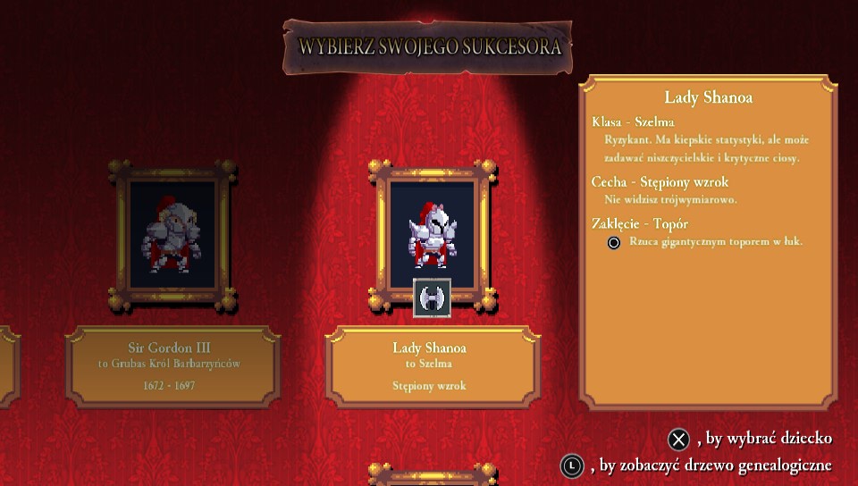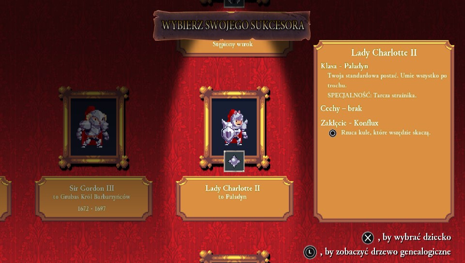Na początek kilka słów właśnie na temat samych wspominanych dziedziców. Stojąc przed wyborem naszego następcy, mamy możliwość przeczytania o nim kilku słów. I tutaj pojawia się ciekawa i komiczna sytuacja. Każde dziecko posiada unikalne cechy, ot, które nie zawsze dobrze wpływają na naszą rozgrywkę. Może to być na przykład gigantyzm, który oznacza, że nasza postać jest sporych rozmiarów, przez co łatwiej nadziać się na kolce. Może się zdarzyć, że nasz bohater jest dalekowidzem bądź krótkowidzem, co z kolei oznacza, że obraz w zasięgu jego wzroku rozmazuje się. Innym przykładem może być choroba układu pokarmowego w przypadku, której protagonista podczas wykonywania skoków puszcza – najprościej to ujmując – bąki. Zastosowanie takiego elementu sprawia, że do całej gry wprowadza się humor, który niewątpliwie pełni tutaj istotną rolę. Warto jeszcze wspomnieć, że podczas wyboru jednego z trzech dziedziców możemy kierować się klasą – profesją jaką dany rycerz prezentuje. I tak może to być między innymi paladyn, barbarzyńca, szelma czy mag. Każda z nich ma w różny sposób zbalansowane życie czyli hp, inną siłę ataku lub też korzysta z innych zdolności.