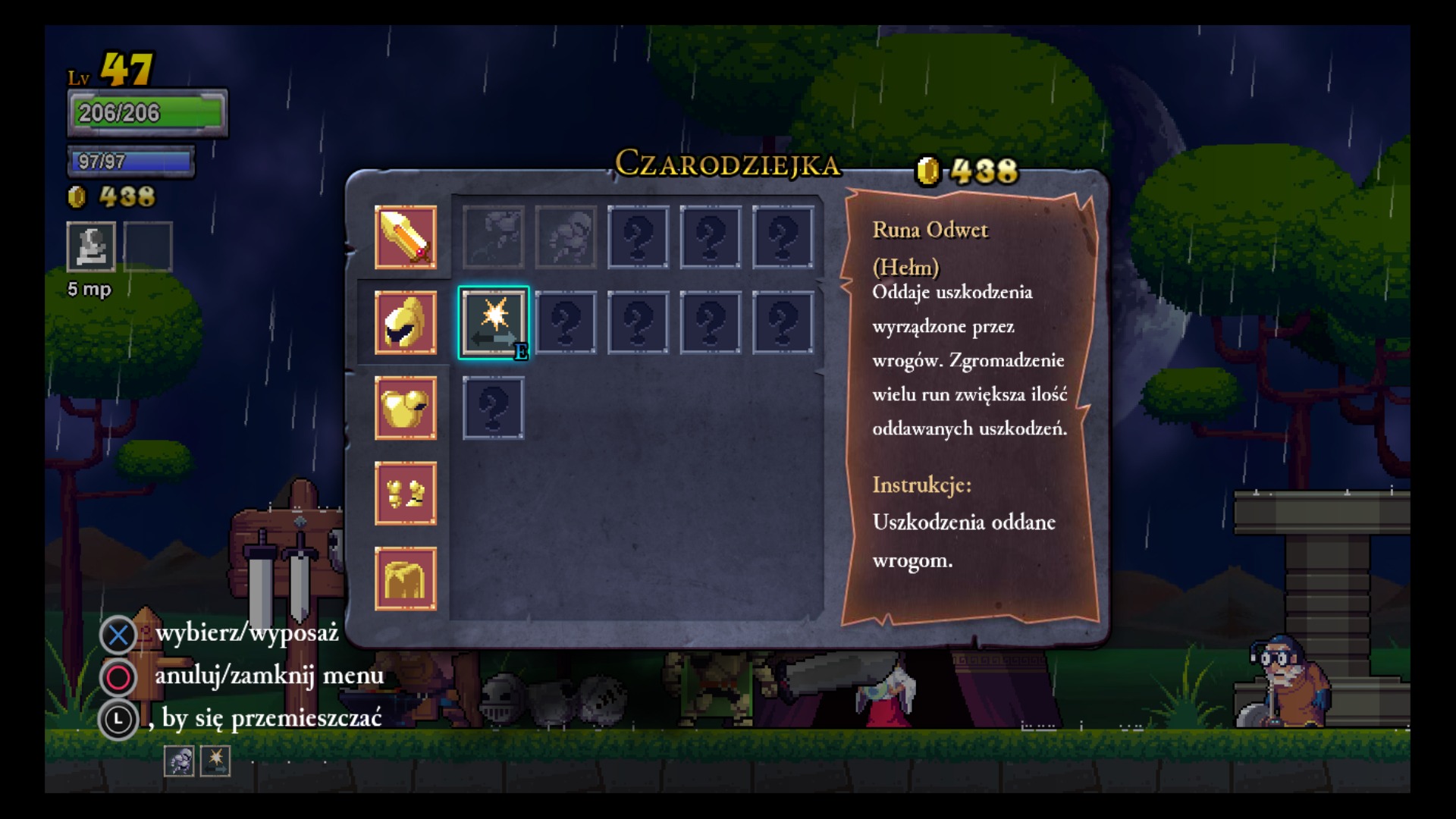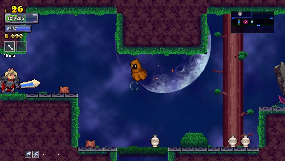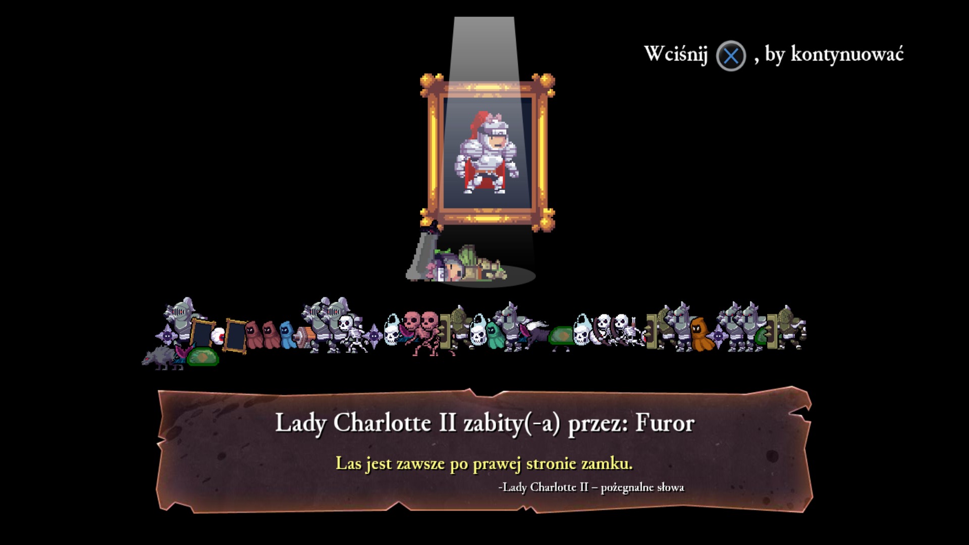 Podsumowując Rogue Legacy, to wspaniała produkcja dla osób lubiących wyzwania, bowiem przejście gry zaczynając od minimalnych statystyk jest wręcz niemożliwe. Trzeba naprawdę wykazać się sporymi zdolnościami, aby to osiągnąć. To, co mi się najbardziej podobało, to brak monotonii, dzięki stale nowym, losowo występującym schematom pomieszczeń zamku. Dzięki temu gra nie nudzi się, a każde nowe starcie, jest naprawdę „nowe”. A więc pomimo towarzyszących nam przez całą grę zgonów, mamy stały element świeżości, a naszym zmaganiom nie towarzyszy myśl „kurczę, znowu muszę zaczynać od początku”. Kolejna wspaniała rzecz to oferowany przez grę cross – save i oczywiście cross – buy. Dzięki temu miałam możliwość sprawdzenia tego tytułu na PlayStation 4 i PlayStation Vita. Mnie osobiście lepiej grało się na konsoli stacjonarnej, ale jej mniejsza siostra równie świetnie się spisuje. Aczkolwiek niektóre elementy są bardzo malutkie i ciężko je dostrzec. I tutaj na przykład lecące łzy puszczane przez oko – jednego ze stworów występujących w grze. Na pytanie zadane na początku recenzji odpowiedzcie sami. Czy wolicie mechanikę gry pochodzącą ze świata ośmiobitowców wraz z towarzyszącą im grafiką czy może po lekkim liftingu