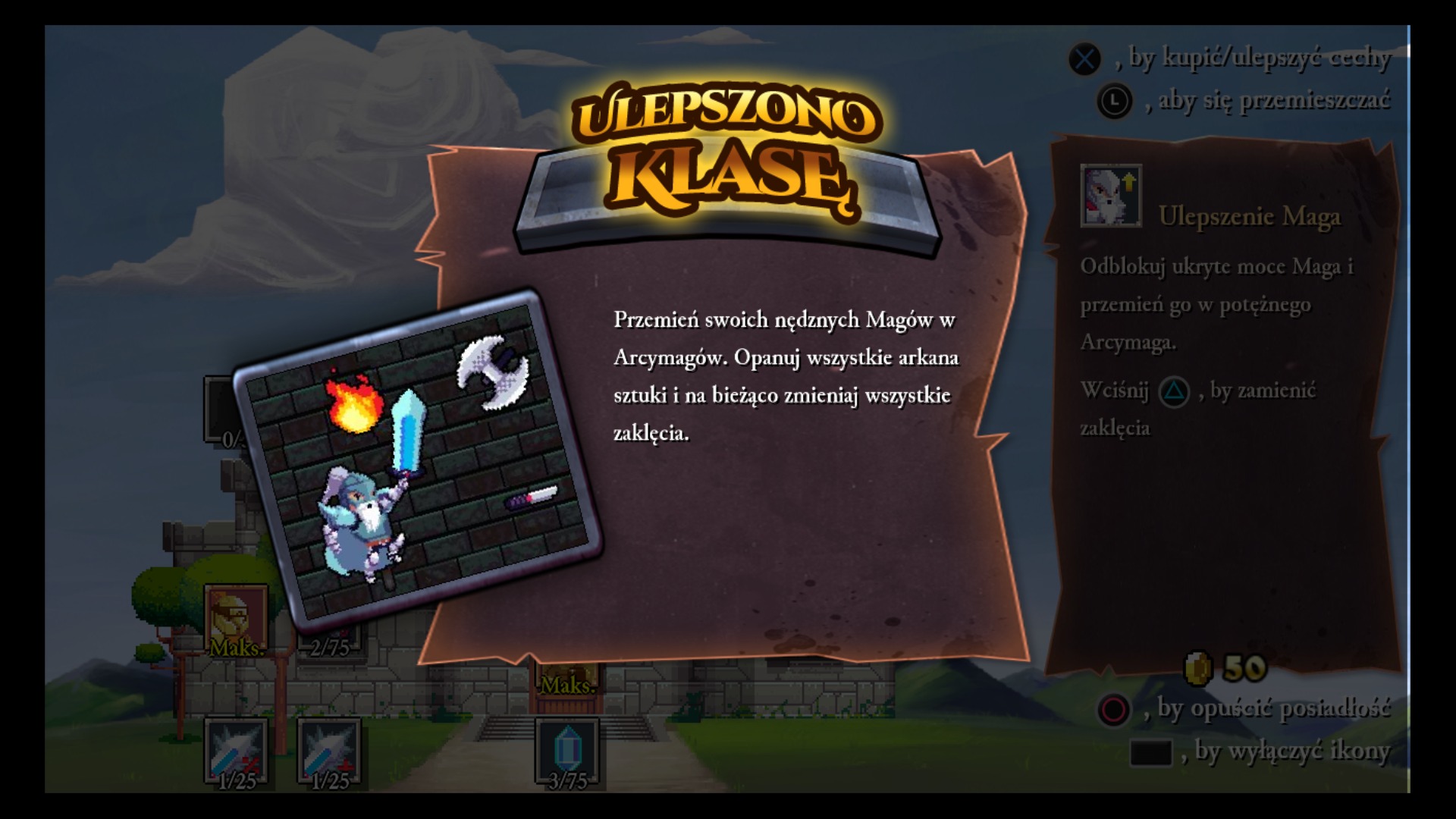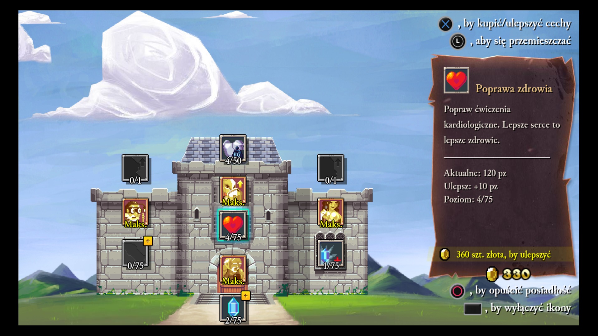 Wspomniałam wcześniej, że zebraną gotówkę możemy wydawać u kowala czy czarodziejki. Jednak to nie wszystko. Zdobyte przez nas złoto możemy także przeznaczyć na rozbudowywanie naszej postaci, nabywanie umiejętności, rozbudowywanie naszej posiadłości – wszystkie te elementy tworzą jedną całość. Każdy punkt dodany w jedną z kilkunastu możliwych statystyk, a właściwie „cech”, bo tak nazywane są w grze oznacza podniesienie naszego poziomu (levela) o jeden w górę. A więc poziom naszej, a raczej naszych postaci zwiększamy nie poprzez zabijanie stworów tylko poprzez przyznawanie kolejnych punktów. I tak w moim przypadku do 30 poziomu, wszystkie moje zmagania były serią zgonów. Dopiero po uzyskaniu 39 lv byłam w stanie pokonać swojego pierwszego bossa, do którego nie było tak łatwo trafić ze względu na stale losowo generowane pomieszczenia zamczyska. Notabene w grze mamy do unicestwienia czterech bossów, rozmieszczonych w czterech różnych częściach zamku. Po drodze, oprócz zwykłych stworów spotykamy także mini bossów, z którymi walka nie jest taka łatwa. To, co mi trochę przeszkadzało, to mała różnorodność wszystkich kreatur. Zdarzało się tak, że potwór, który występował w pierwszych komnatach mając dla przykładu 2 poziom, pojawiał się także później z dużo wyższym, a zmieniała się tylko jego siła.