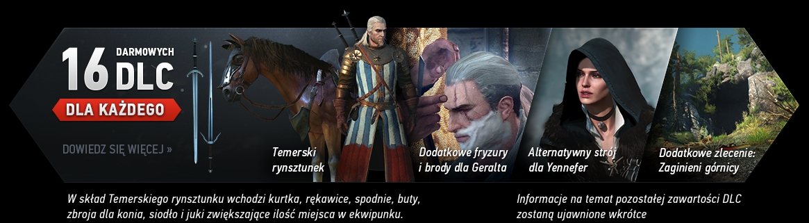 Nadchodzi Wiedźmin 3: Dziki Gon –  nasza największa i najbardziej ambitna gra, a zarazem projekt, który mam nadzieję kojarzą już w tej chwili fani RPG na całym świecie. To nasza okazja, aby pokazać graczom i branży, że można inaczej. Aby podziękować Wam za zakup gry, każdy gracz, niezależnie od wersji gry, tj. platformy czy edycji, otrzyma 16 DLC za darmo. Mamy nadzieję, że te DLC-ki dadzą Wam dodatkową radochę z gry, a zupełnie przy okazji, jeśli ktoś w branży zdecydowałby się postąpić podobnie, to na pewno się nie obrazimy.