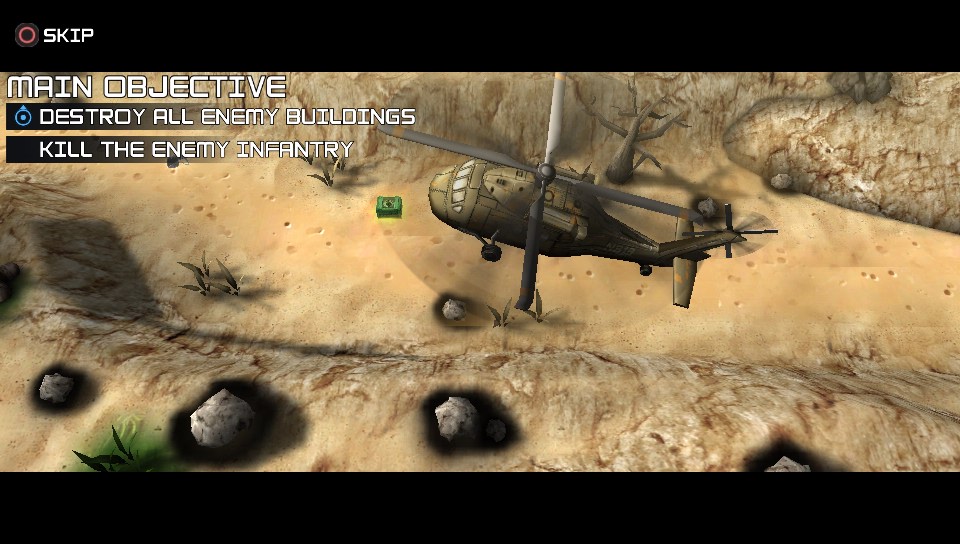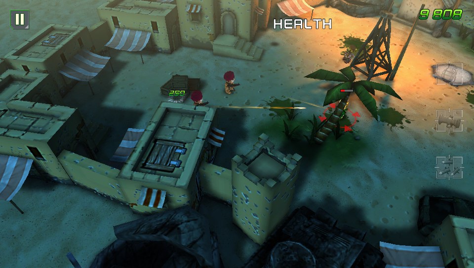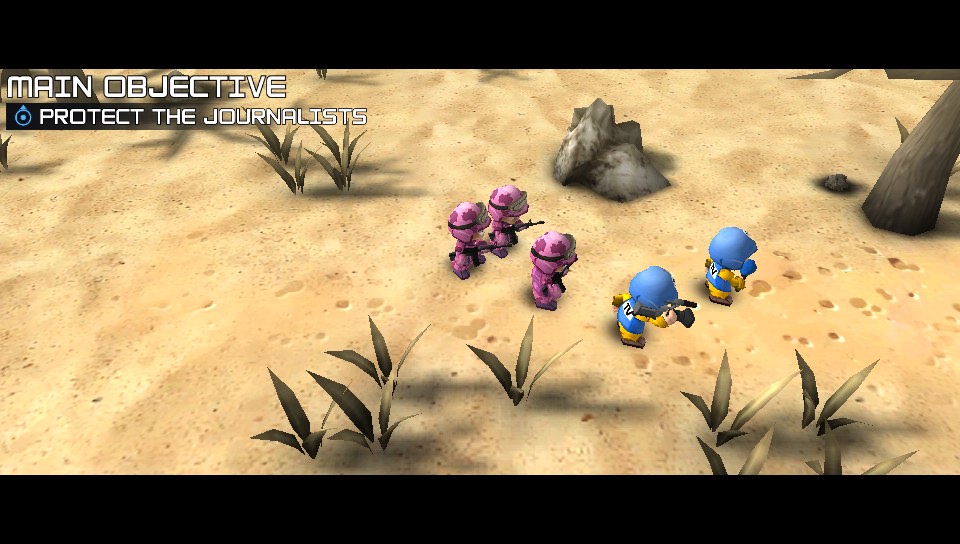 Opisując Tiny Troopers: Joint Ops należy pochwalić sterowanie. Ataki specjalne wykonywane są w bardzo przystępny i prosty sposób – należy przeciągnąć symbol broni w miejsce, w które ma być skierowany atak. Lewa gałka analogowa to ruch, prawa – strzelanie, przesunięcie palcem od góry do dołu ekranu powoduje padnięcie żołnierzy – przydatne przy unikaniu wybuchów.