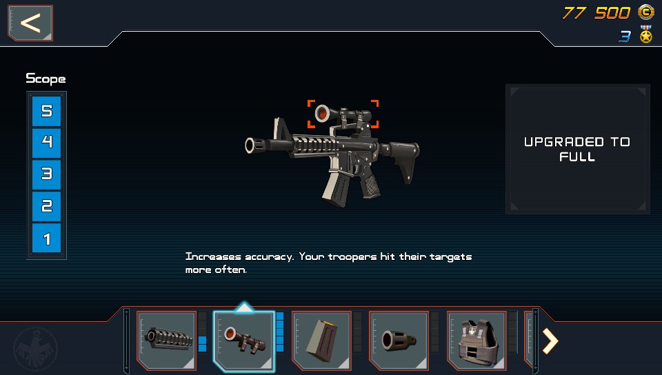 Wspomniane wyżej punkty służą także do odblokowywania lepszych żołnierzy, rozwijania parametrów broni (wśród dostępnych statystyk znajduje się na przykład zasięg ognia, czy szybkostrzelność), postaci (ich wytrzymałość na obrażenia), czy też do wykupywania nowych uniformów. Te, oprócz oczywistych kwestii wizualnych, zapewniają różne premie – więcej punktów za ukończenie misji, rozpoczęcie zadania z większą liczbą granatów i tym podobne.