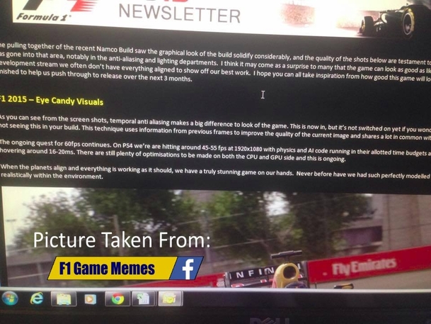 Materiały, które możecie obejrzeć w dalszej części newsa zostały nieoficjalnie zamieszczone na Facebooku, po czym szybko zostały usunięte. Ale jak to zwykle bywa zawsze znajdzie się ktoś kto je zachował i przekazał “światu”. Codemasters wysłał do Eurogamer.net oświadczenie w sprawie wycieku obrazków, w którym informuje, że zdjęcia zostały zaczerpnięte z wewnętrznej poczty elektronicznej, a cała zawartość aktualnie podlega zatwierdzeniu przez Formula One Management i zespoły.