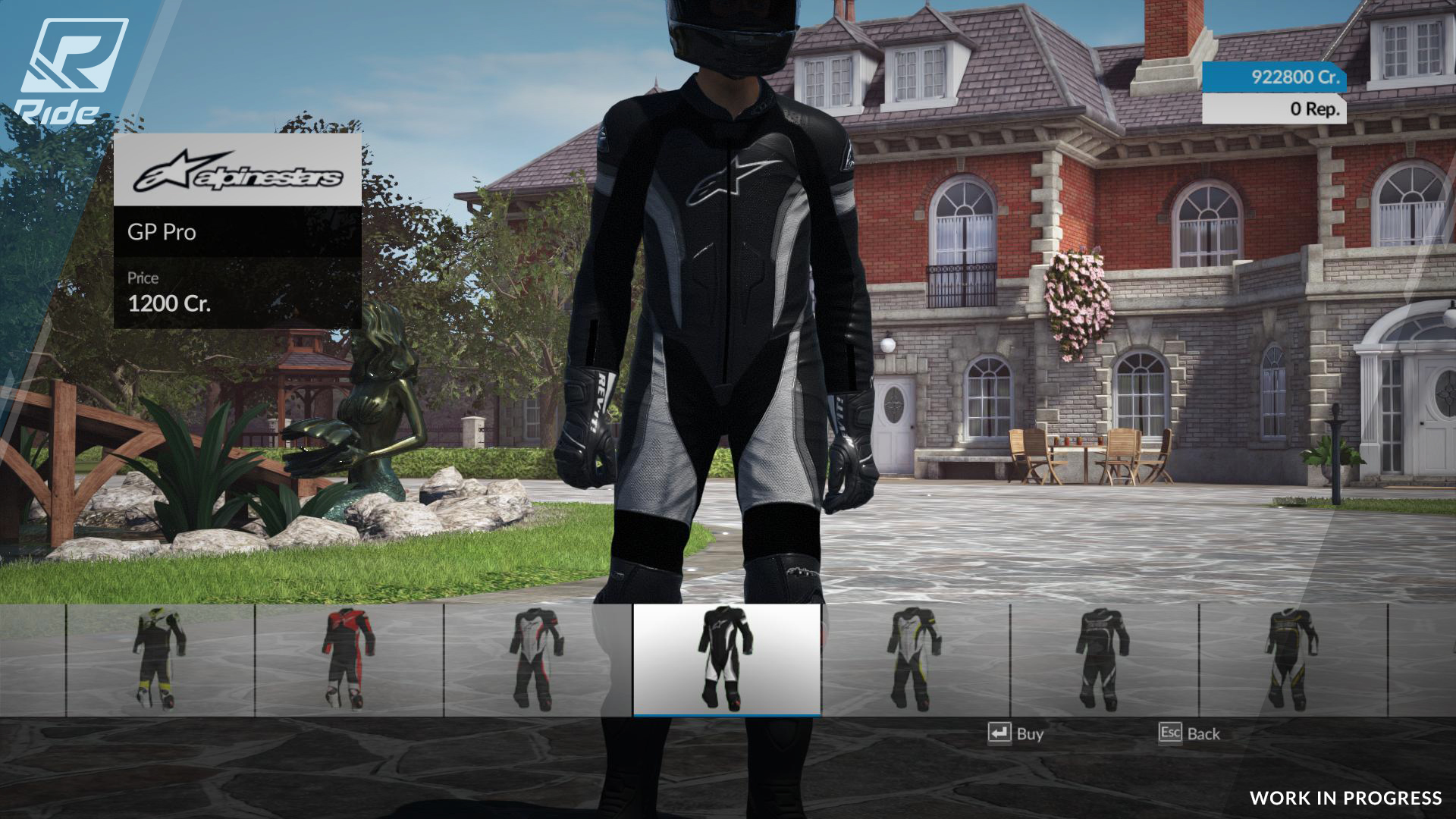 W celu utrzymania, żywiołowego i spontanicznego ducha RIDE i aby zaoferować pełne doświadczenia z gry, wszystkie akcesoria odzieżowe i elementy motorów będą dostępne od razu i będzie można odblokować je poprzez system kredytów (Credits) w grze. Gracze otrzymują je w obu trybach, zarówno online jak i offline.