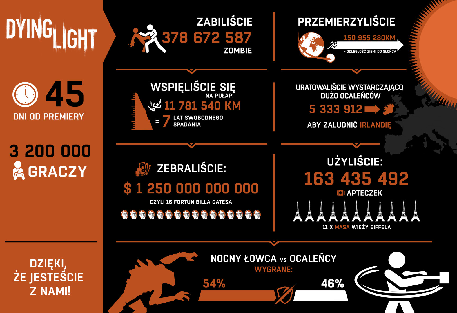 Od czasu swojej premiery Dying Light okupuje najwyższe miejsca na listach najczęściej kupowanych gier na całym świecie. Ostatni tytuł Techlandu o zombie już został numerem 1 na listach bestsellerów w USA, Wielkiej Brytanii, Francji, Polski, Szwecji, Australii i innych, ważnych rynkach na świecie. Dzisiaj Techland ogłosił, że w przeciągu 45 dni od premiery gry, liczba graczy Dying Light osiągnęła poziom 3,200,000 osób. Biorąc pod uwagę wyniki uzyskane w tym samym okresie, Dying Light stał się tym samym najpopularniejszym tytułem w historii firmy.