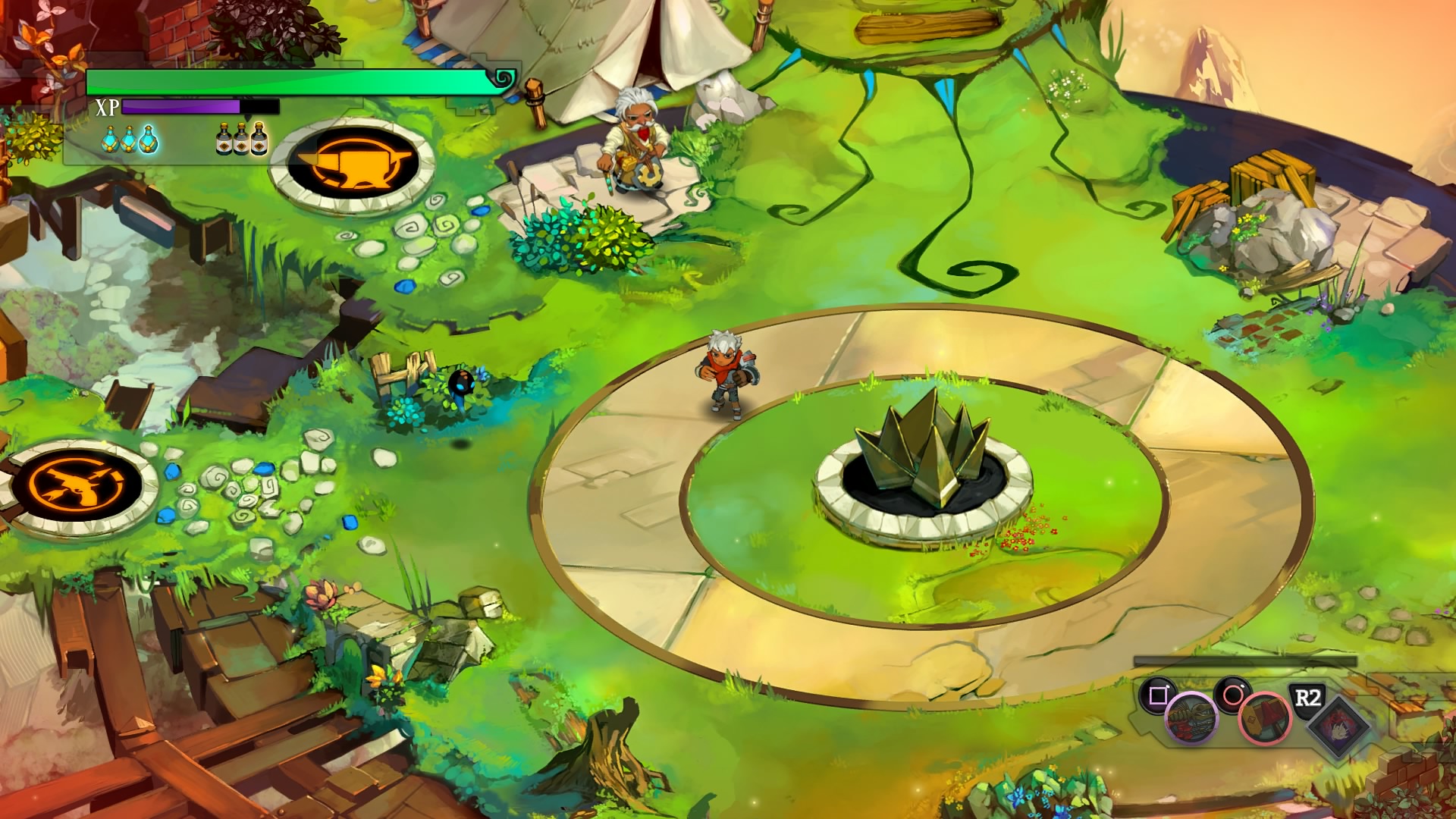 Największą i podstawową cechą odróżniającą Bastion od nowszej produkcji studia Supergiant Games jest system walki. Potyczki mogą być prowadzone jedynie w czasie rzeczywistym, nie mamy tutaj aktywnej pauzy czy trybu planowania. Rozgrywka jest bardzo podobna do innych gier z gatunku action RPG czy hack’n’slash. Do dyspozycji otrzymujemy zestaw broni na bliski oraz daleki zasięg. Jednocześnie możemy posiadać jedną białą i dystansową broń oraz umiejętność specjalną. Oczywiście oręż oraz umiejętności odblokowują się wraz z postępem w fabule. Na samym początku mamy jedynie dostęp do łuku, młota oraz jednej umiejętności. Dzięki takiemu zabiegowi nie musimy od samego startu martwić się co założyć, aby jak najskuteczniej radzić sobie na kolejnych poziomach.