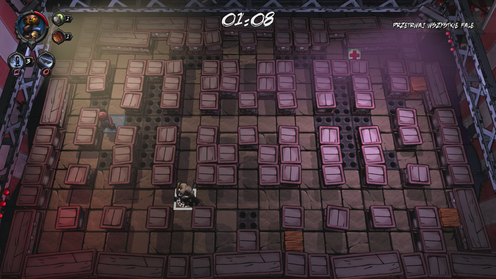 Zdecydowania największą zaletą BRAWL jest różnorodność postaci. Mam tu na myśli nie tylko ich wygląd, bo każda z ośmiu postaci wygląda zupełnie inaczej, ale też ich umiejętności. Każdy zawodnik ma zestaw dwóch umiejętności. Jedna regeneruje się sama po określonym czasie, kolejna wymaga zebrania odpowiedniego dopalacza. To właśnie ta różnorodność sprawia, że każda postać jest inna i każdą gra się zupełnie inaczej. Smutny Klaun potrafi kichnięciem odepchnąć bombę, a Zapaśniczka uderzeniem ogłuszyć wszystko dookoła. Warto pograć chwilę każdą postacią aby sprawdzić, która nam najbardziej pasuje.