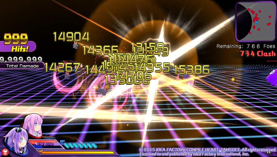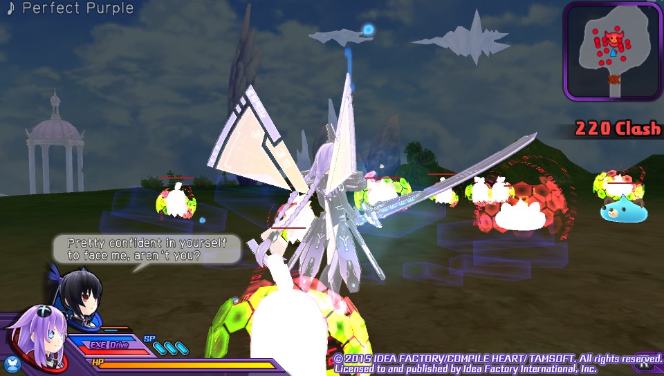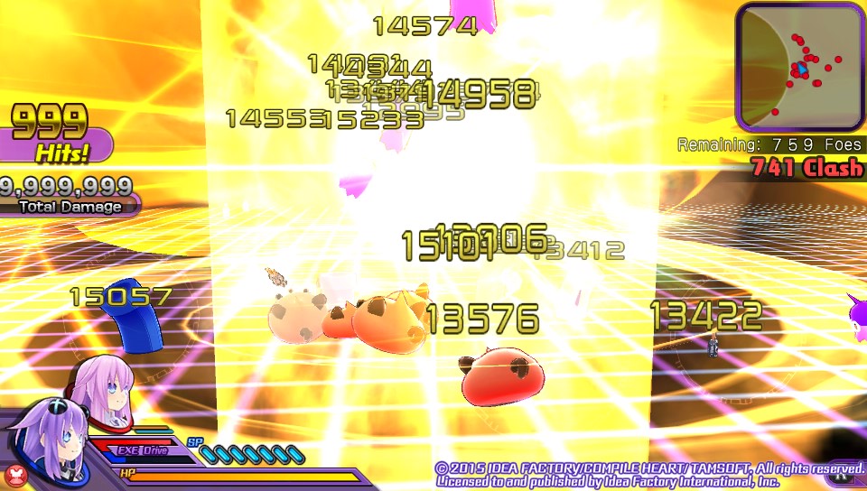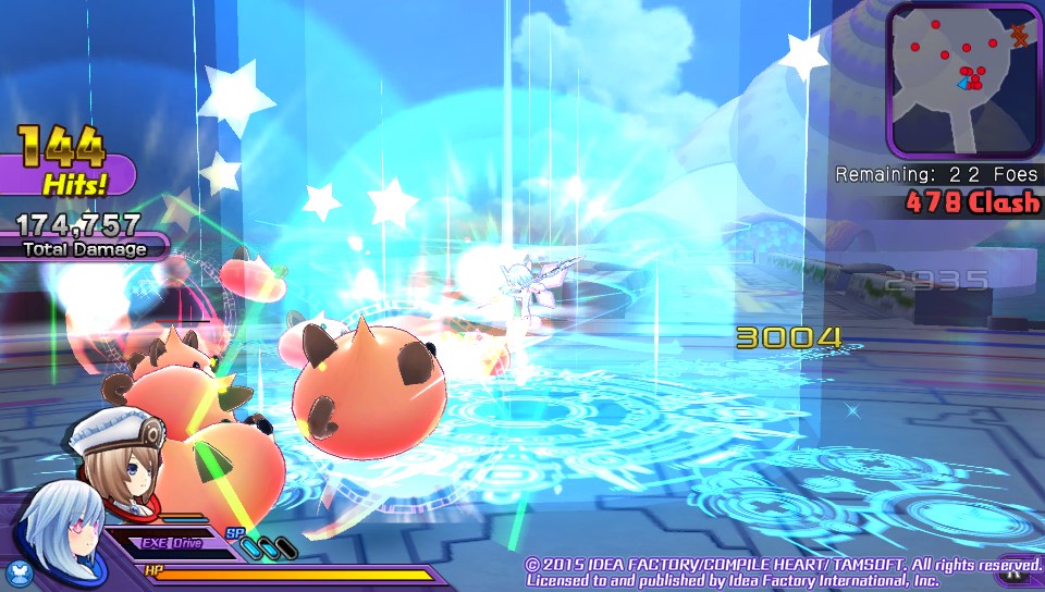 Po przebrnięciu przez tony pogaduszek wreszcie rozpoczęła się jakaś akcja. Nastawiłem się na walki w turach rozgrywanych na arenach. Ku mojemu zdziwieniu okazało się, że są one w czasie rzeczywistym. Normalny hack&slash w cukierkowej oprawie graficznej z absurdalnymi kombosami i punktami obrażeń. Mimo zaskoczenia walka przypadła mi do gustu. Jest szybka i dynamiczna. Posiadamy umiejętności, których używamy po naładowaniu odpowiedniej ilości małych niebieskich pasków (SP). Istnieje również możliwość transformacji naszych wojowniczek. Po przemianie nasza wojowniczka staje się prawdziwą maszynką do zabijania. Do dyspozycji mamy zwykłe ciosy i kilka kombosów, natomiast po naładowaniu specjalnego powera (Exe Drive) i wykonaniu kombinacji klawiszy, aktywujemy specjalny atak, który potrafi zabrać absurdalne obrażenia (nawet 9,999,999 punktów!). Wszystkie te umiejętności ładujemy podczas walki z przeciwnikami.