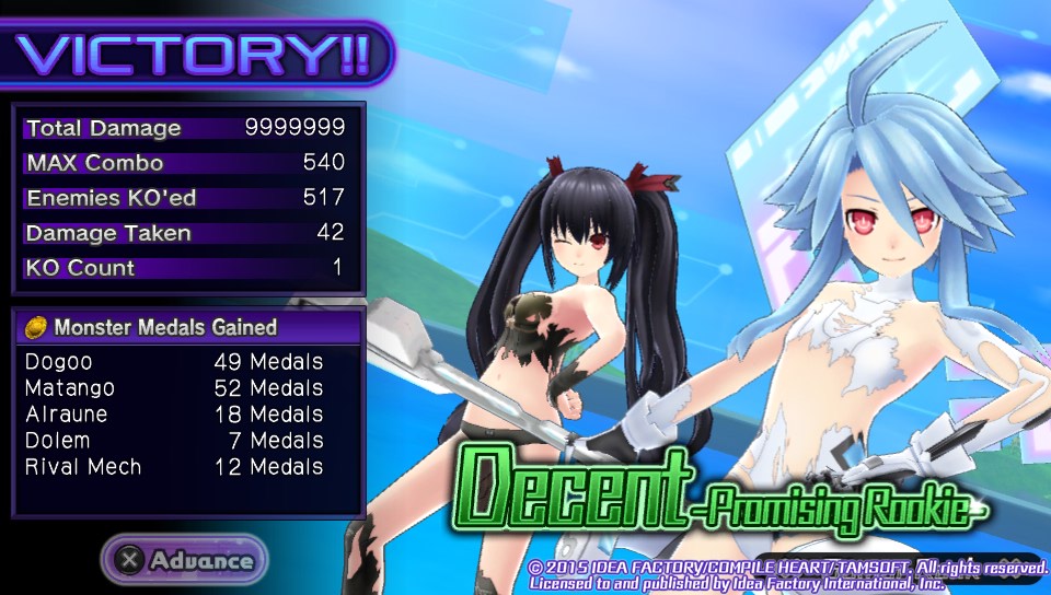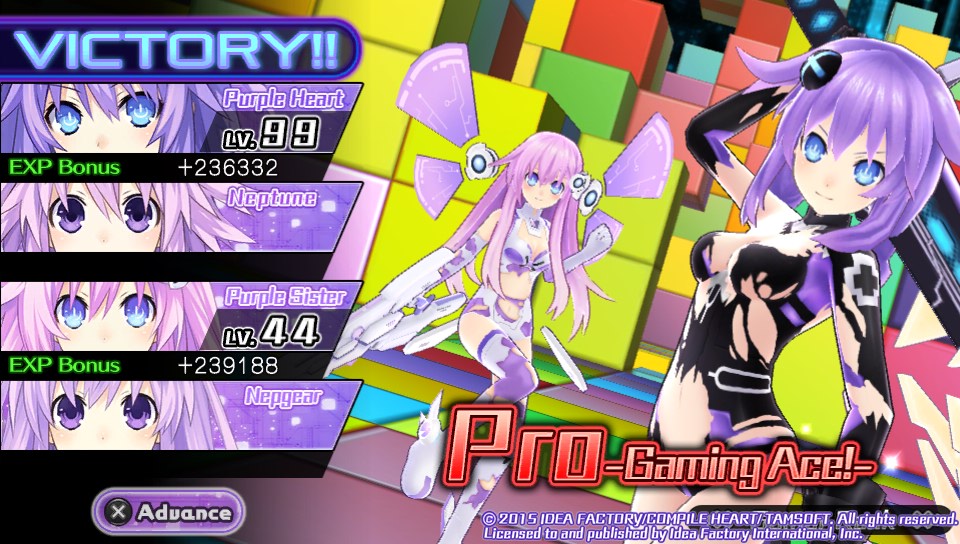 O rozwoju postaci nie ma co się rozpisywać, bo jest bardzo prosty. Walcząc, zdobywamy doświadczenie i wbijamy poziomy. Zbieramy też monety z zabitych potworków, które następnie wydajemy na dopalacze dla naszych postaci. Gra oferuje też inne tryby gry oprócz fabularnego (niedostępne opcje w menu głównym, o których wspomniałem na początku): Gamadustri Gauntlet (dostępny po ukończeniu wątku fabularnego) – są to walki turniejowe między bohaterkami oraz Naptral Tower (po ukończeniu Gamadustri Gauntlet) – wielopoziomowa wieża z masą mocnych przeciwników do wycięcia.