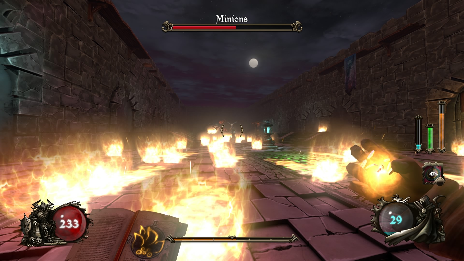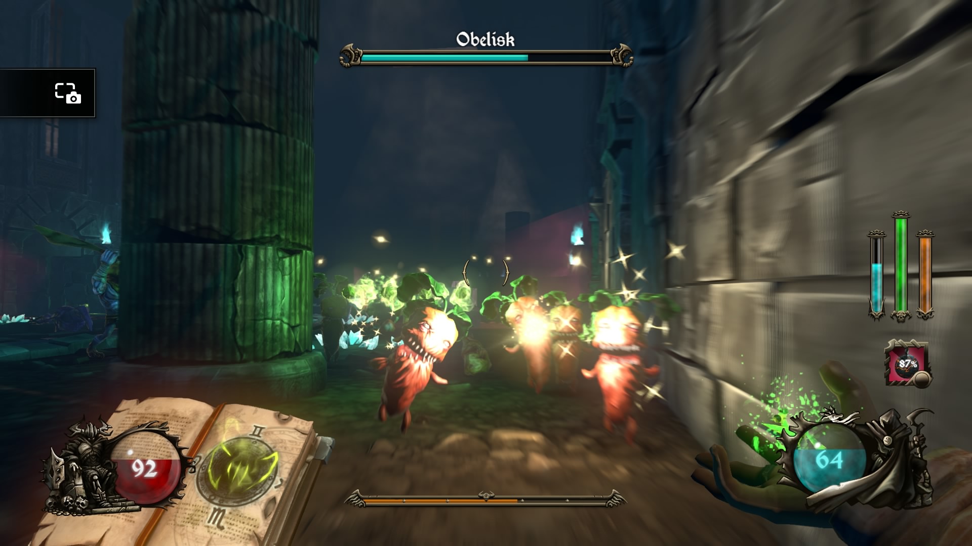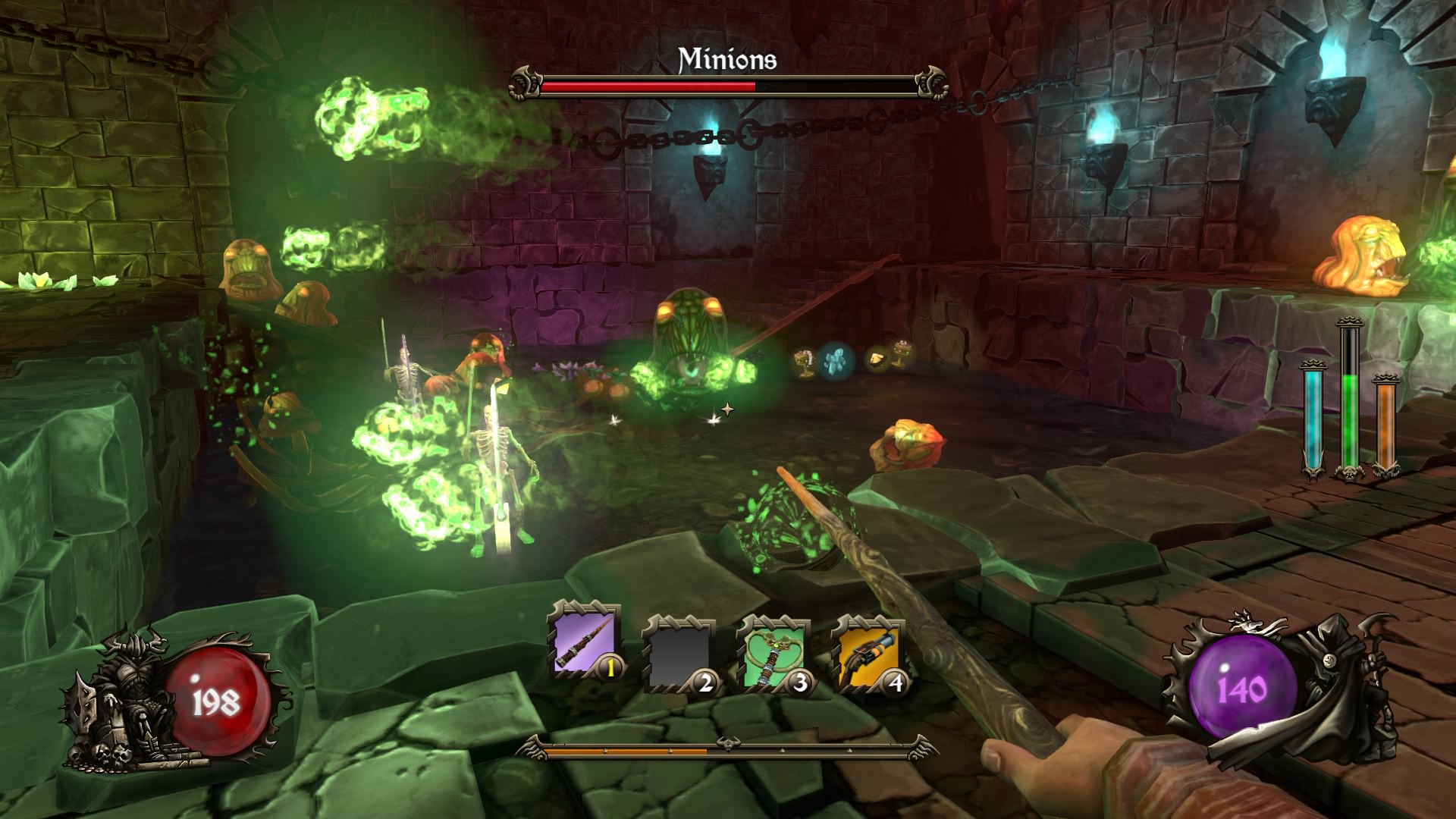 W grze mamy widok z pierwszej osoby, każdy level zaczynamy z podstawową różdżką w ręku, którą możemy jak każdą inną bronią strzelać na dwa różne sposoby. Niestety ogranicza się to najczęściej do strzelania pojedynczymi pociskami w podstawowym ataku i kilkoma jednocześnie w alternatywnym. Wspomnień z Unreal Tournament to nie przywołuje, a tylko kilka broni ma ciekawszy drugi atak. Na początku każdego starcia lądujemy na arenie z ograniczonymi możliwościami naszego czarodzieja i przechodząc kolejne pokoje, pokonujemy wrogów za zabicie których dostajemy doświadczenie. Z kolei za doświadczenie dostajemy do wyboru perki ulepszające naszą postać. I tu zaczyna się głębia tego tytułu, bo perków zmieniających naszą postać jest od groma. Wpływają one na nasze zdrowie, szybkość strzałów, przyciąganie znajdziek przez naszego maga, skrócenie paska życia kosztem many i prawie setka innych. Dodatkowo nasza postać może korzystać poza podstawową różdżką z ksiąg z zaklęciami, czarodziejskich lasek i ostatniej grupy broni czyli pistoletów, kusz, granatów – w dużym uproszczeniu z broni palnych. Każda z broni ma własną manę i o ile podstawowa do różdżki regeneruje się sama to już do pozostałych trzech musimy ją zbierać z poległych przeciwników i zniszczalnego otoczenia.