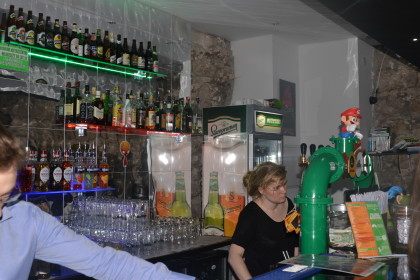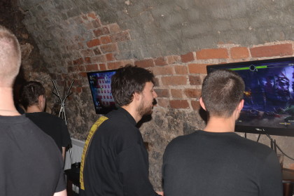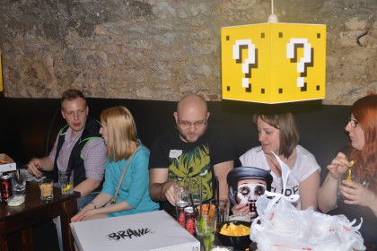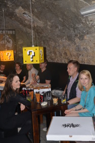 Miejsce podzielone jest na kilka mniejszych pokojów, większą salę i bar. Można było więc spokojnie usiąść przy drinku i podyskutować z deweloperami, spróbować swoich sił w jakąś bijatykę albo grę planszową czy złapać za pady razem z trójką pozostałych graczy i na rzutniku rozwieszonym na ścianie sprawdzić premierowy tytuł Bloober Team. Dobrze było. Mim, dobre drinki, świetni ludzie i możliwość pogadania z ekipą odpowiedzialną za Brawla.