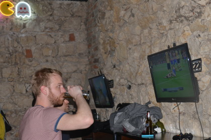 Cybermachina to fajny lokal. Game pub. Pomijając brak zasięgu w głównej części lokalu, reszta sprawdza się równie dobrze jak warszawskie lokale dla graczy, do których ja osobiście jestem bardziej przyzwyczajony. Można wpaść, złapać jedno piwko, pograć w Guitar Hero, Fifę czy jakieś bijatyki. Tym razem większość sięgała po drinki nazwane od bohaterów gry i siadali do Brawla.