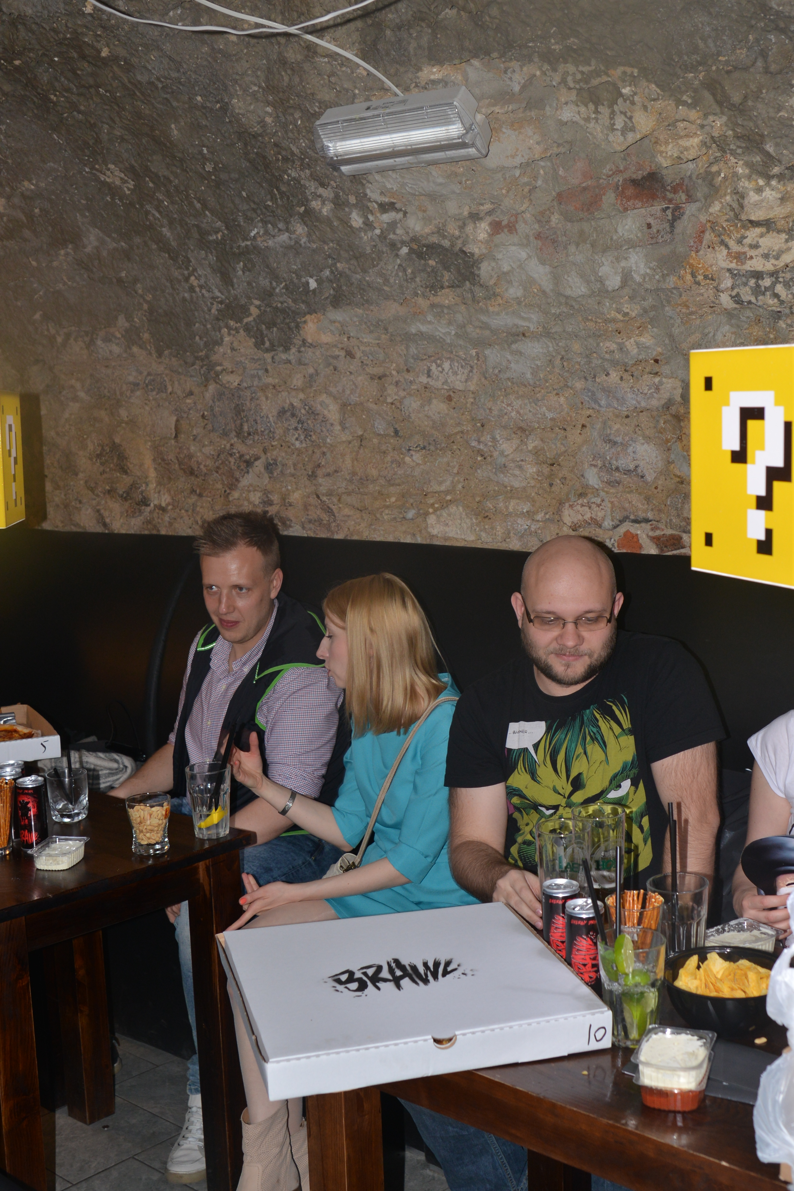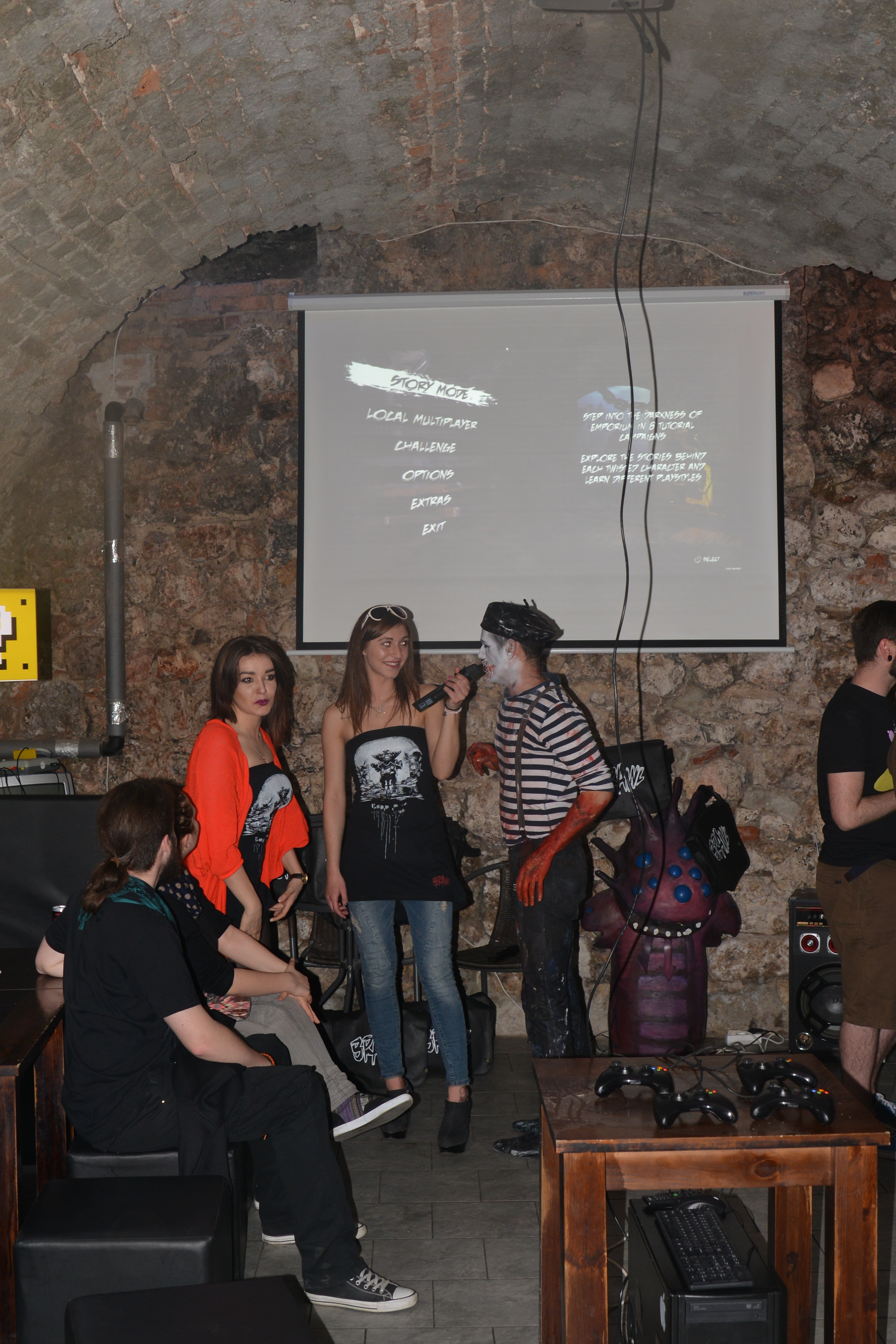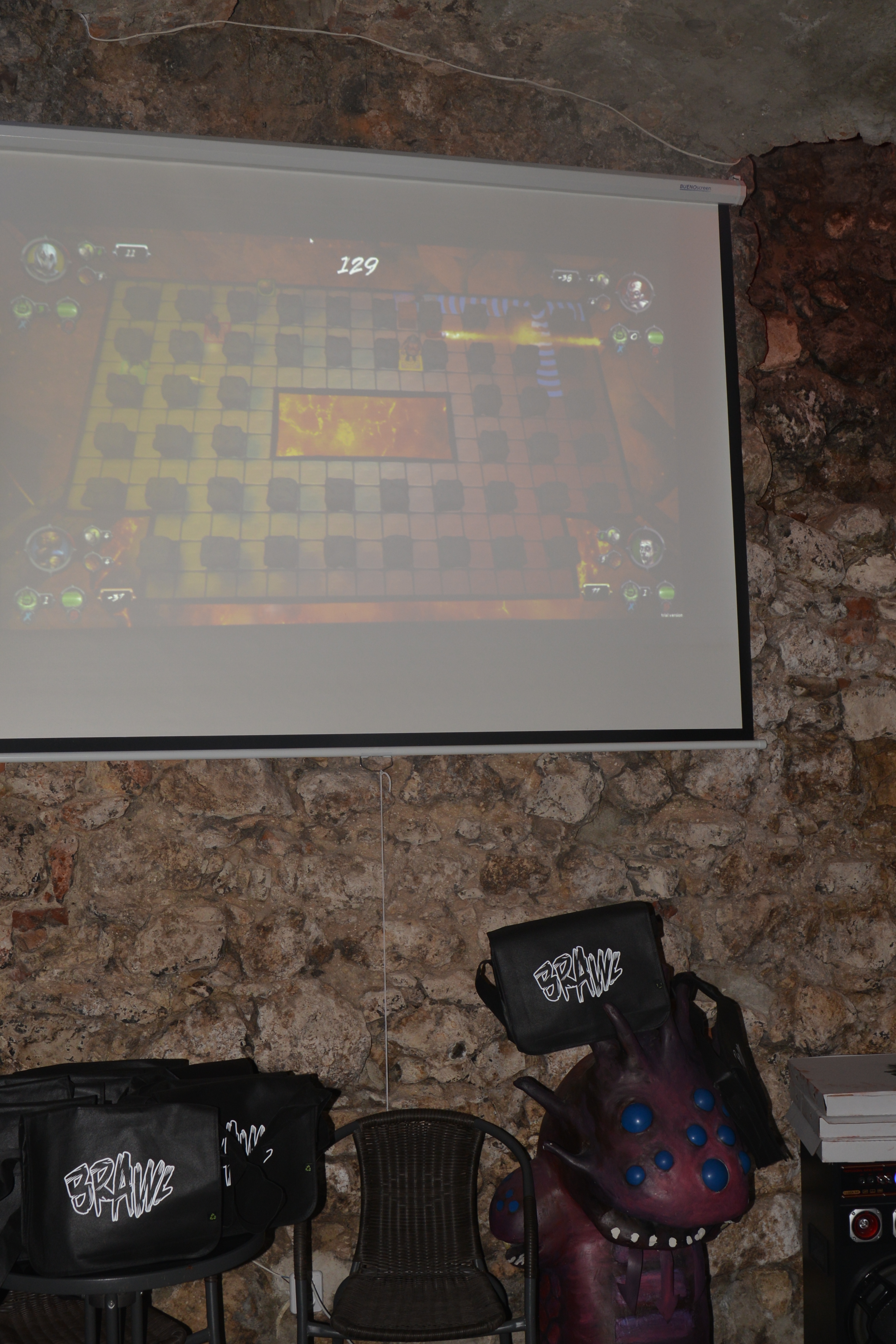 Miejsce podzielone jest na kilka mniejszych pokojów, większą salę i bar. Można było więc spokojnie usiąść przy drinku i podyskutować z deweloperami, spróbować swoich sił w jakąś bijatykę albo grę planszową czy złapać za pady razem z trójką pozostałych graczy i na rzutniku rozwieszonym na ścianie sprawdzić premierowy tytuł Bloober Team. Dobrze było. Mim, dobre drinki, świetni ludzie i możliwość pogadania z ekipą odpowiedzialną za Brawla.