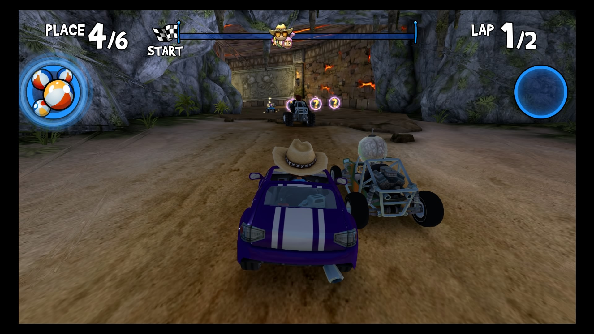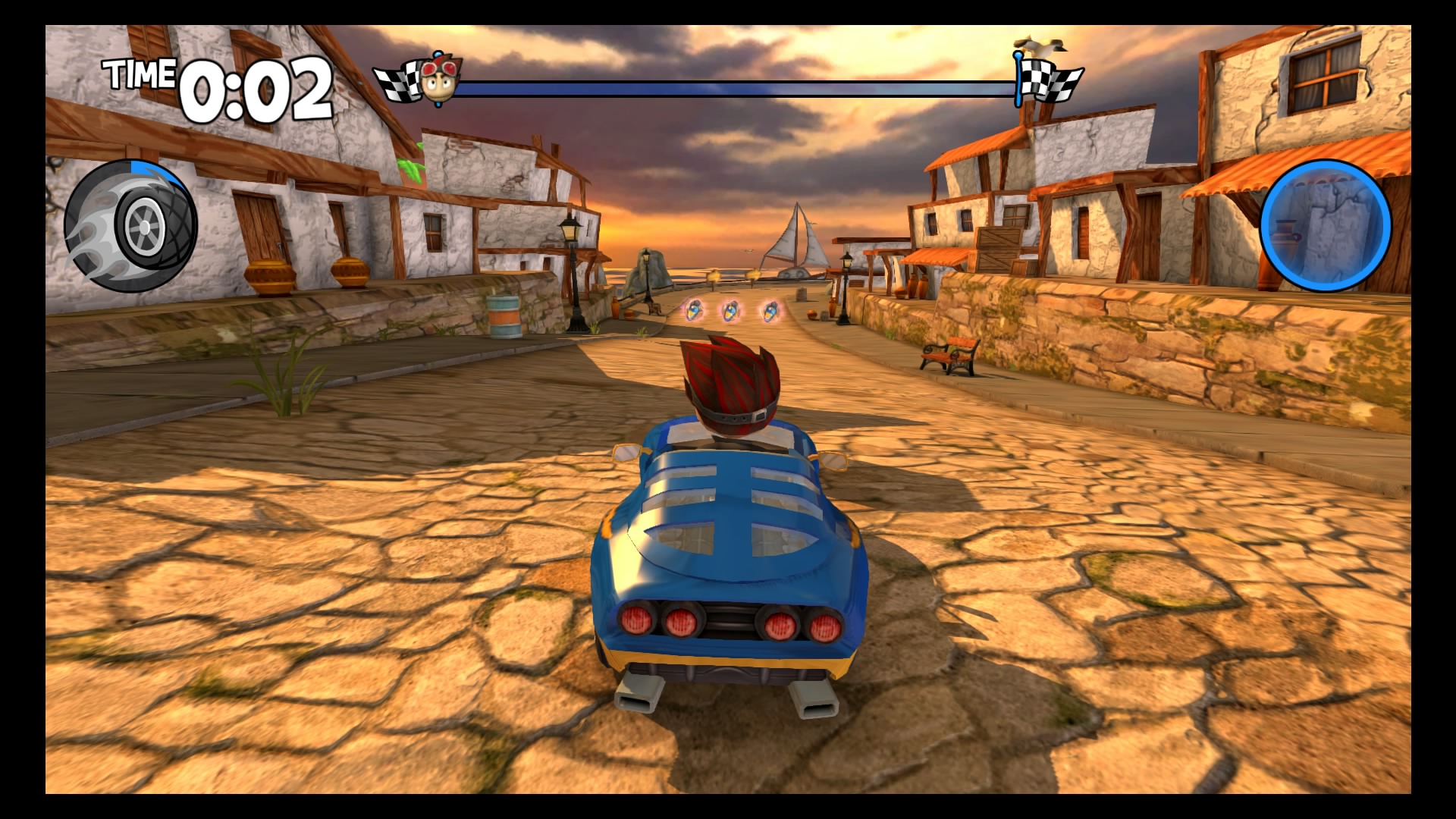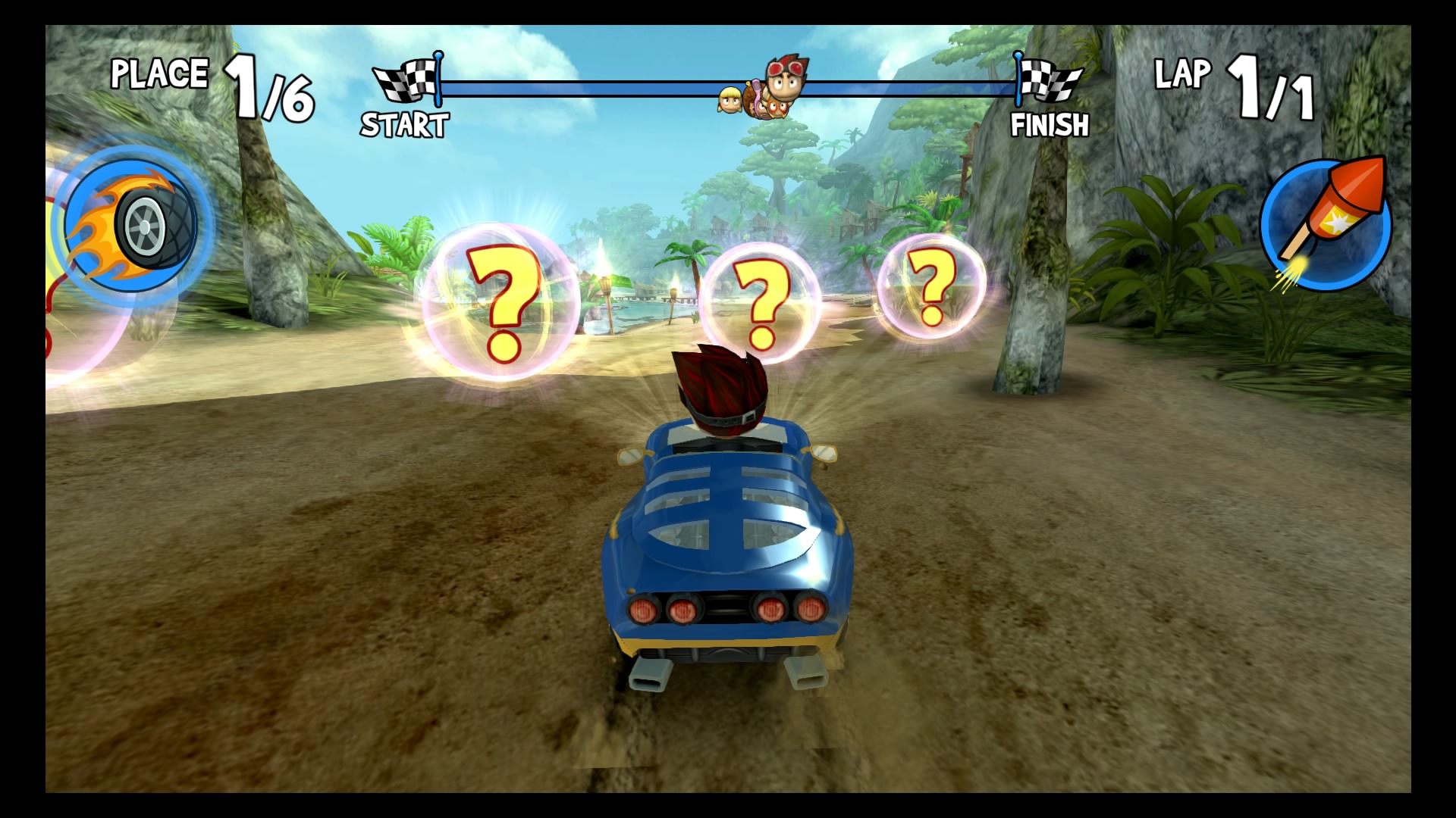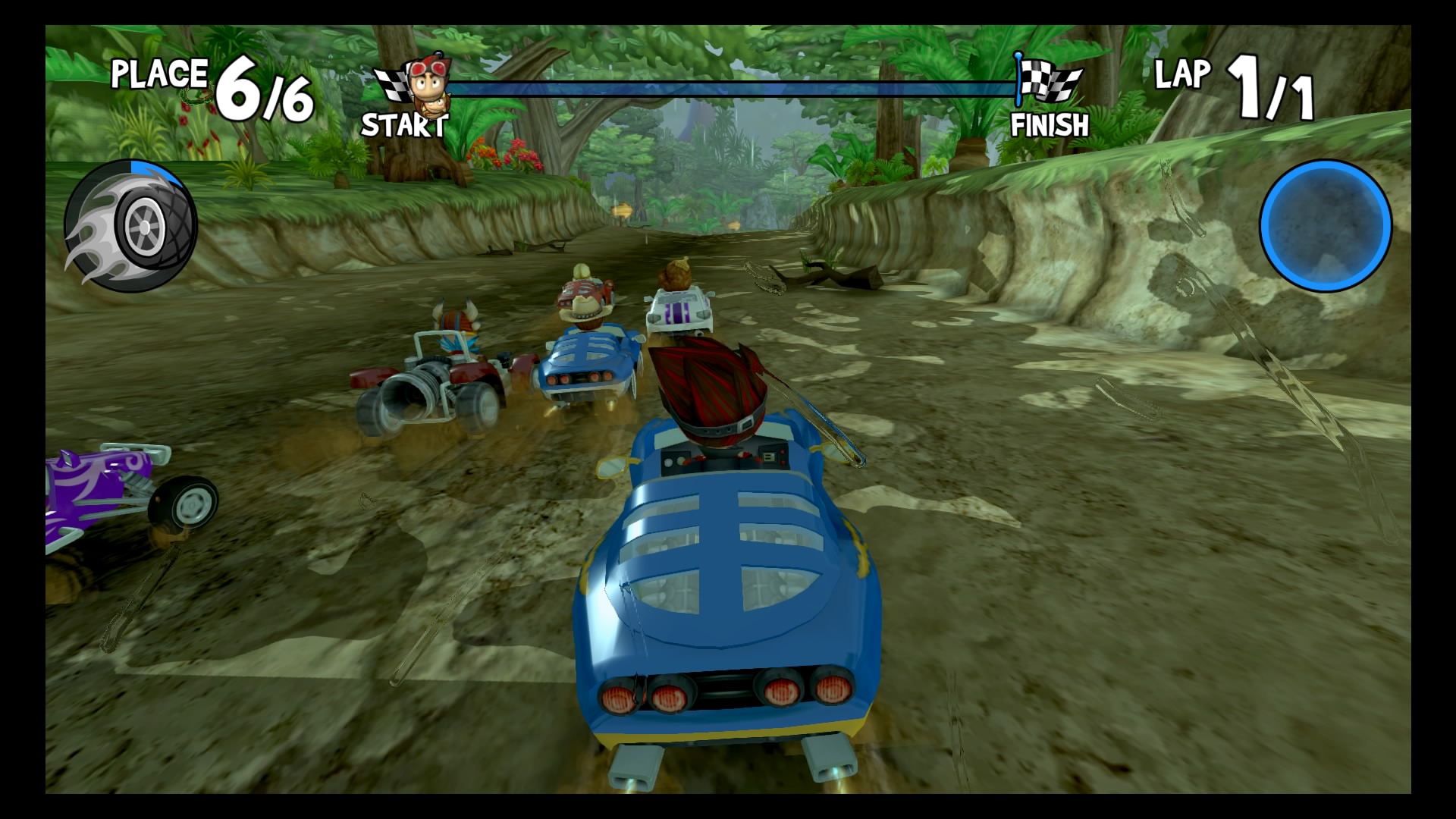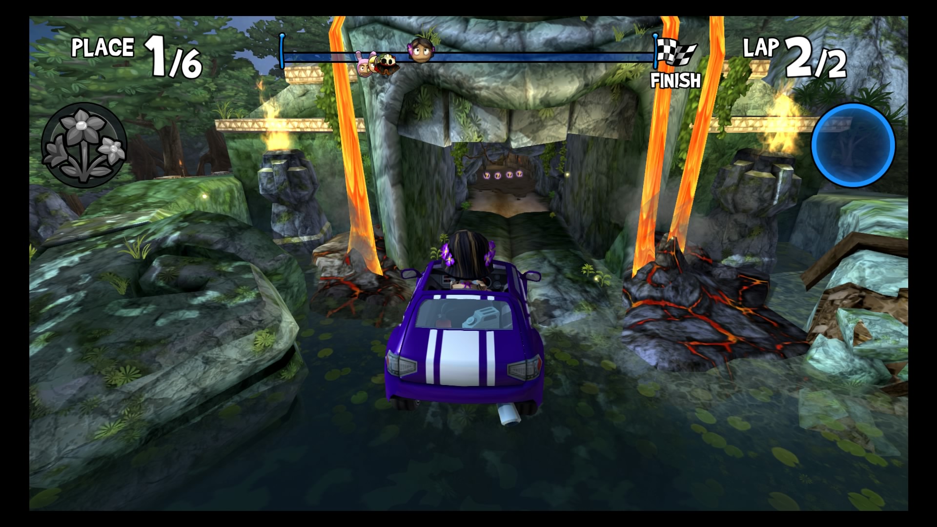 W trybie kariery wybieramy swój upragniony pojazd (Lambini jest naprawdę super!), kierowcę i możemy ruszać na podbój malowniczych krajobrazów. Do dyspozycji mamy kilka lokacji począwszy od dżungli, przez wulkan i lodowce, aż po stare ruiny. W wyścigach bierze udział łącznie 6 kierowców. Naszym zadaniem jest pokonanie całej piątki uczestników, co tylko z pozoru wydaje się łatwe. Złudne są nadzieje tych, którzy uważają, że śmigną do samej mety na jednym gazie. Nasi rywale są naprawdę szybcy, sprytni i co najważniejsze sprawnie używają wspomagaczy. Otóż na naszej drodze, co kilka kilometrów znajdują się bąbelki ze znakami zapytania. Dzięki zebraniu takiego bąbelka zostaje nam losowo przydzielony power-up, wśród których znajdą się dopalacze, zwiększające naszą prędkość, plamy oleju czy też rakiety. Umiejętne ich wykorzystywanie przynajmniej na chwilę pozwoli nam pozbyć się konkurencji. Każda lokacja posiada kilka różnych wyścigów. Kolejne zawody odblokowują się po zdobyciu odpowiedniej ilości gwiazdek. W jednym wyścigu można zdobyć 3 gwiazdki, zazwyczaj chodzi po prostu o ukończenie zawodów na 1 miejscu. Każda sekwencja zakończona jest wyścigiem z roboczo nazwanym przeze mnie mistrzem. Pokonanie mistrza oznacza dołączenie do naszego teamu nowego kierowcy wraz z jego umiejętnością.