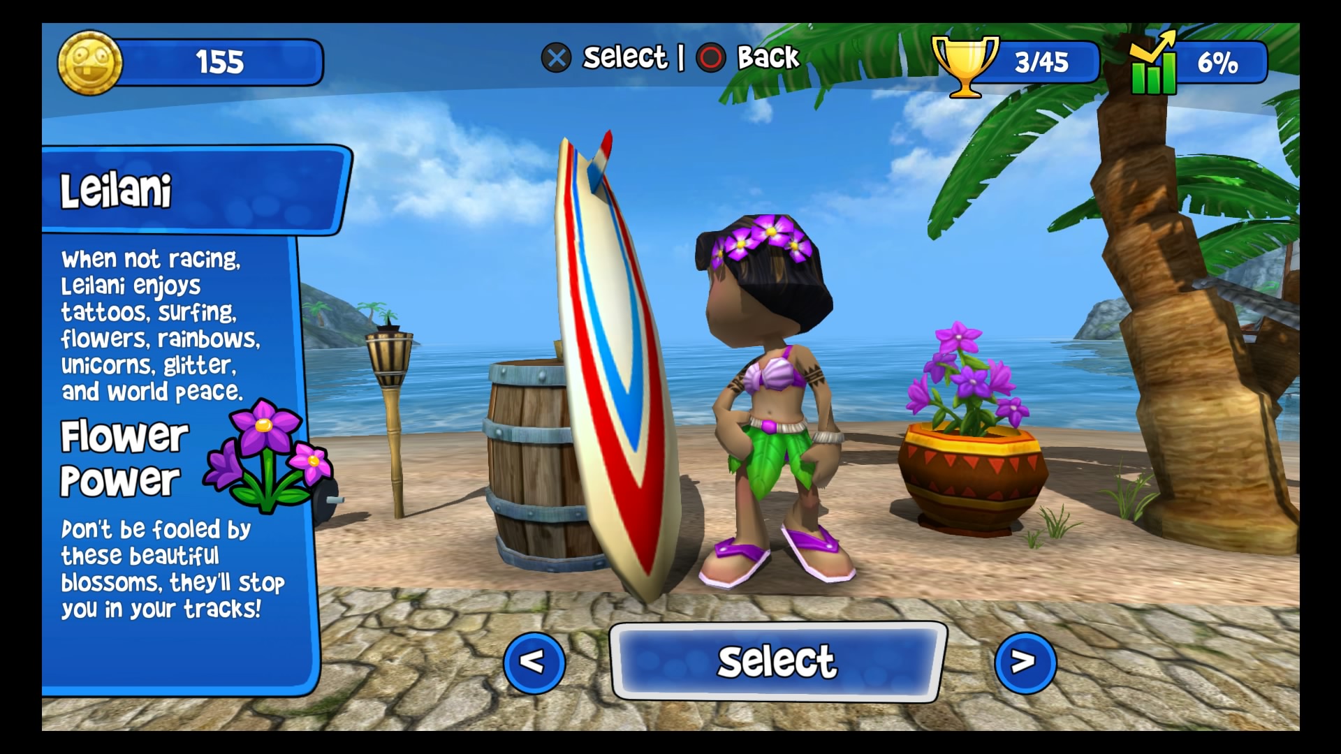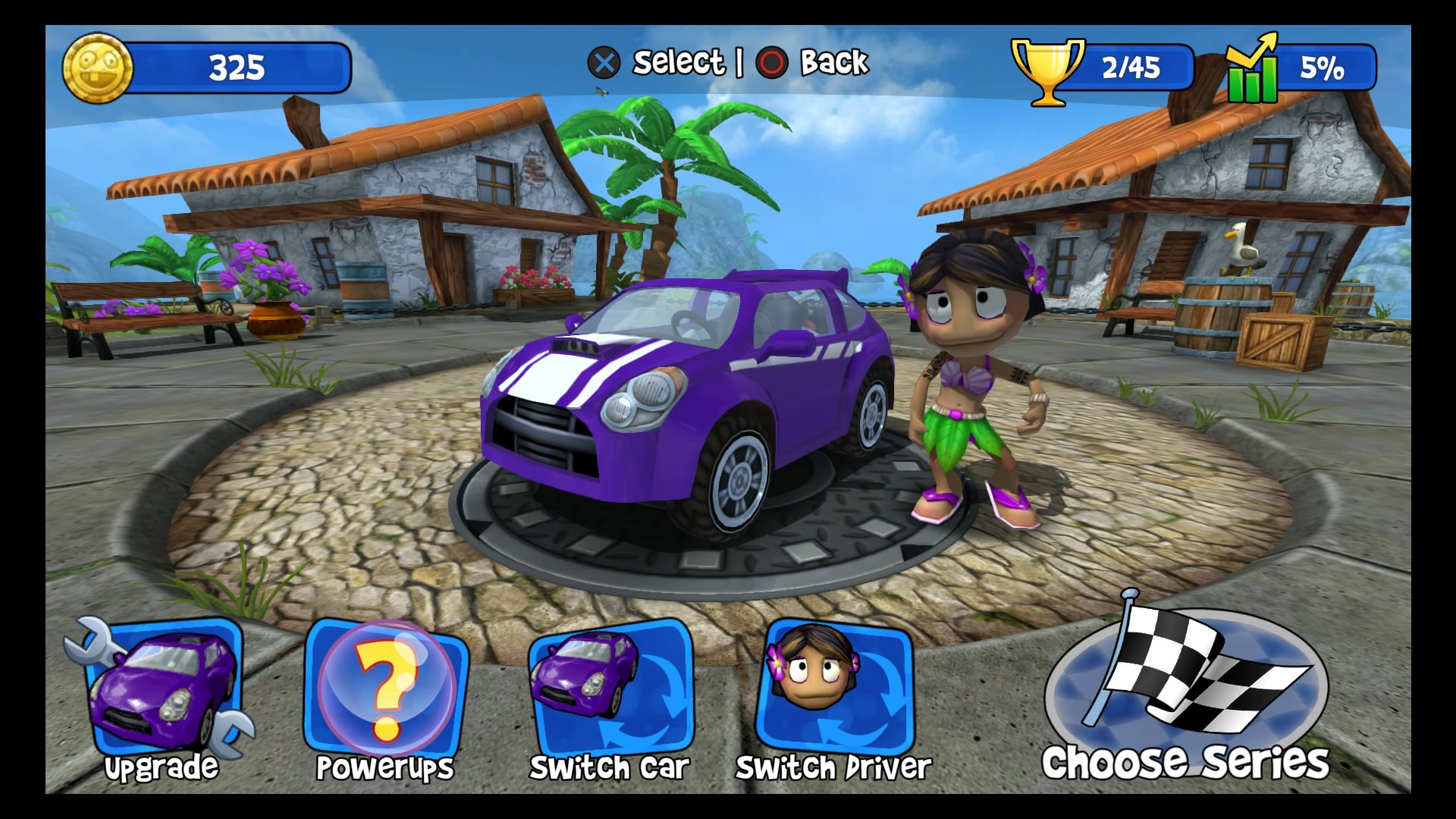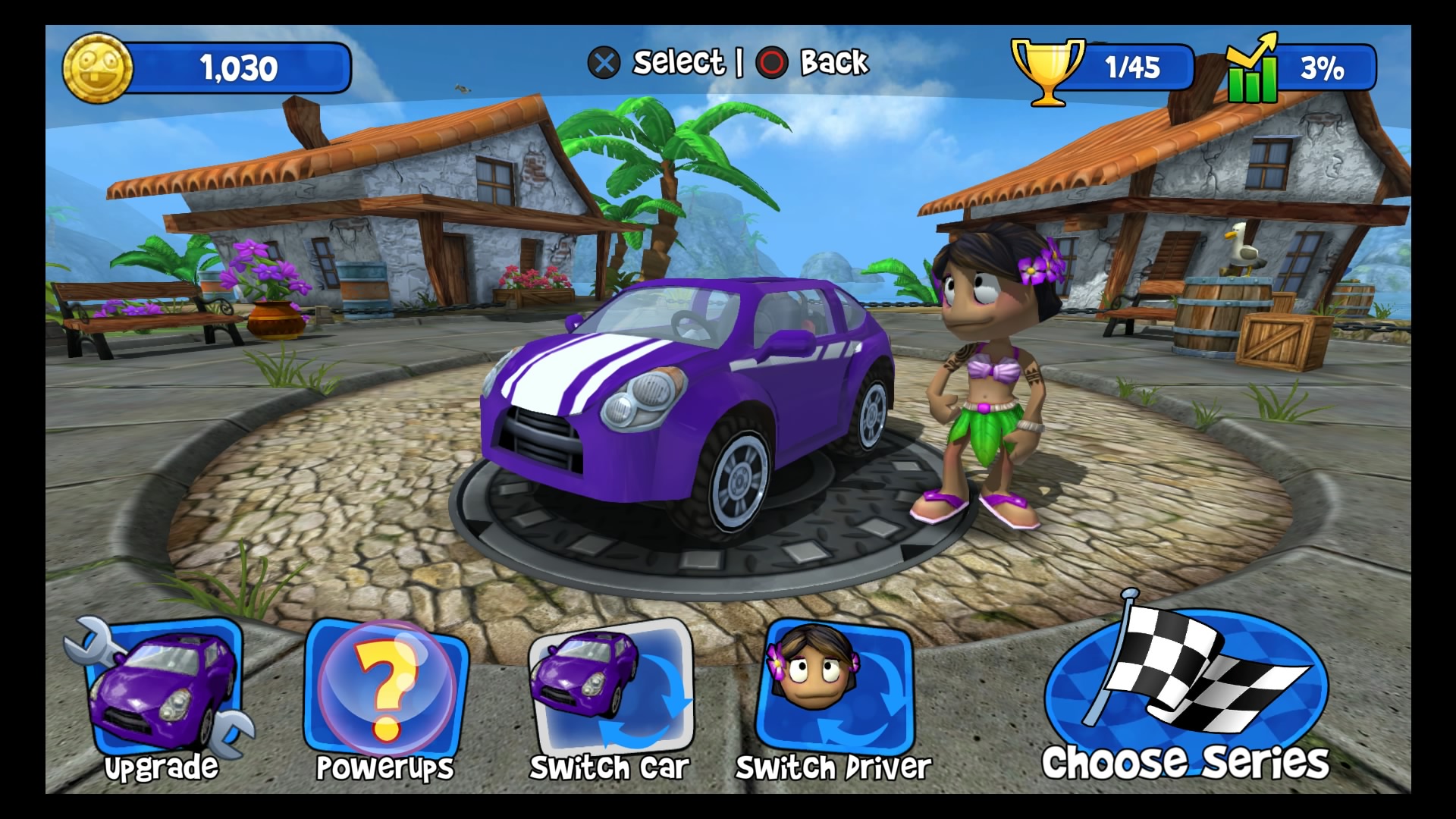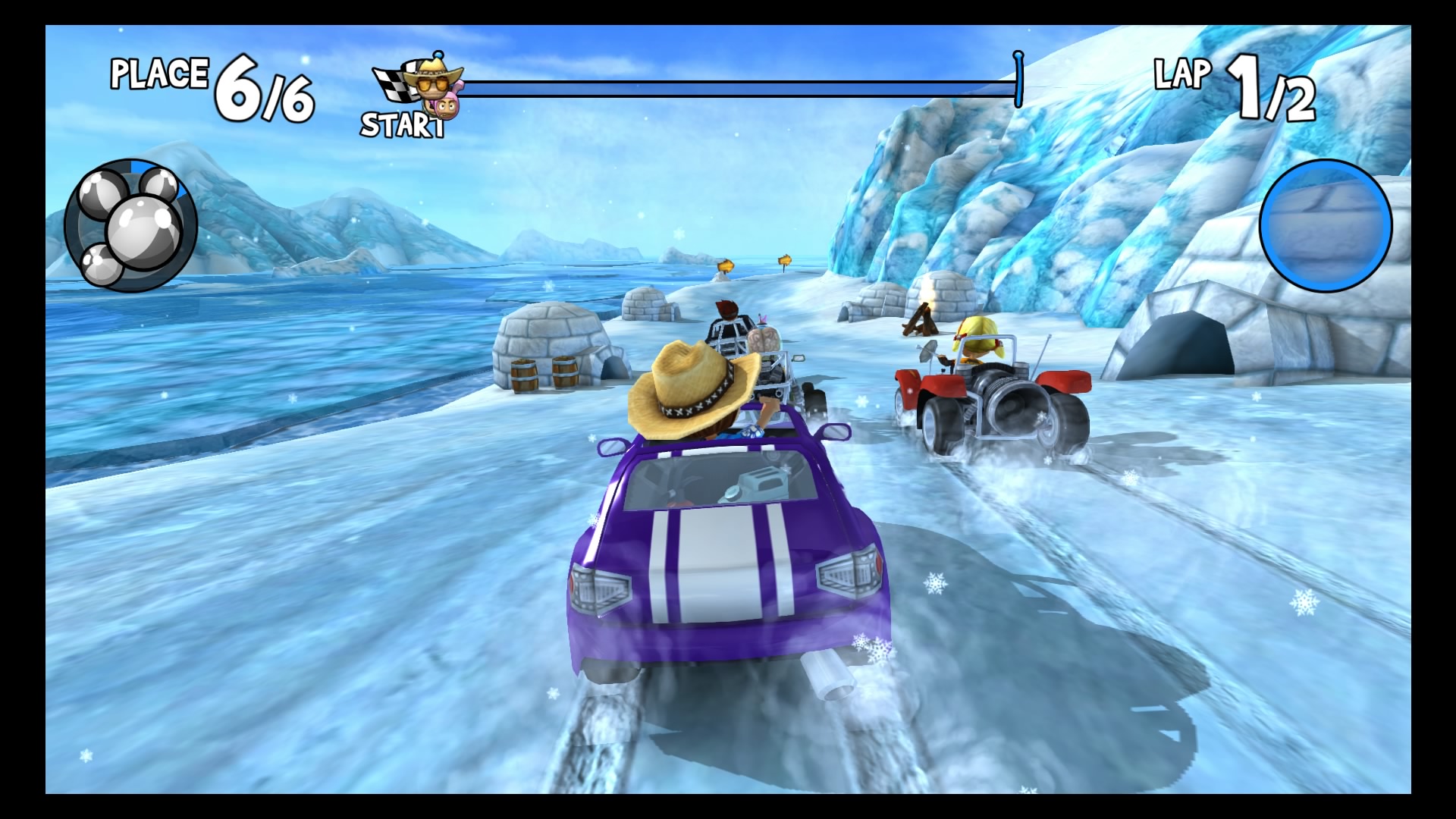 W trybie kariery wybieramy swój upragniony pojazd (Lambini jest naprawdę super!), kierowcę i możemy ruszać na podbój malowniczych krajobrazów. Do dyspozycji mamy kilka lokacji począwszy od dżungli, przez wulkan i lodowce, aż po stare ruiny. W wyścigach bierze udział łącznie 6 kierowców. Naszym zadaniem jest pokonanie całej piątki uczestników, co tylko z pozoru wydaje się łatwe. Złudne są nadzieje tych, którzy uważają, że śmigną do samej mety na jednym gazie. Nasi rywale są naprawdę szybcy, sprytni i co najważniejsze sprawnie używają wspomagaczy. Otóż na naszej drodze, co kilka kilometrów znajdują się bąbelki ze znakami zapytania. Dzięki zebraniu takiego bąbelka zostaje nam losowo przydzielony power-up, wśród których znajdą się dopalacze, zwiększające naszą prędkość, plamy oleju czy też rakiety. Umiejętne ich wykorzystywanie przynajmniej na chwilę pozwoli nam pozbyć się konkurencji. Każda lokacja posiada kilka różnych wyścigów. Kolejne zawody odblokowują się po zdobyciu odpowiedniej ilości gwiazdek. W jednym wyścigu można zdobyć 3 gwiazdki, zazwyczaj chodzi po prostu o ukończenie zawodów na 1 miejscu. Każda sekwencja zakończona jest wyścigiem z roboczo nazwanym przeze mnie mistrzem. Pokonanie mistrza oznacza dołączenie do naszego teamu nowego kierowcy wraz z jego umiejętnością.