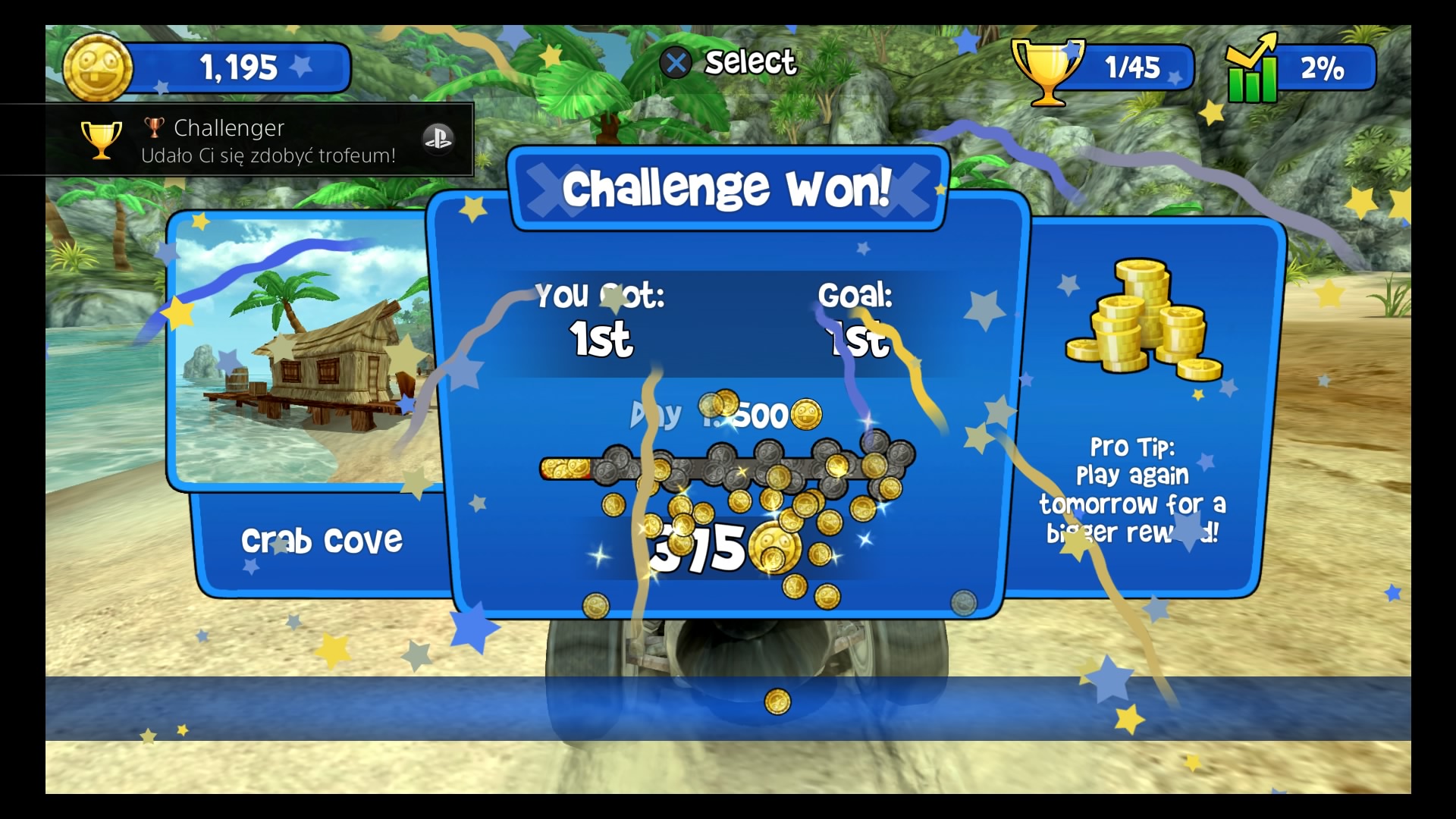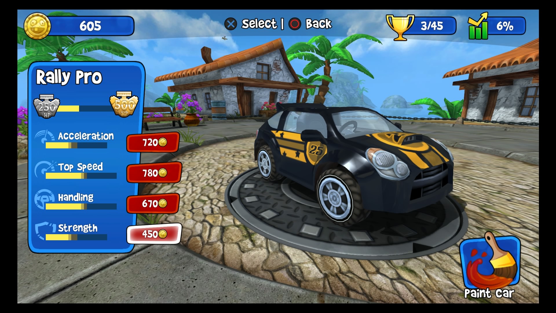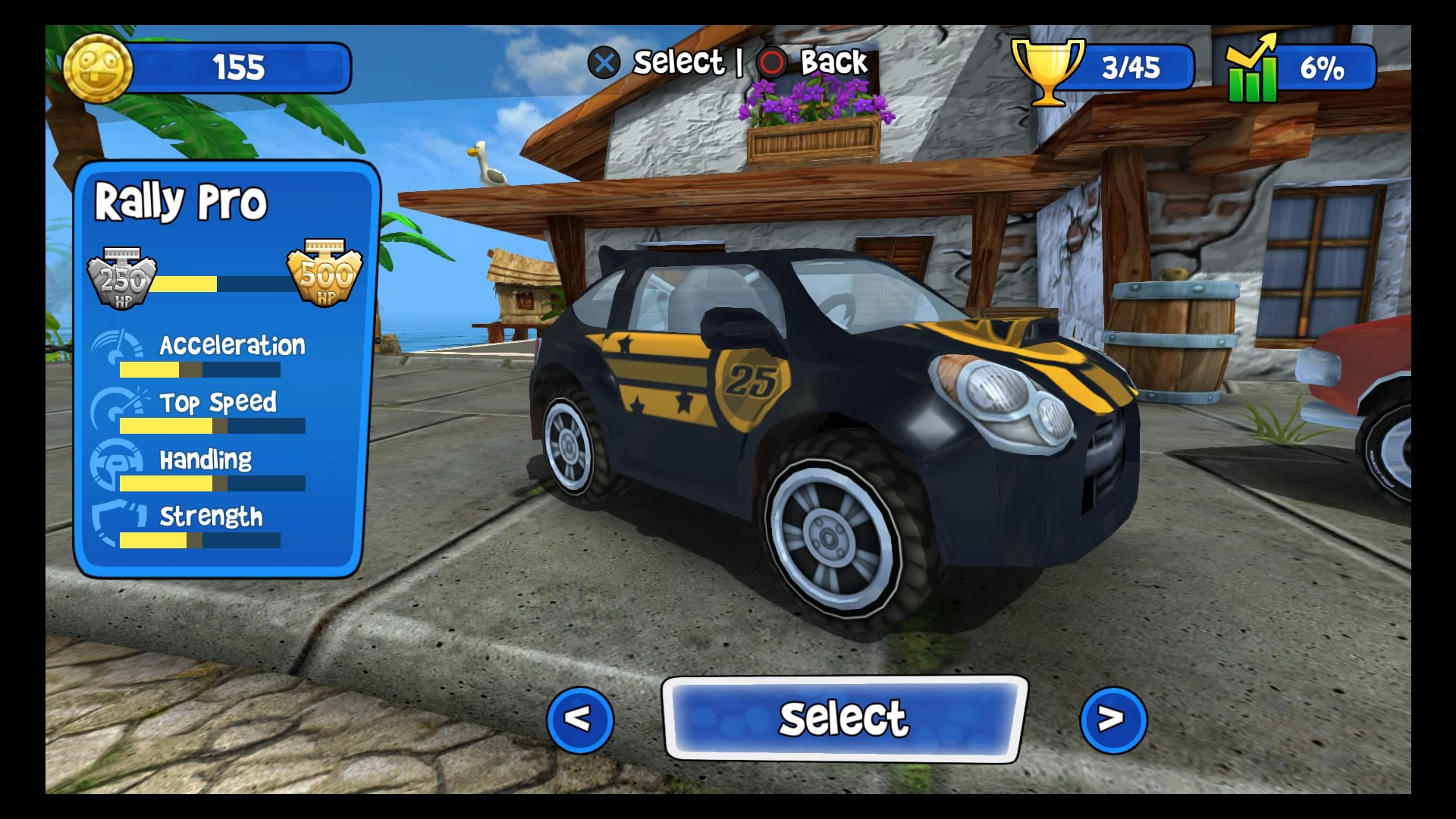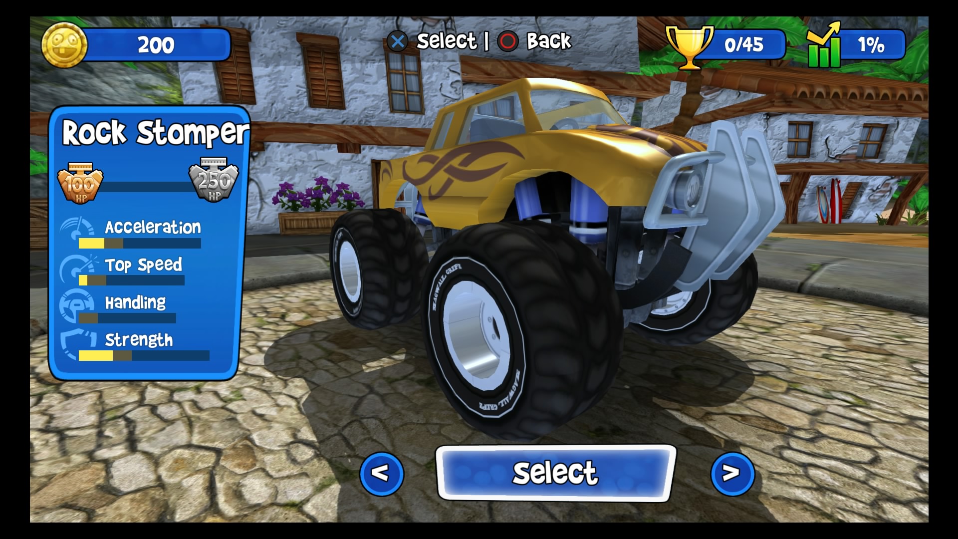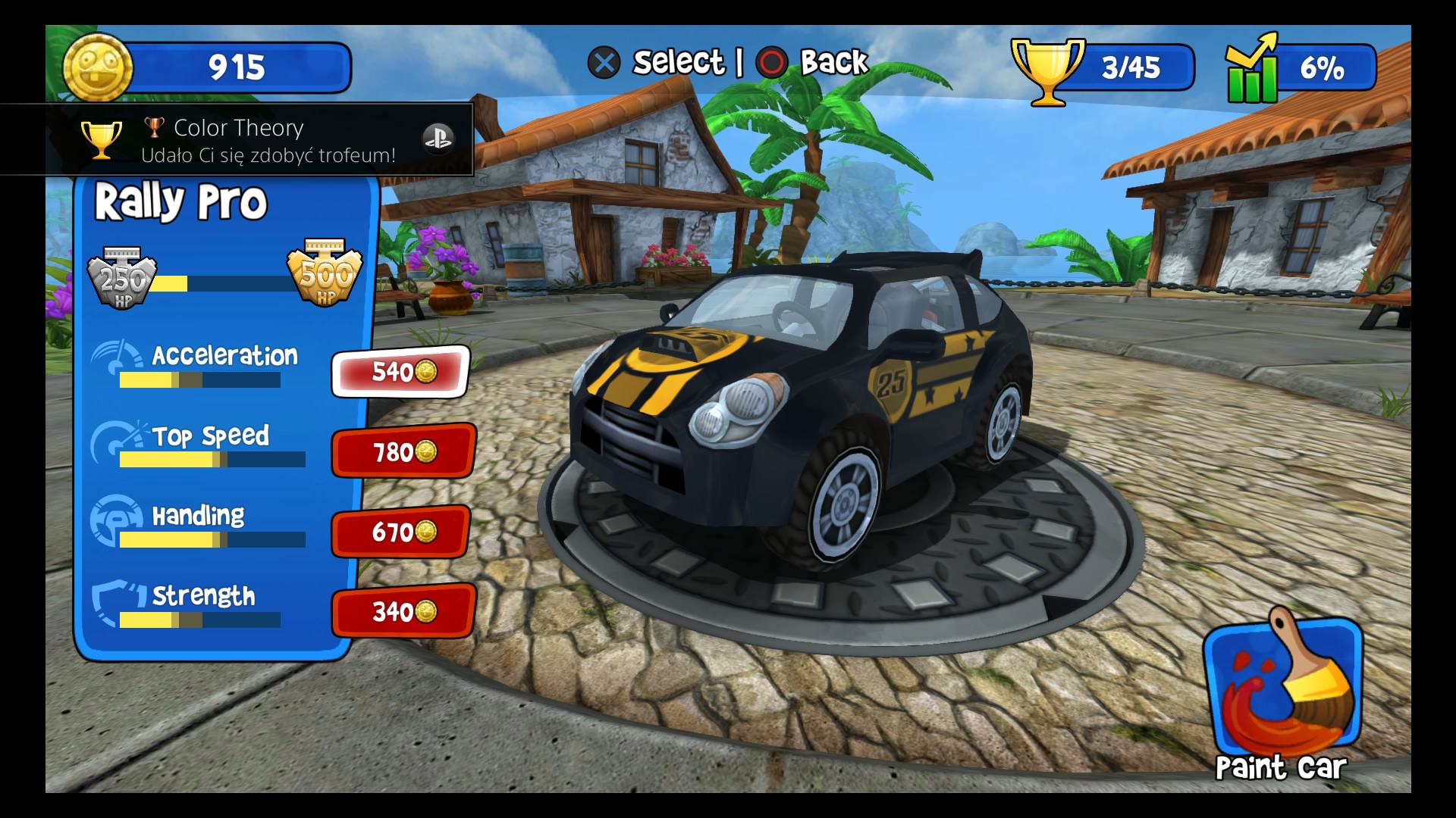 W trybie kariery wybieramy swój upragniony pojazd (Lambini jest naprawdę super!), kierowcę i możemy ruszać na podbój malowniczych krajobrazów. Do dyspozycji mamy kilka lokacji począwszy od dżungli, przez wulkan i lodowce, aż po stare ruiny. W wyścigach bierze udział łącznie 6 kierowców. Naszym zadaniem jest pokonanie całej piątki uczestników, co tylko z pozoru wydaje się łatwe. Złudne są nadzieje tych, którzy uważają, że śmigną do samej mety na jednym gazie. Nasi rywale są naprawdę szybcy, sprytni i co najważniejsze sprawnie używają wspomagaczy. Otóż na naszej drodze, co kilka kilometrów znajdują się bąbelki ze znakami zapytania. Dzięki zebraniu takiego bąbelka zostaje nam losowo przydzielony power-up, wśród których znajdą się dopalacze, zwiększające naszą prędkość, plamy oleju czy też rakiety. Umiejętne ich wykorzystywanie przynajmniej na chwilę pozwoli nam pozbyć się konkurencji. Każda lokacja posiada kilka różnych wyścigów. Kolejne zawody odblokowują się po zdobyciu odpowiedniej ilości gwiazdek. W jednym wyścigu można zdobyć 3 gwiazdki, zazwyczaj chodzi po prostu o ukończenie zawodów na 1 miejscu. Każda sekwencja zakończona jest wyścigiem z roboczo nazwanym przeze mnie mistrzem. Pokonanie mistrza oznacza dołączenie do naszego teamu nowego kierowcy wraz z jego umiejętnością.