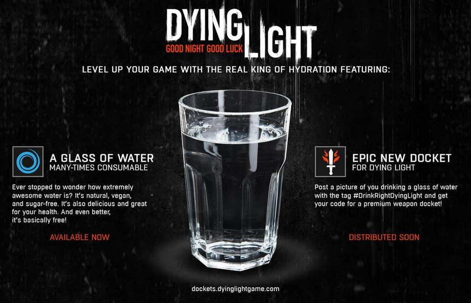 Wystarczy zrobić sobie zdjęcię pijąc szklankę wody, opatrzyć ją odpowiednim hashtagiem, a twórcy wyślą nam kod na dodatkową broń do Dying Light.
