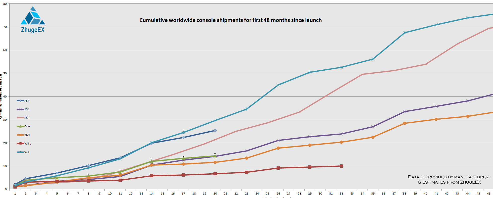 (kliknij aby powiększyć) Sprzedaż różnych systemów po 48 miesiącach od premiery.