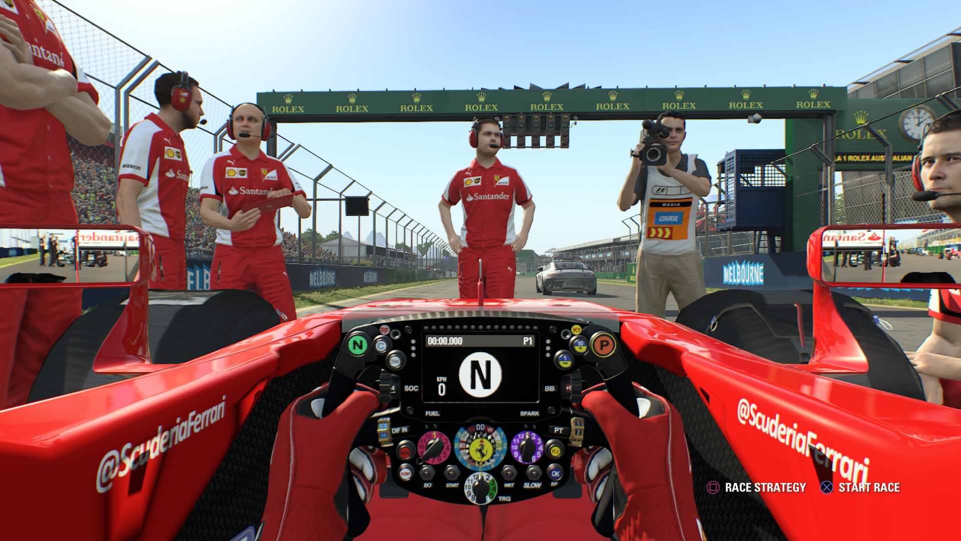 Ja natomiast chciałem trochę walki z bolidem, chciałem chociaż w małym stopniu poczuć się jak prawdziwy kierowca F1. Manualna skrzynia biegów, kontrola trakcji na medium, wyłączone wspomaganie hamowania i kierowania. Wyścigi momentalnie stały się piękne, wymagające i niebezpieczne. Każdy zakręt trzeba pokonać odpowiednio manipulując gazem. Na pierwszych czterech biegach nie wolno wcisnąć spustu do końca, tylko trzeba bardzo delikatnie dozować sobie prędkość, zręcznie wrzucając wyższe biegi. Grając na kierownicy Trustmaster T300RS z nakładką prawdziwej repliki kierownicy bolidu Ferrari F1 z 2011 roku mogłem poczuć każdy czynnik zewnętrzny wpływający na bolid. Kierownica momentalnie reaguje na otarcie o bandy, zbyt szybkie najechanie na tarki czy kolizje z innymi bolidami. Kierownica pozwala nam także dużo szybciej i sprawniej pokonywać zakręty. Force Feedback sprawuje się w F1 2015 rewelacyjnie, na każdym zakręcie walczymy z kierownicą, na którą działają naprawdę duże przeciążenia. Dzięki odpowiedniej konstrukcji cały czas trzymamy dłonie na kierownicy, nawet ostre zakręty pokonujemy bez odrywania rąk. Manetki zmiany biegów są małe, ale zostały tak umieszczone, że bez problemu momentalnie wciśniemy je palcem wskazującym, czy serdecznym. Cała nakładka F1 wykonana jest z metalu, natomiast uchwyty, na których trzymamy ręce są pokryte antypoślizgowym materiałem. Kierownica ma osiem dowolnie konfigurowanych przycisków. Niestety te pokrętła, które widzicie wokół logo Ferrari, to tylko plastikowe atrapy. Do tego mamy dwa pokrętła, którymi możemy zmieniać ustawienia bolidu, wydawać polecenia lub zapytania naszemu boksowi. Dodatkowo na samy dole mamy umieszczone dwa analogi, które pracują jak D-Pad. Jednym możemy poruszać się po menu gry, a drugim sterować kamerą podczas wyścigu.