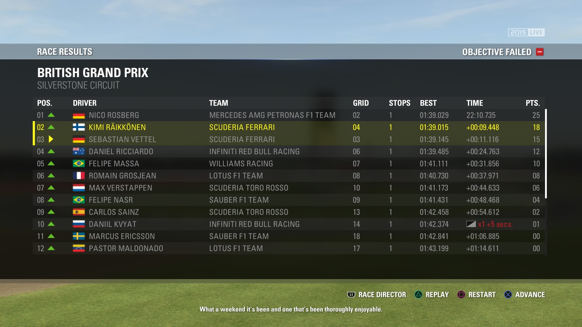 Kolejnym problemem są niebieskie flagi, które są lekceważone przez słabszych kierowców, dublowani kierowcy nas nie przepuszczą, ba! nawet walczą z nami w zakrętach. Niestety jest też problem z systemem DRS, który nie zawsze aktywuje się, gdy jesteśmy w strefie za bolidem przeciwnika, lub odwrotnie, czasem pozwala aktywować się, gdy jedziemy na pierwszym miejscu. Problem dotyczy także systemu kar. Dosyć często są zbyt łaskawe, gdy zetniemy zakręt, uderzymy w przeciwnika czy wypchniemy go z toru zazwyczaj kończy się to tylko ostrzeżeniem. Lepiej sprawy mają się, gdy wyprzedzimy przeciwnika ścinając zakręt. Mamy wtedy 10 sekund na oddanie mu pozycji, w przeciwnym wypadku zostaniemy zmuszeni do zjazdu do boksu, gdzie odbędziemy pięciosekundową karę.