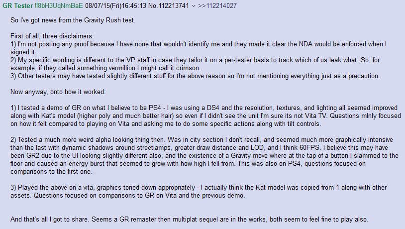 Pewien tester gier poinformował na 4chanie, że miał okazję zagrać w Gravity Rush 2 na PS4 oraz PS Vita. Stwierdził, że różnica graficzna między rozgrywką na PS4 i PS Vita była dużo, więc możemy zgadywać, że nie wykorzystano jedynie technologi Remote Play. Oczywiście nasz tester podpisał NDA i nie mógł udostępnić żadnych dodatkowych materiałów, które mogłyby potwierdzić jego prawdomówność. Ja jednak wierzę, że Kat powróci na PSV w wielkim stylu.