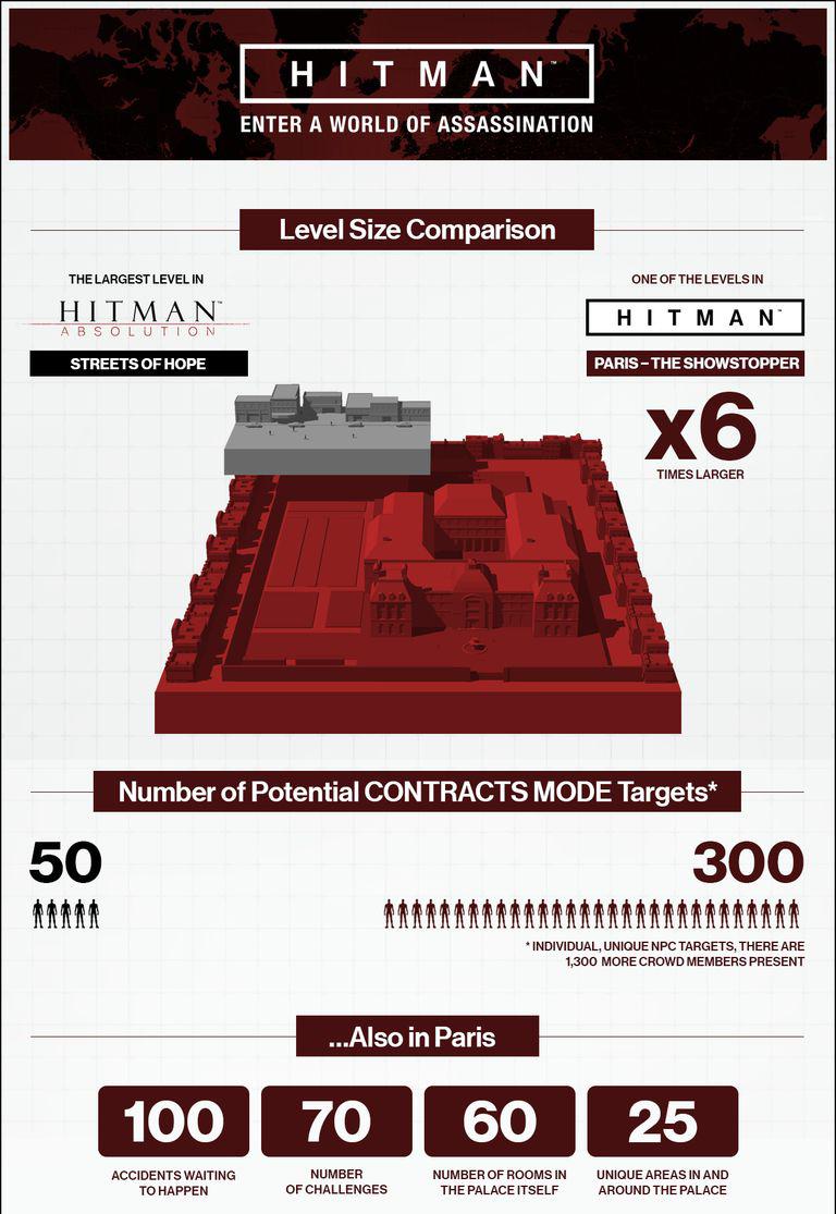 Firma udostępniła dodatkowo poniższą grafikę, pokazującą o ile większy jest nowy Hitman w porównaniu do Hitman Absoluion.
