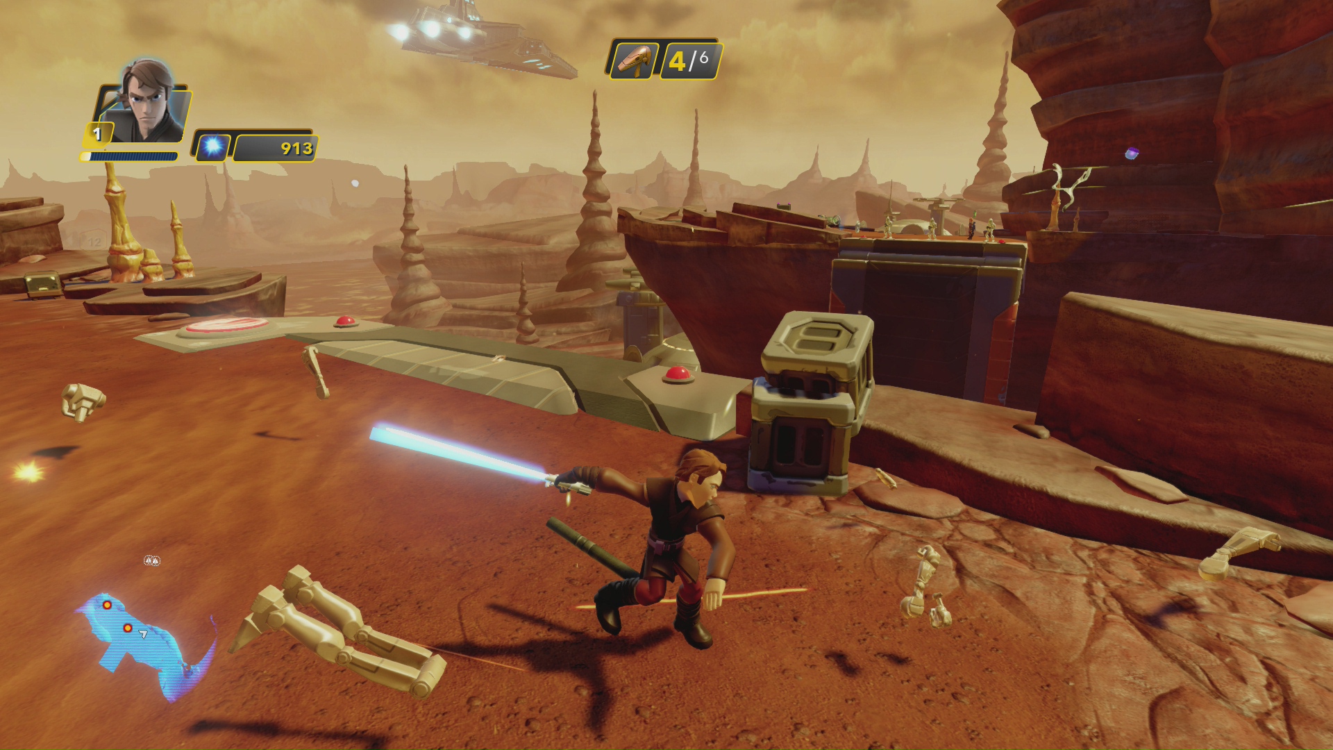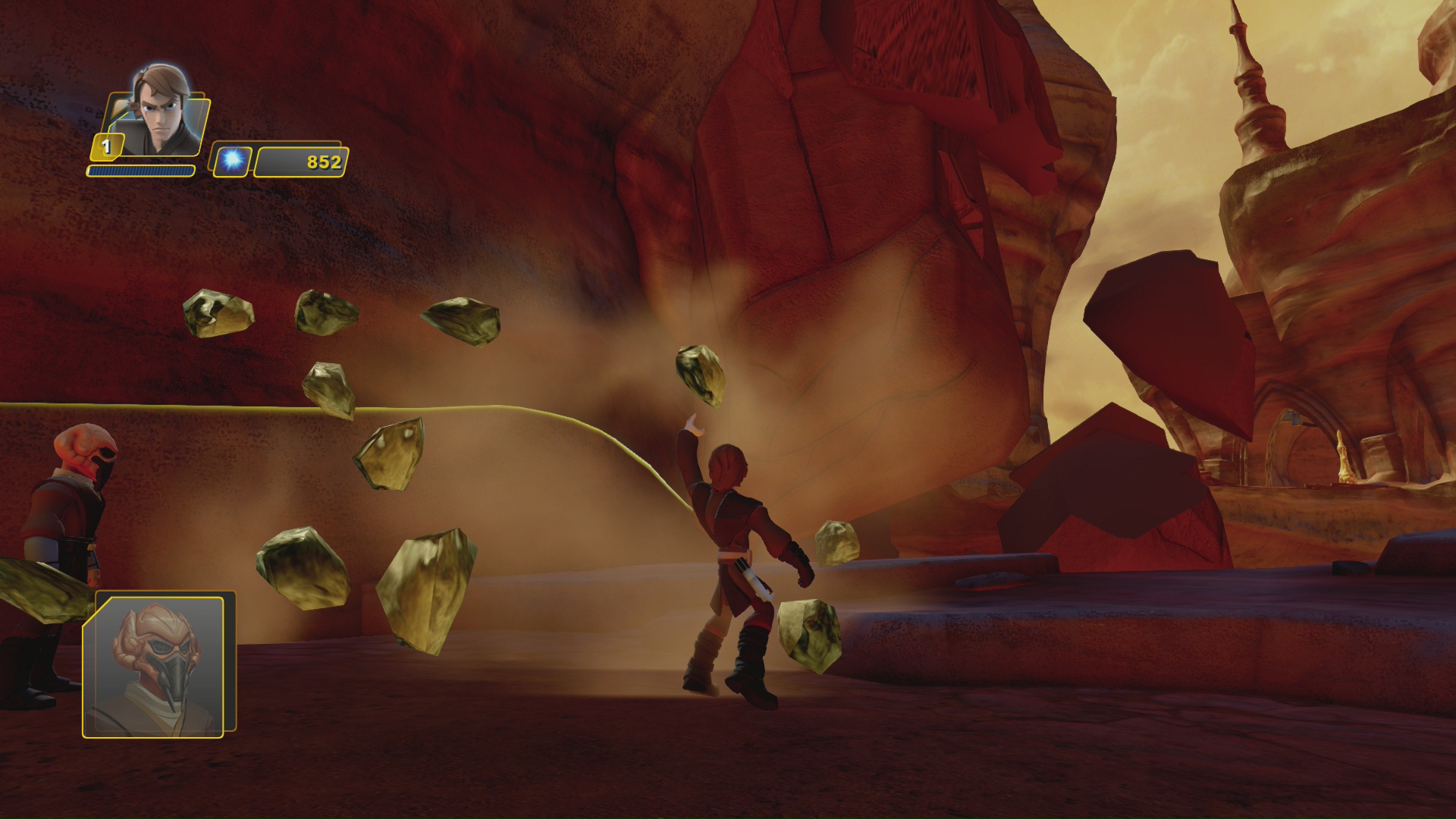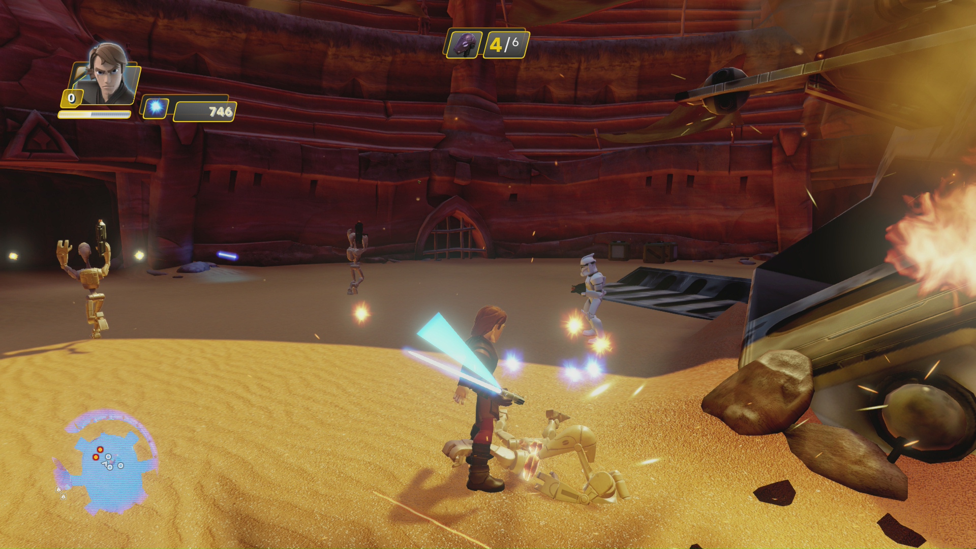 W kampanii sterujemy tą postacią, którą mamy położoną na portalu mocy. Nie możemy jednak grać dowolną figurką. Są pewne ograniczenia. Przede wszystkim zapomnijcie o graniu Iron Manem czy inną postacią, nie związaną z Gwiezdnymi Wojnami. Taką dowolność łączenia światów i postaci mamy tylko w piaskownicy, o której za chwilę. W kampanie grać możemy jedynie postaciami, które do niej pasują. Nie możemy też grać od razu wszystkimi figurkami. Aby zagrać inną niż podstawowe postacią musimy ją najpierw odblokować. Na szczęście, w przeciwieństwie do poprzednika, żetony odblokowujące możliwość grania inną figurką są łatwe do odnalezienie i wystarczy tylko jeden. Np. Takim Obi Wanem możemy grać już po pierwszy 15 minutach kampanii. Jest to zabieg wydaje mi się dobry, który zapewnia spójność historii. Odblokowywanie kolejnych postaci przychodzi szybko, więc jeśli kupiliście z grą zapas dodatkowych figurek to będziecie musieli chwilę poczekać aż nimi pogracie.