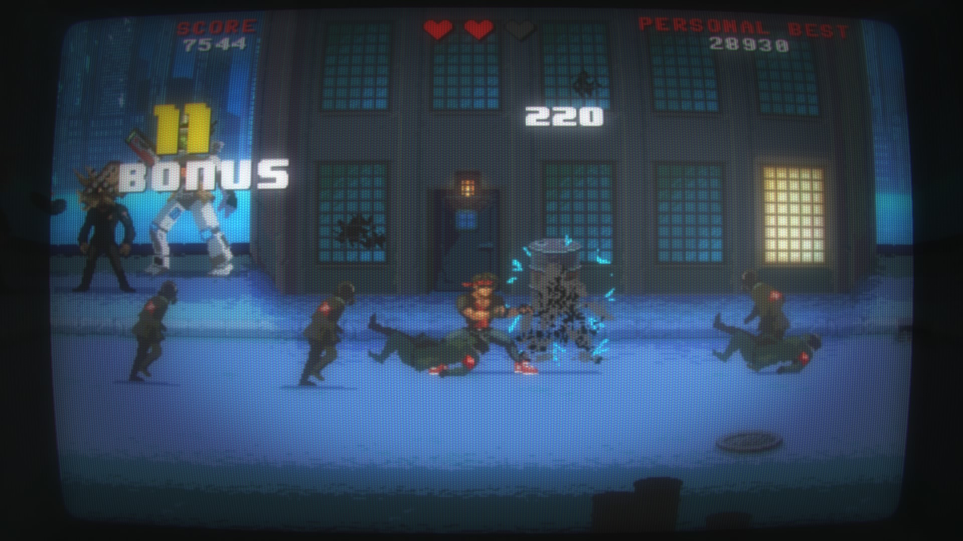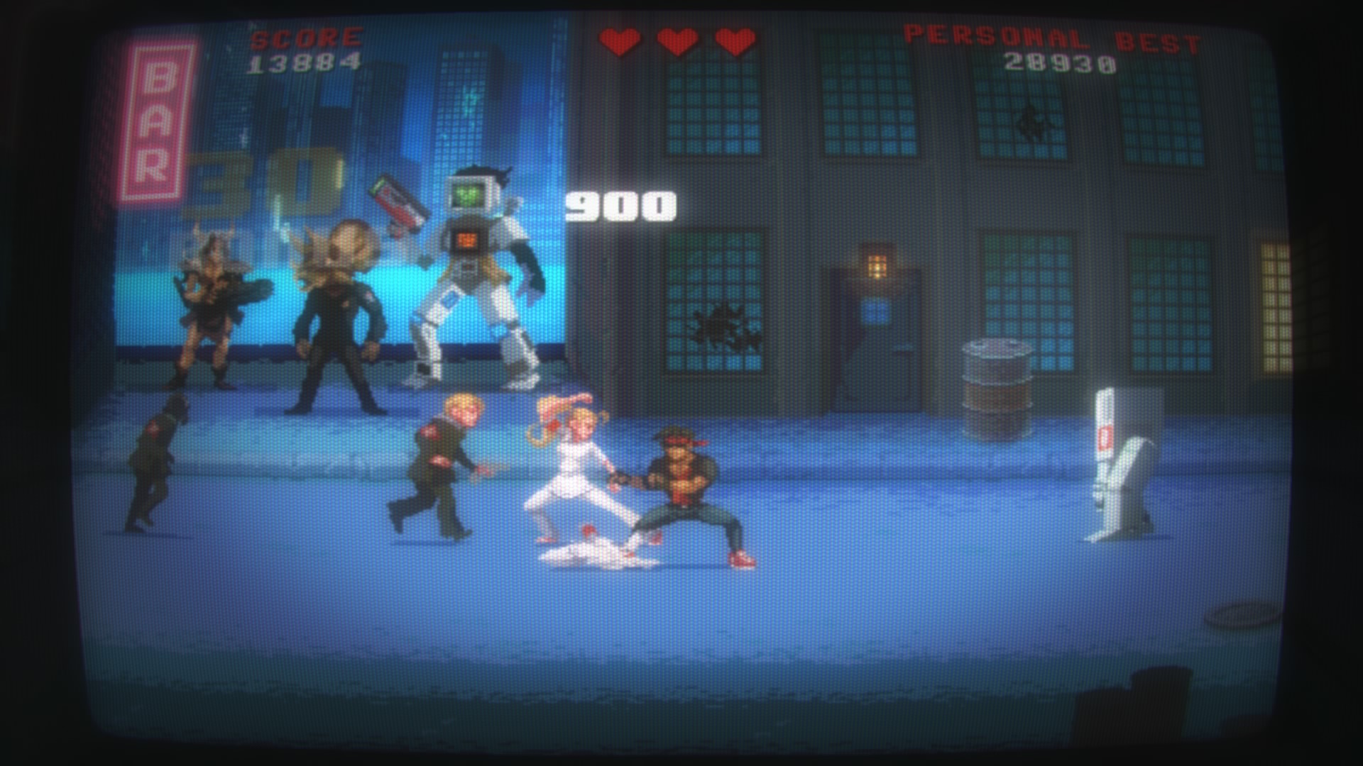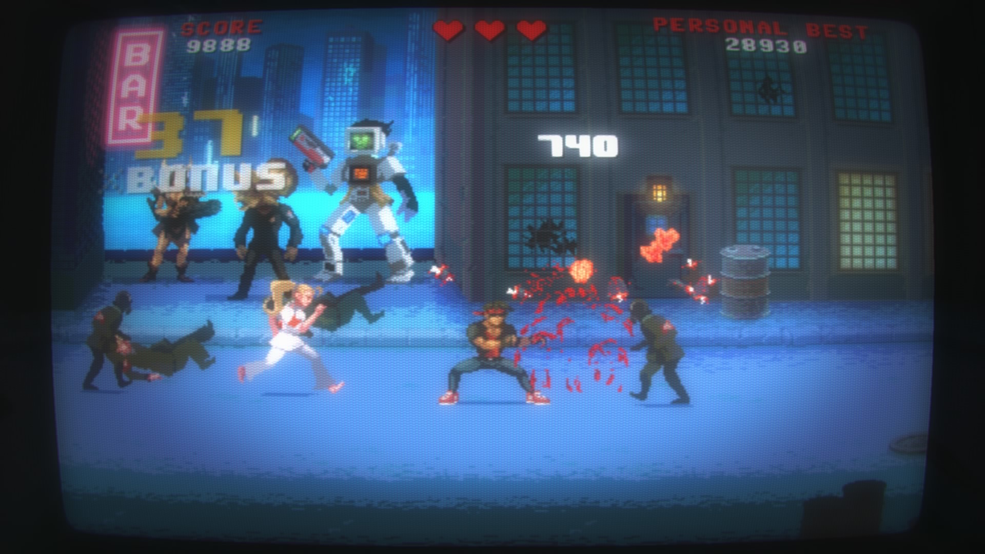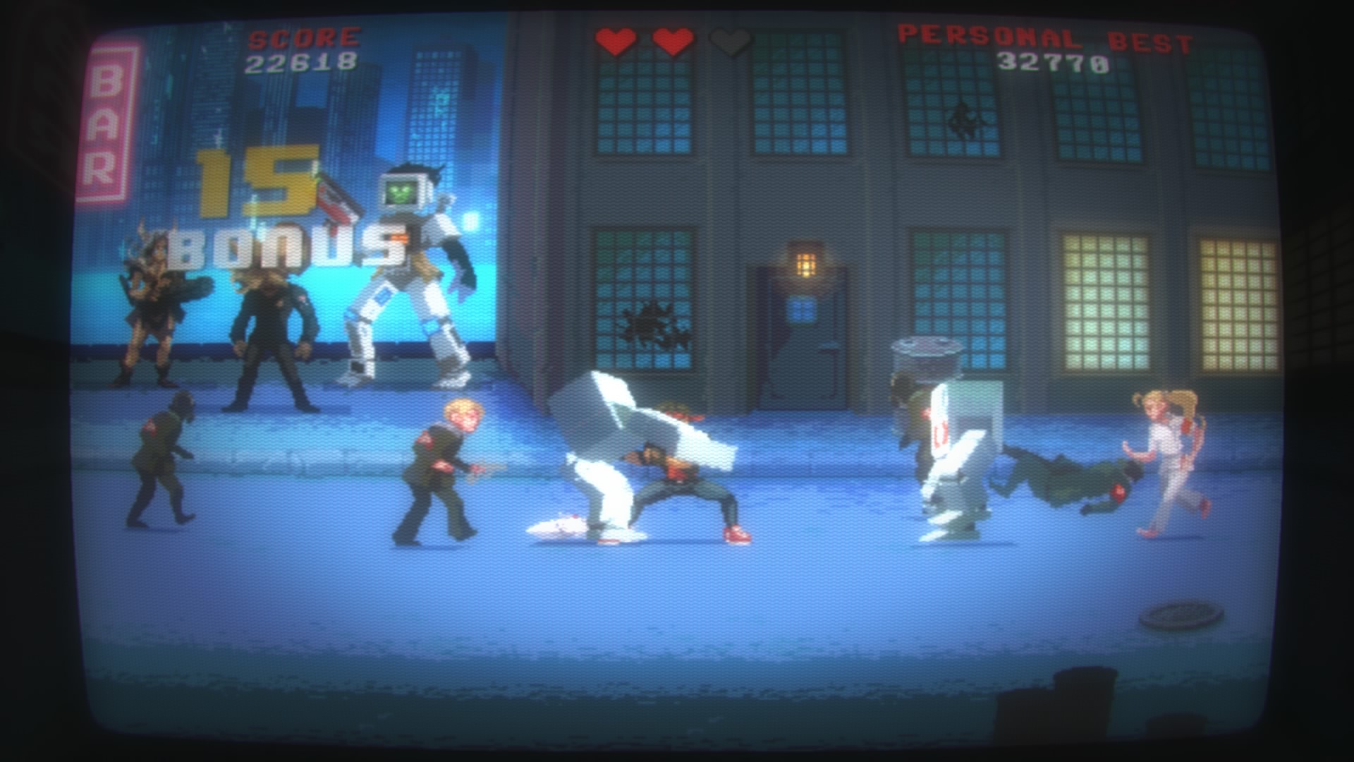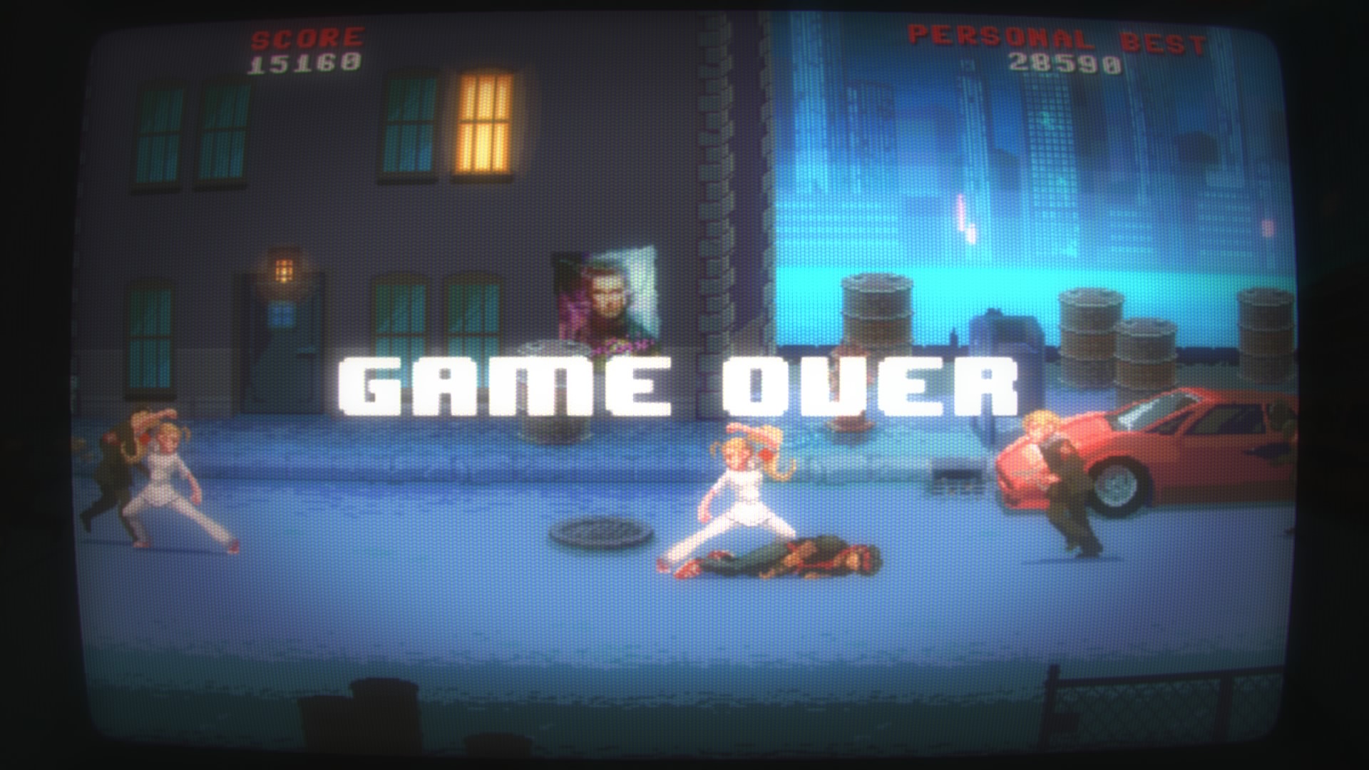 Jeśli chodzi o oprawę audiowizualną trudno się do niej przyczepić. Wszystko wygląda tak jak powinno. Klimat chodzonych bijatyk i automatów z lat ’80 pasuje doskonale. Mamy pikselową grafikę i świetny podkład muzyczny, jednak wszystkiego jest tutaj za mało, nie ważne czy chodzi o poziomy, piosenki czy postacie. Wystarczyło dodać kilka środowisk, jakiś system zbierania doświadczenia, wewnętrzny system wyzwań, a produkcja zyskałaby głębię.