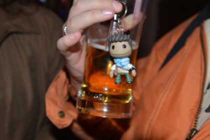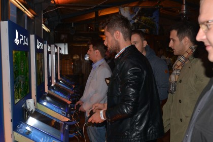 Po zakończeniu wystąpienia naszego gościa, zostaliśmy zaproszeni do skorzystania z różnych atrakcji. We wspomnianej drugiej części lokalu mieliśmy dostęp do szeregu konsol z odpalonymi różnymi częściami trylogii Uncharted. Można było na własnej skórze poczuć różnice i usprawnienia, o których słuchaliśmy kilka minut wcześniej. Oczywiście dla zmęczonych podróżników była przygotowana część gastronomiczna, gdzie można było coś przekąsić i się napić, w końcu na wodzie apetyt rośnie. Kompletnym zaskoczeniem była dla mnie kolejna atrakcja, mianowicie był to pan u którego mogliśmy własnoręcznie wybić numizmaty z logiem Uncharted. Dostawaliśmy gołą “monetę”, na której mogliśmy korzystając z młota i specjalnego urządzenia odbić to co zostało przygotowane na matrycy, po chwili nasze dzieło lądowało w kapslu jako pamiątka. Na stolikach były także breloczki z uroczym Sackboyem wcielającym się w Nathana Drake’a.