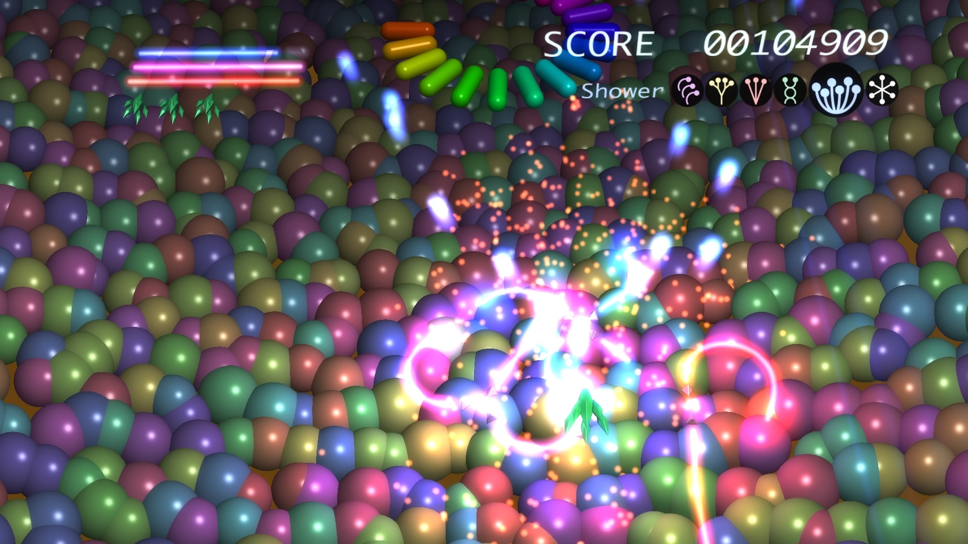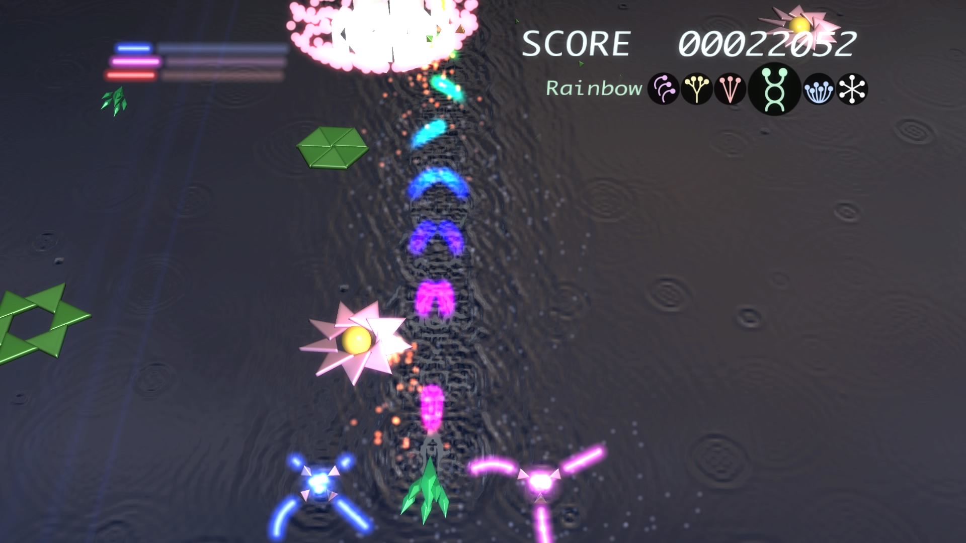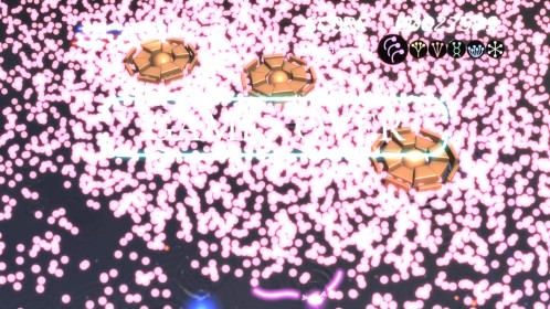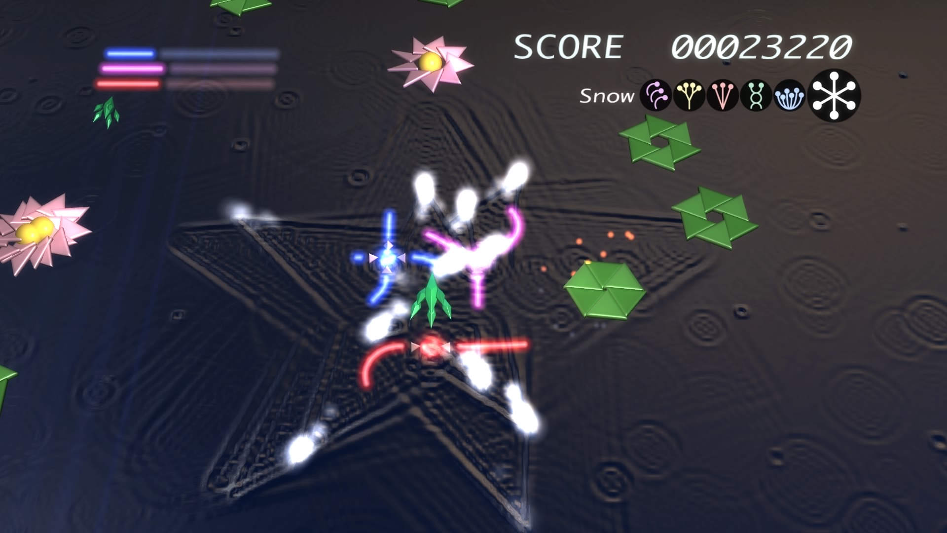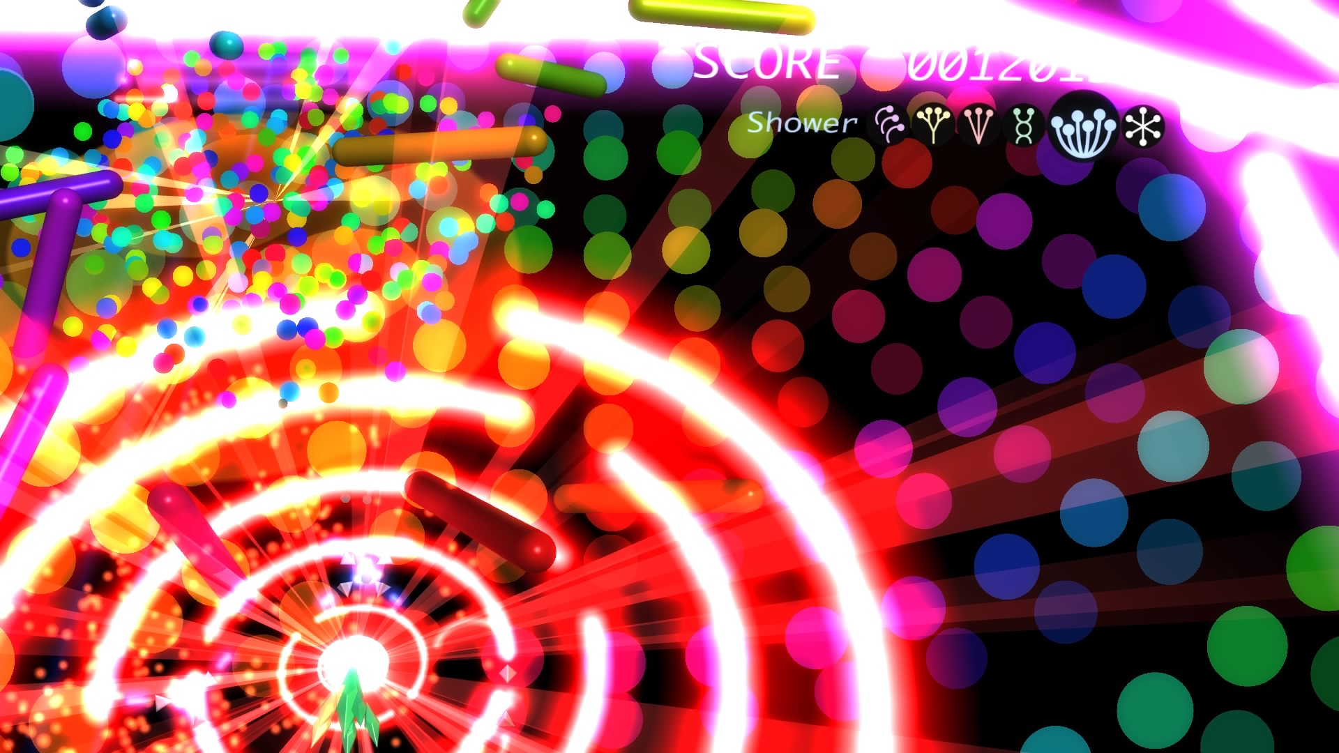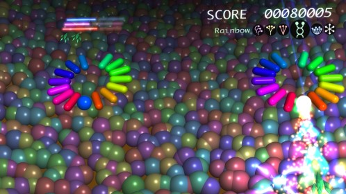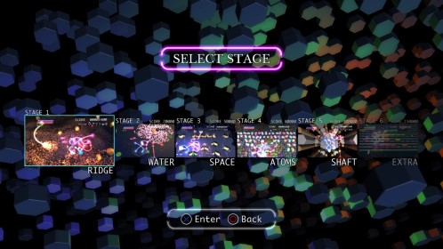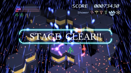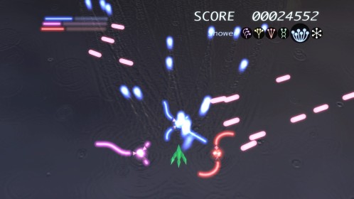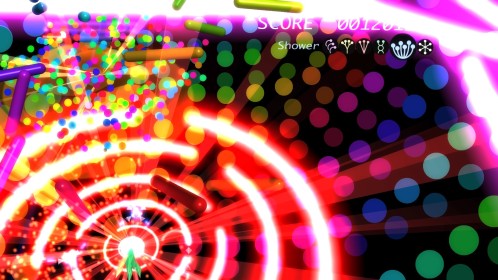 Ilość poziomów można policzyć na palcach jednej dłoni. No może dwóch, bo dokładnie jest ich 6. Wspomniane przeze mnie w poprzednim akapicie tarcze stanowią też źródło ataków specjalnych. Łącznie mamy 3 kolorowe specjały, którym odpowiadają 3 paski. Każdy pasek możemy napełnić zbierając podczas gry kolorowe power-upy. Za podstawowy strzał odpowiada trójkąt natomiast za pozostałe 3 ataki specjalne odpowiednio krzyżyk, kwadrat i kółko. Jeśli paski choć w niewielkim stopniu napełnimy możemy użyć mocy wybranego koloru. Trzeba jednak pamiętać, że zużywając je do cna tarcze również stają się mniejsze i pozostawiają więcej przestrzeni wokół nas przez co narażeni jesteśmy na bęcki od wroga.