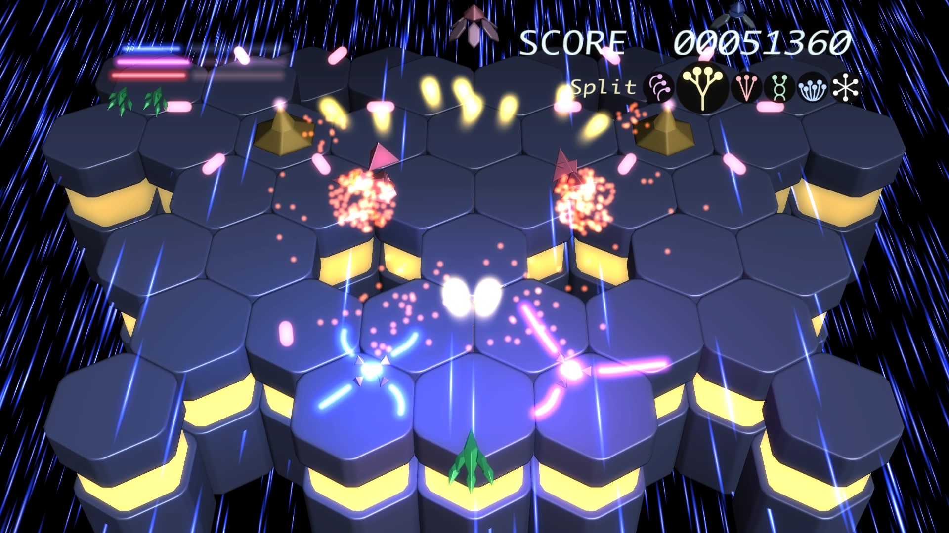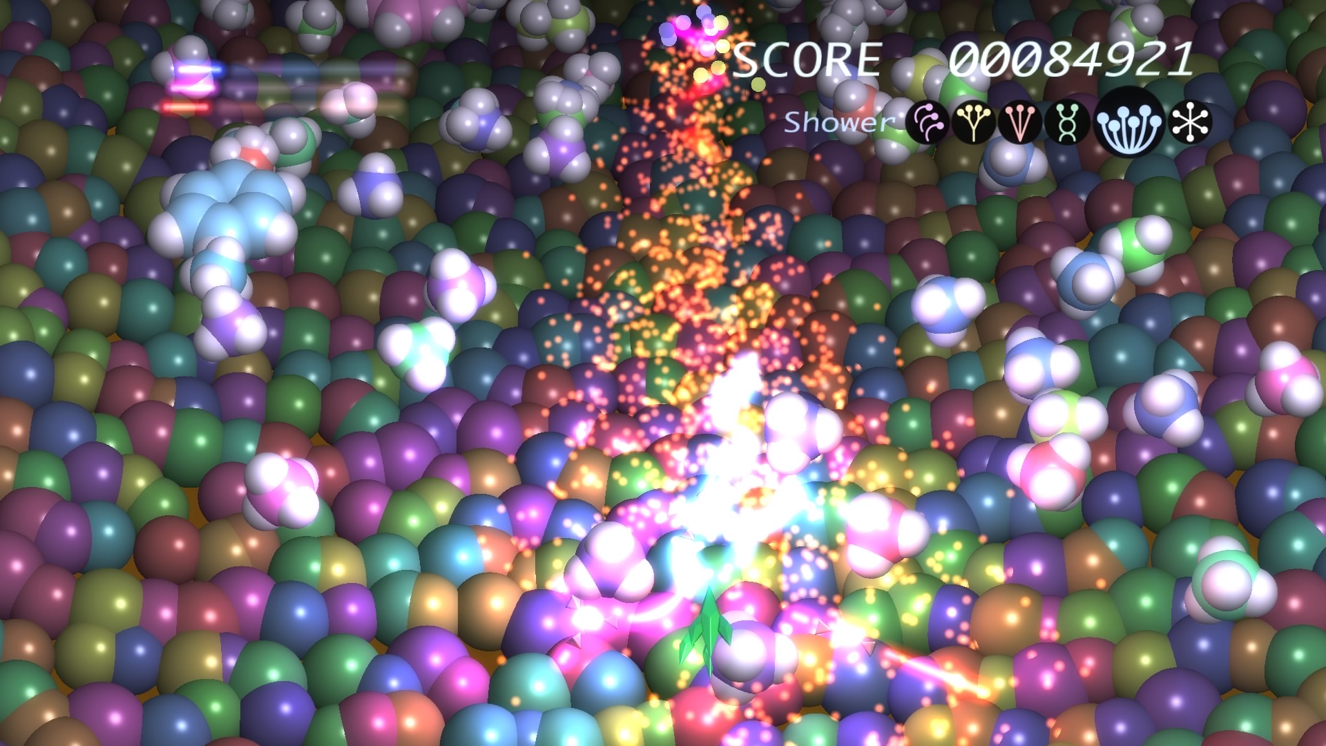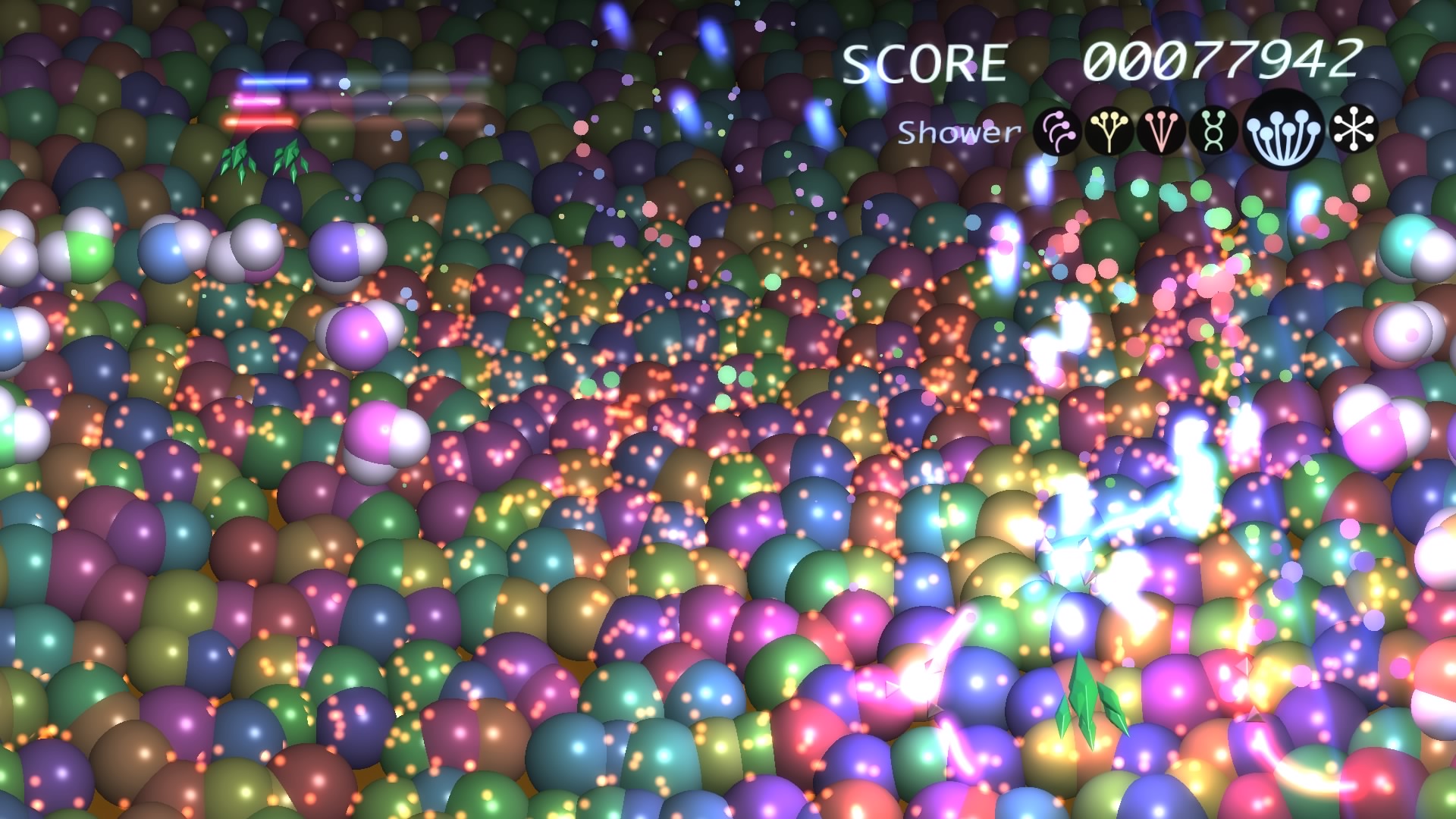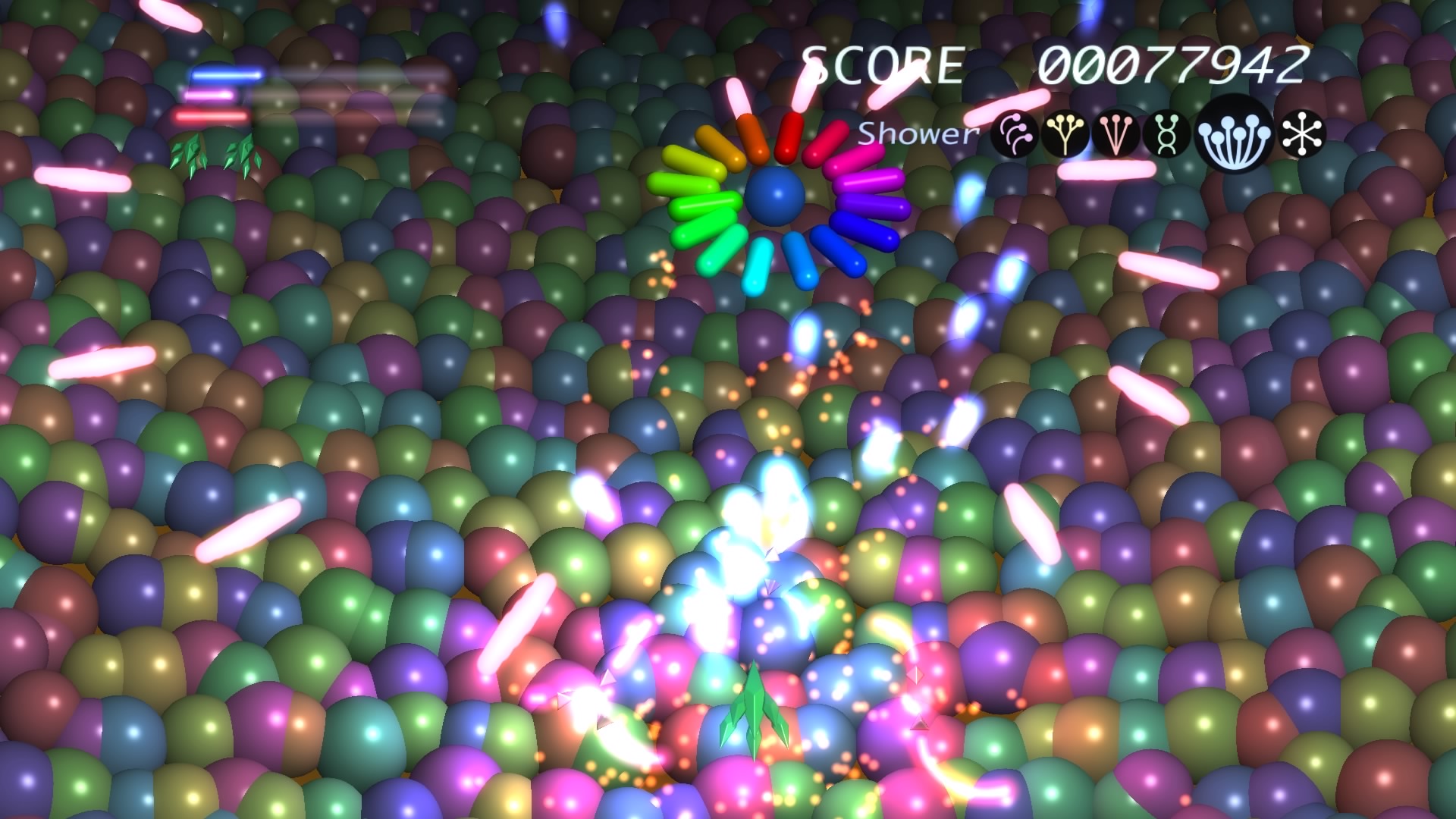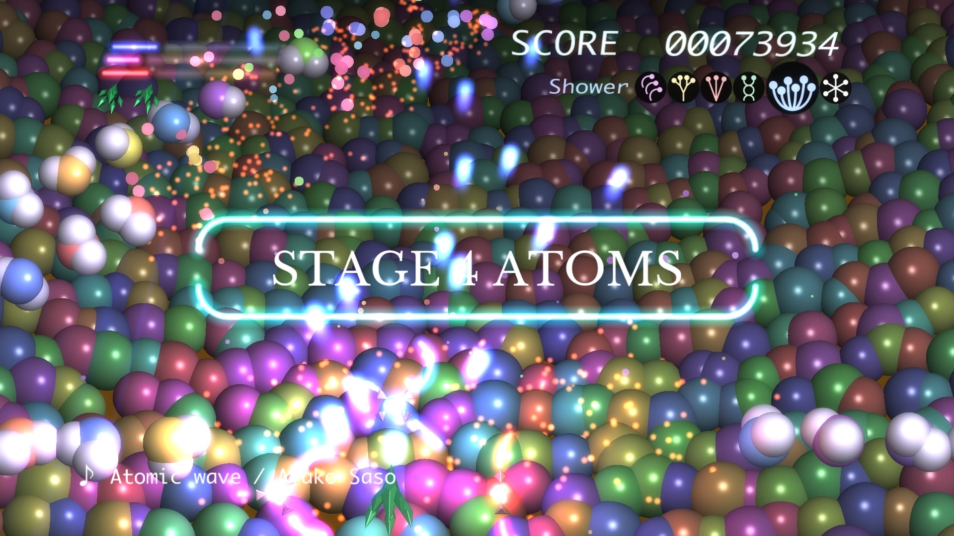Ilość poziomów można policzyć na palcach jednej dłoni. No może dwóch, bo dokładnie jest ich 6. Wspomniane przeze mnie w poprzednim akapicie tarcze stanowią też źródło ataków specjalnych. Łącznie mamy 3 kolorowe specjały, którym odpowiadają 3 paski. Każdy pasek możemy napełnić zbierając podczas gry kolorowe power-upy. Za podstawowy strzał odpowiada trójkąt natomiast za pozostałe 3 ataki specjalne odpowiednio krzyżyk, kwadrat i kółko. Jeśli paski choć w niewielkim stopniu napełnimy możemy użyć mocy wybranego koloru. Trzeba jednak pamiętać, że zużywając je do cna tarcze również stają się mniejsze i pozostawiają więcej przestrzeni wokół nas przez co narażeni jesteśmy na bęcki od wroga.
