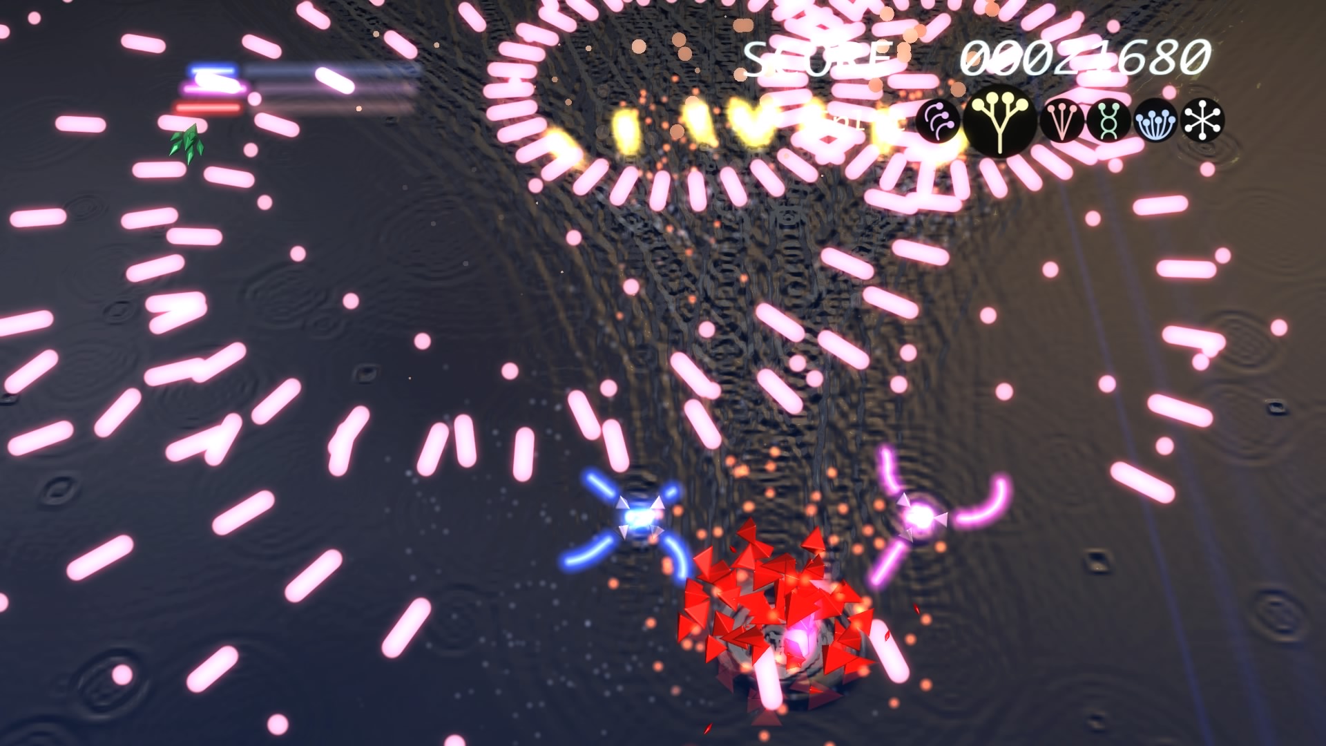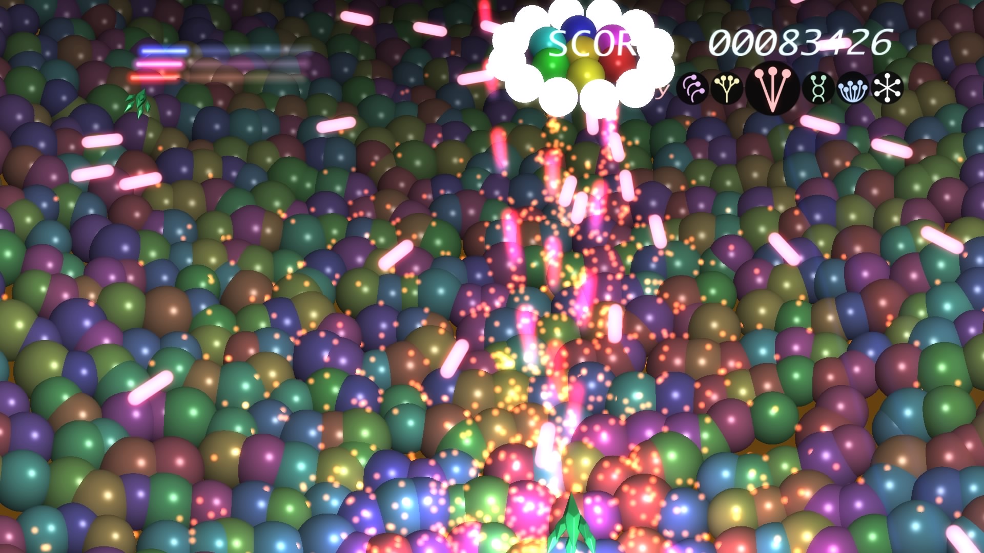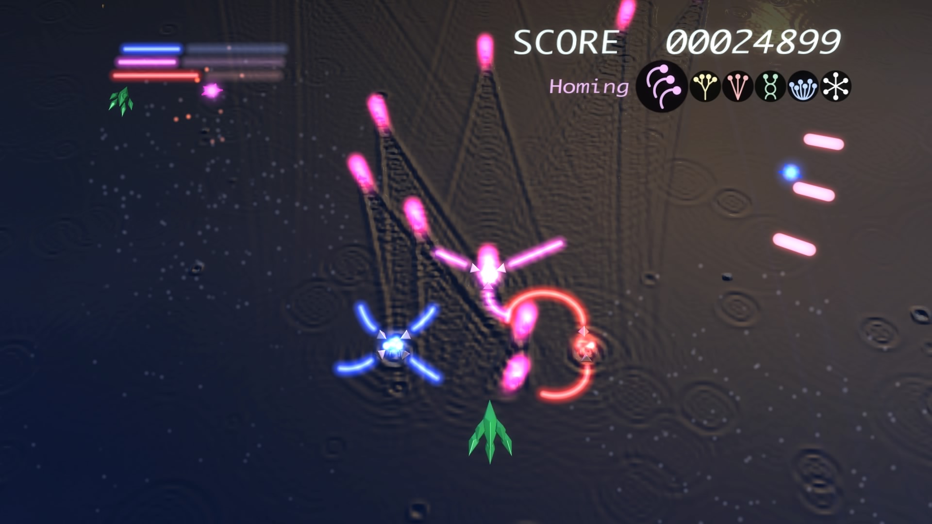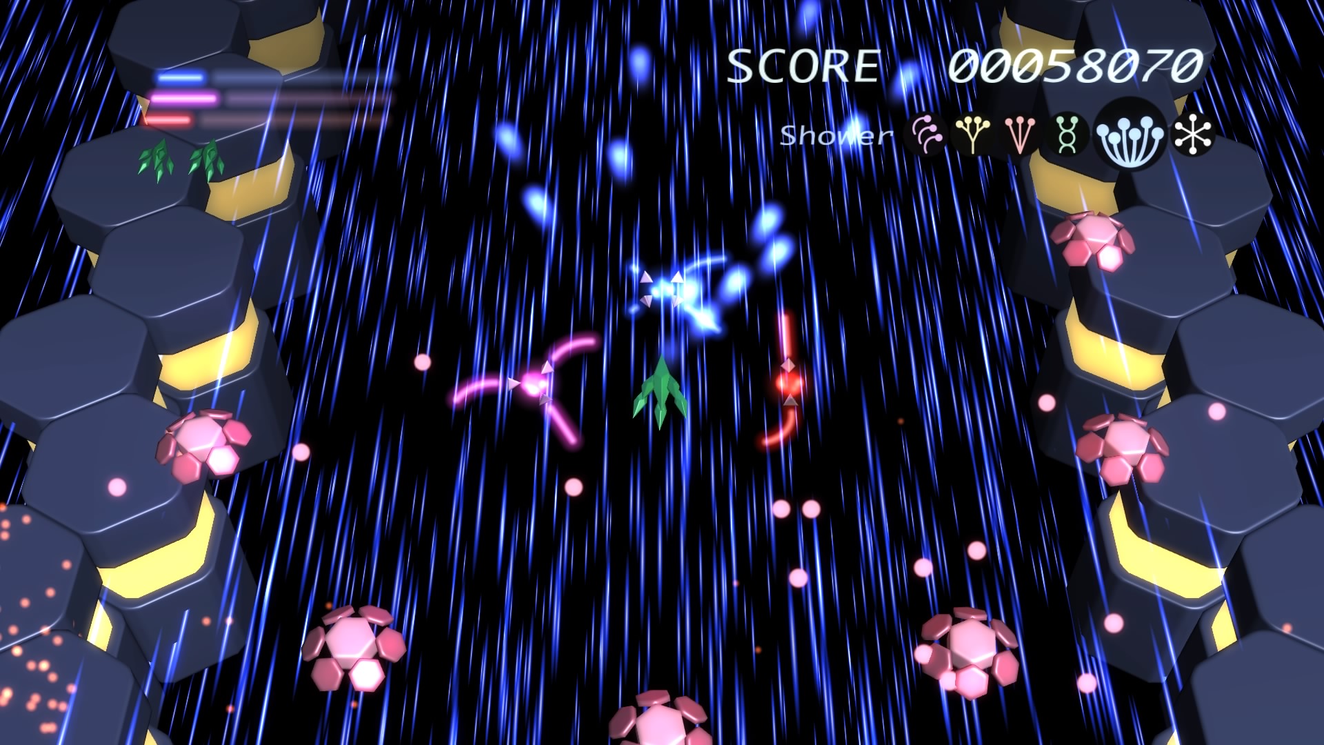 Ilość poziomów można policzyć na palcach jednej dłoni. No może dwóch, bo dokładnie jest ich 6. Wspomniane przeze mnie w poprzednim akapicie tarcze stanowią też źródło ataków specjalnych. Łącznie mamy 3 kolorowe specjały, którym odpowiadają 3 paski. Każdy pasek możemy napełnić zbierając podczas gry kolorowe power-upy. Za podstawowy strzał odpowiada trójkąt natomiast za pozostałe 3 ataki specjalne odpowiednio krzyżyk, kwadrat i kółko. Jeśli paski choć w niewielkim stopniu napełnimy możemy użyć mocy wybranego koloru. Trzeba jednak pamiętać, że zużywając je do cna tarcze również stają się mniejsze i pozostawiają więcej przestrzeni wokół nas przez co narażeni jesteśmy na bęcki od wroga.
