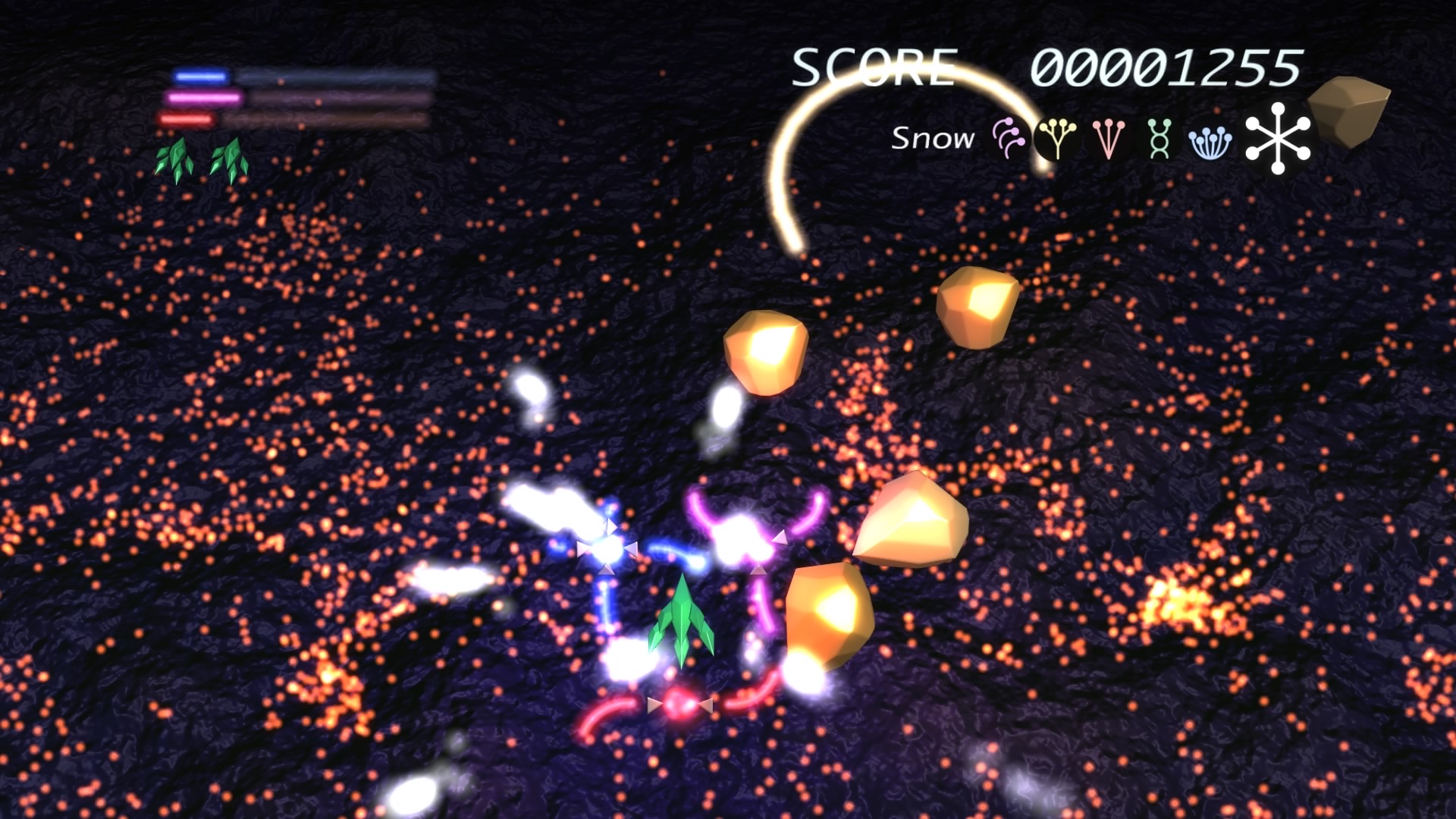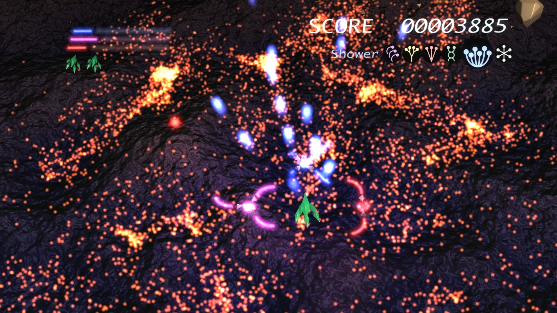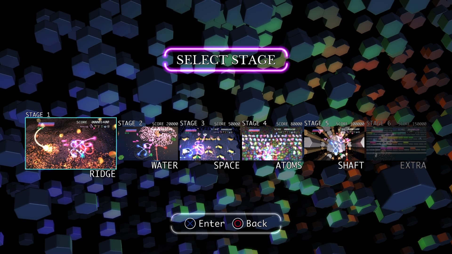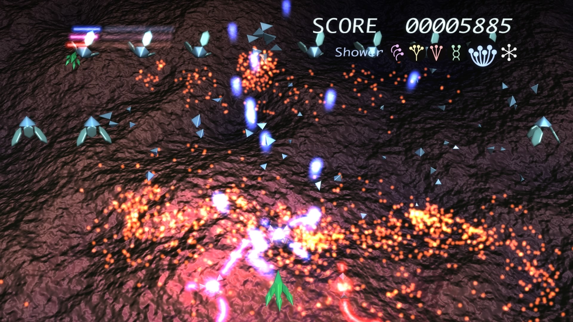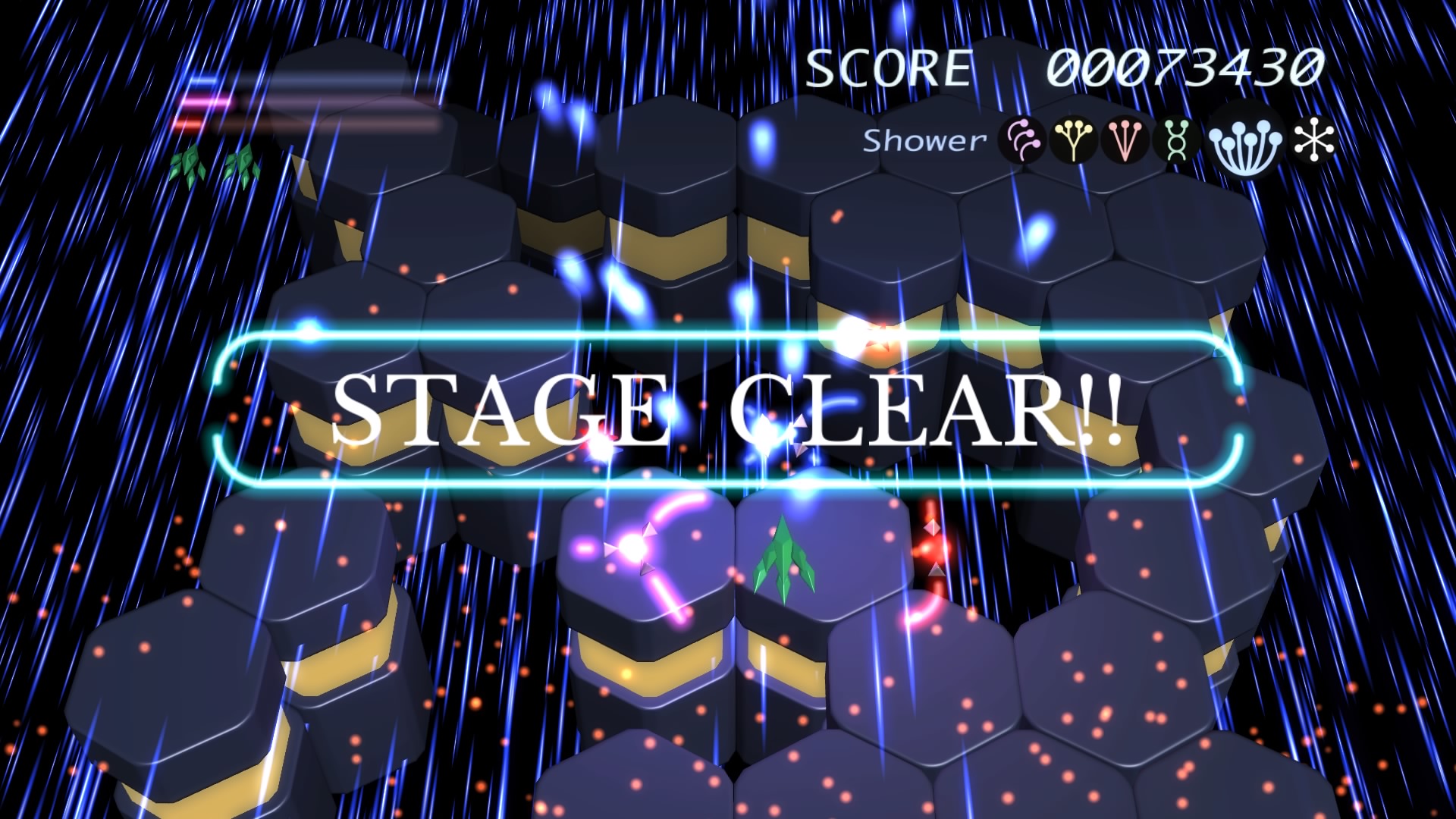 Ilość poziomów można policzyć na palcach jednej dłoni. No może dwóch, bo dokładnie jest ich 6. Wspomniane przeze mnie w poprzednim akapicie tarcze stanowią też źródło ataków specjalnych. Łącznie mamy 3 kolorowe specjały, którym odpowiadają 3 paski. Każdy pasek możemy napełnić zbierając podczas gry kolorowe power-upy. Za podstawowy strzał odpowiada trójkąt natomiast za pozostałe 3 ataki specjalne odpowiednio krzyżyk, kwadrat i kółko. Jeśli paski choć w niewielkim stopniu napełnimy możemy użyć mocy wybranego koloru. Trzeba jednak pamiętać, że zużywając je do cna tarcze również stają się mniejsze i pozostawiają więcej przestrzeni wokół nas przez co narażeni jesteśmy na bęcki od wroga.