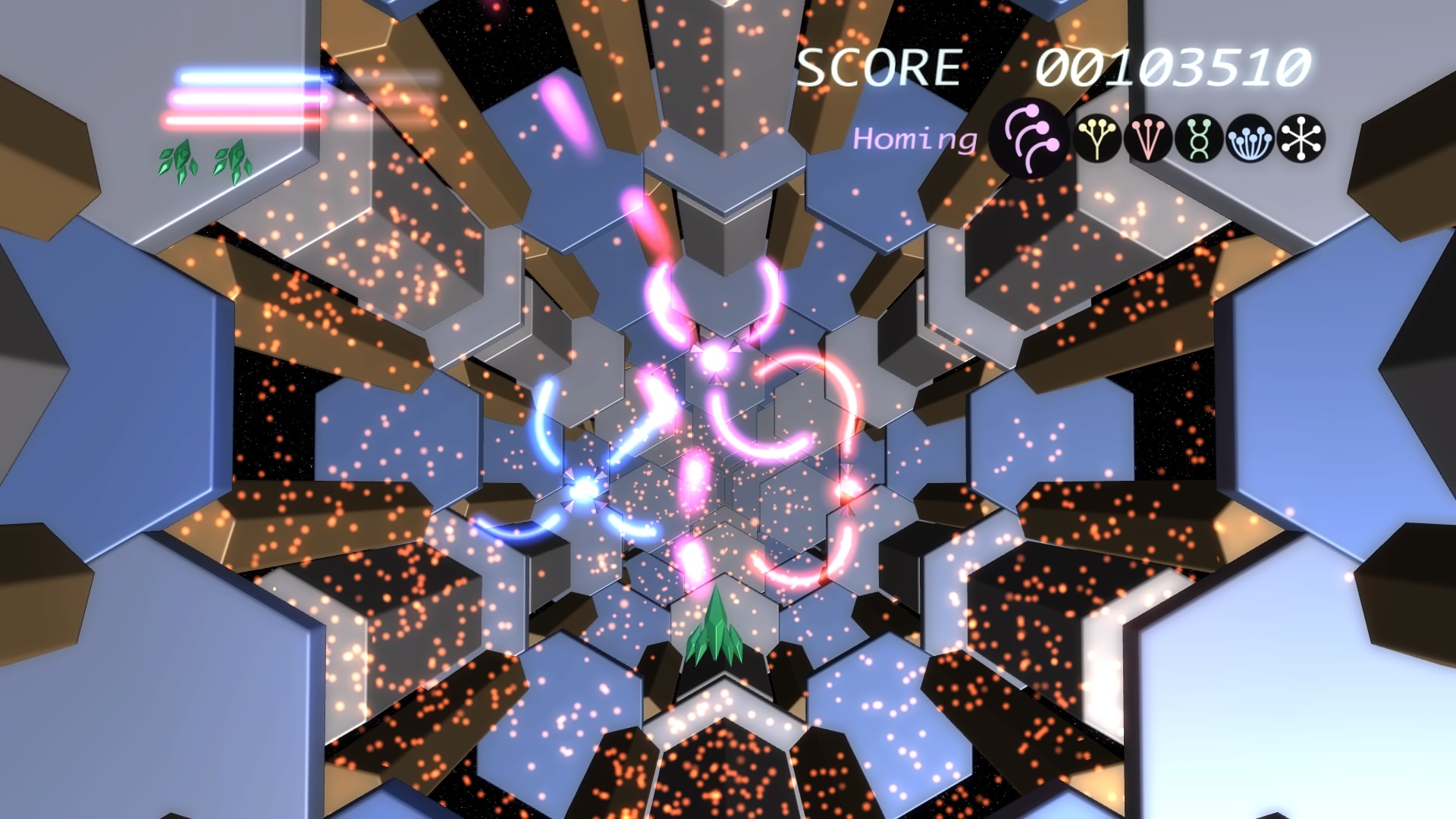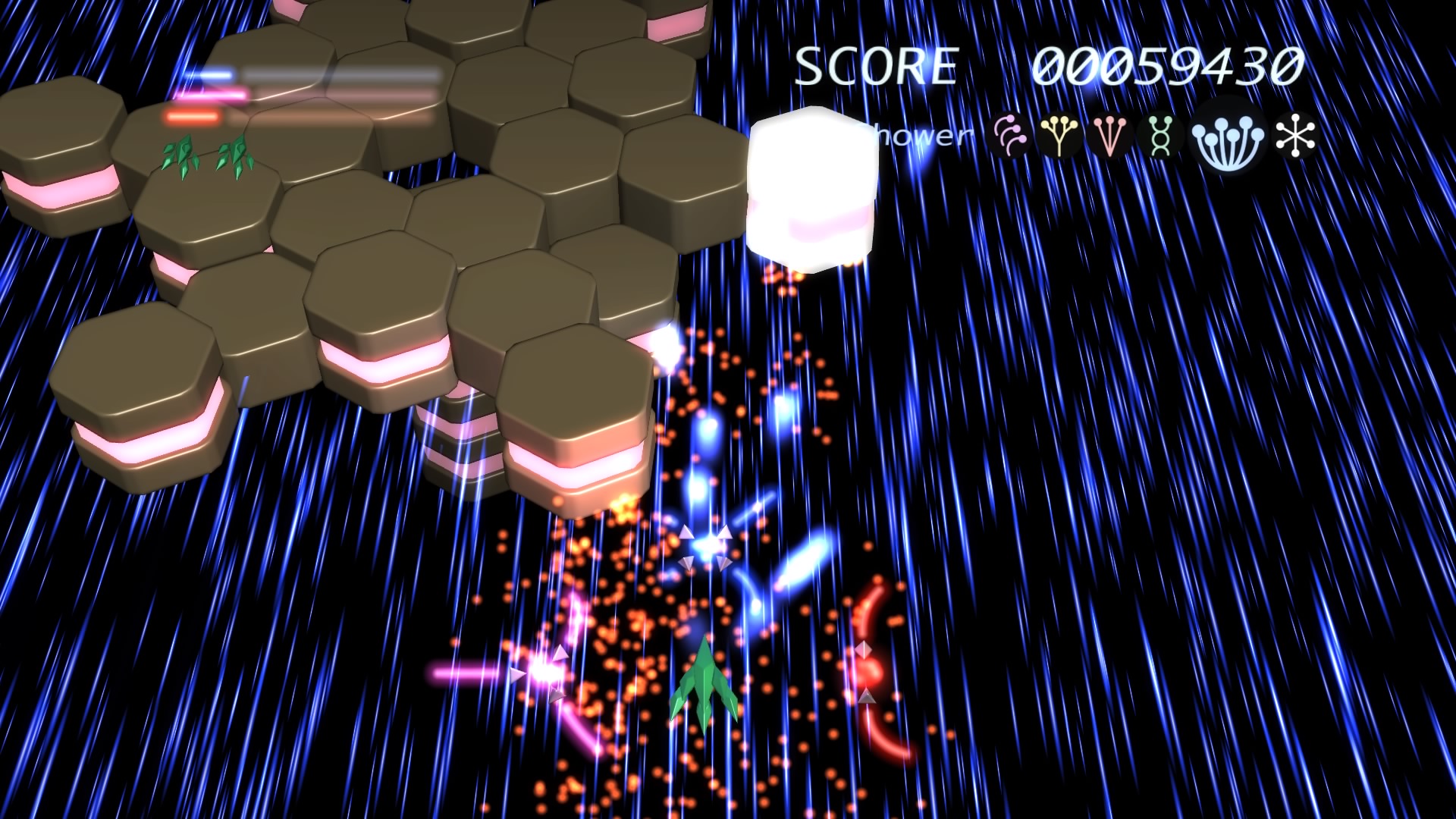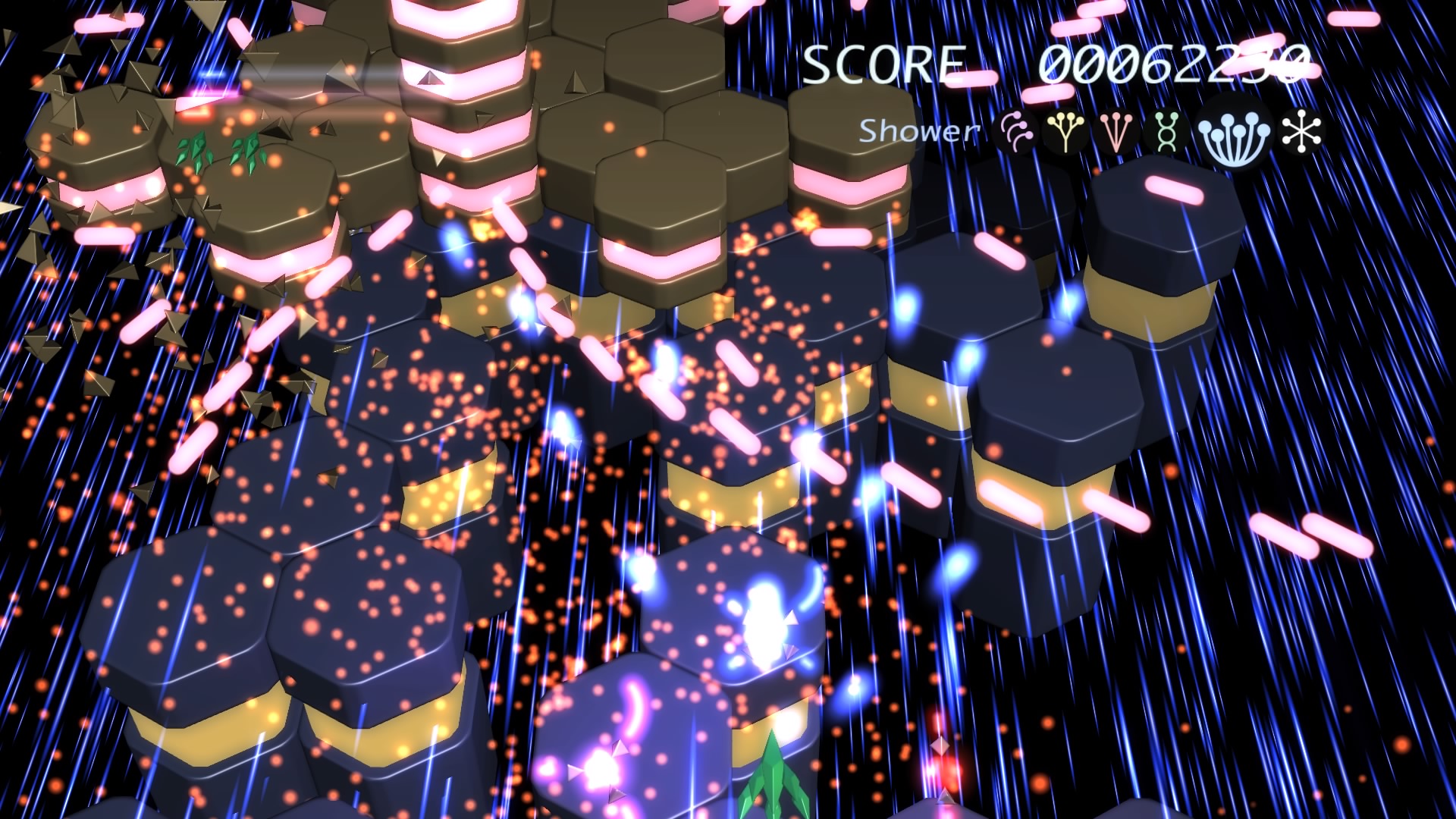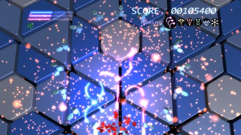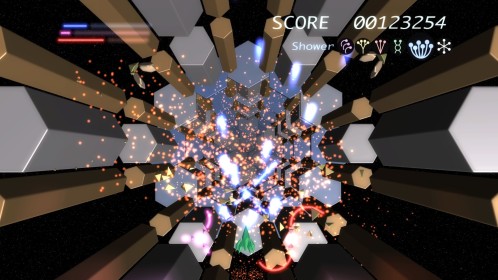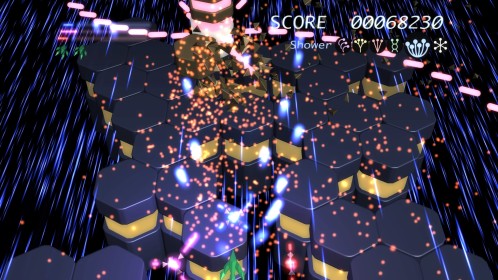 W grze wcielamy się w rolę pilota statku kosmicznego i przemierzamy nieco abstrakcyjny świat strzelając we wszystko, co się rusza. Dlaczego abstrakcyjny? A no dlatego, że cała przestrzeń kosmiczna zbudowana jest z różnego rodzaju brył i figur geometrycznych, co nie znaczy, że nie może on zachwycić. W każdej sytuacji, do naszej dyspozycji mamy 6 rodzajów broni. Wszystkie oczywiście jednakowo potężne. Różnią się one kątem pod jakim lecą pociski, a także ułożeniem figur (coś w rodzaju tarcz), które chronią nasz zadek. Ciężko to oczywiście wytłumaczyć, ale przeglądając galerię fotek, którą przygotowałam zobaczycie, co mam na myśli. Kluczem do sukcesu i ukończenia poziomów jest umiejętne przełączanie się pomiędzy broniami i odpowiednie manipulowanie geometrycznymi tarczami. Istnieją bowiem sytuacje, w których przeciwnicy wysyłają w nas wiązkę strzał zapełniających cały ekran. Nie można byłoby ich uniknąć, gdyby nie wspomniane tarcze, które nas otaczają.