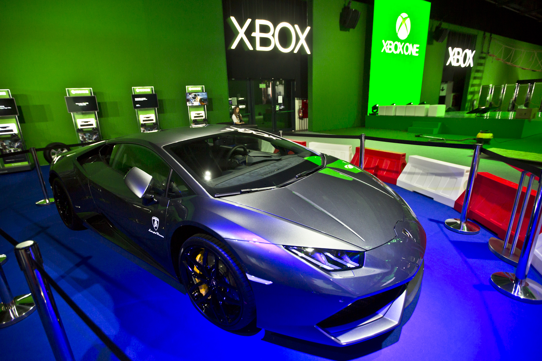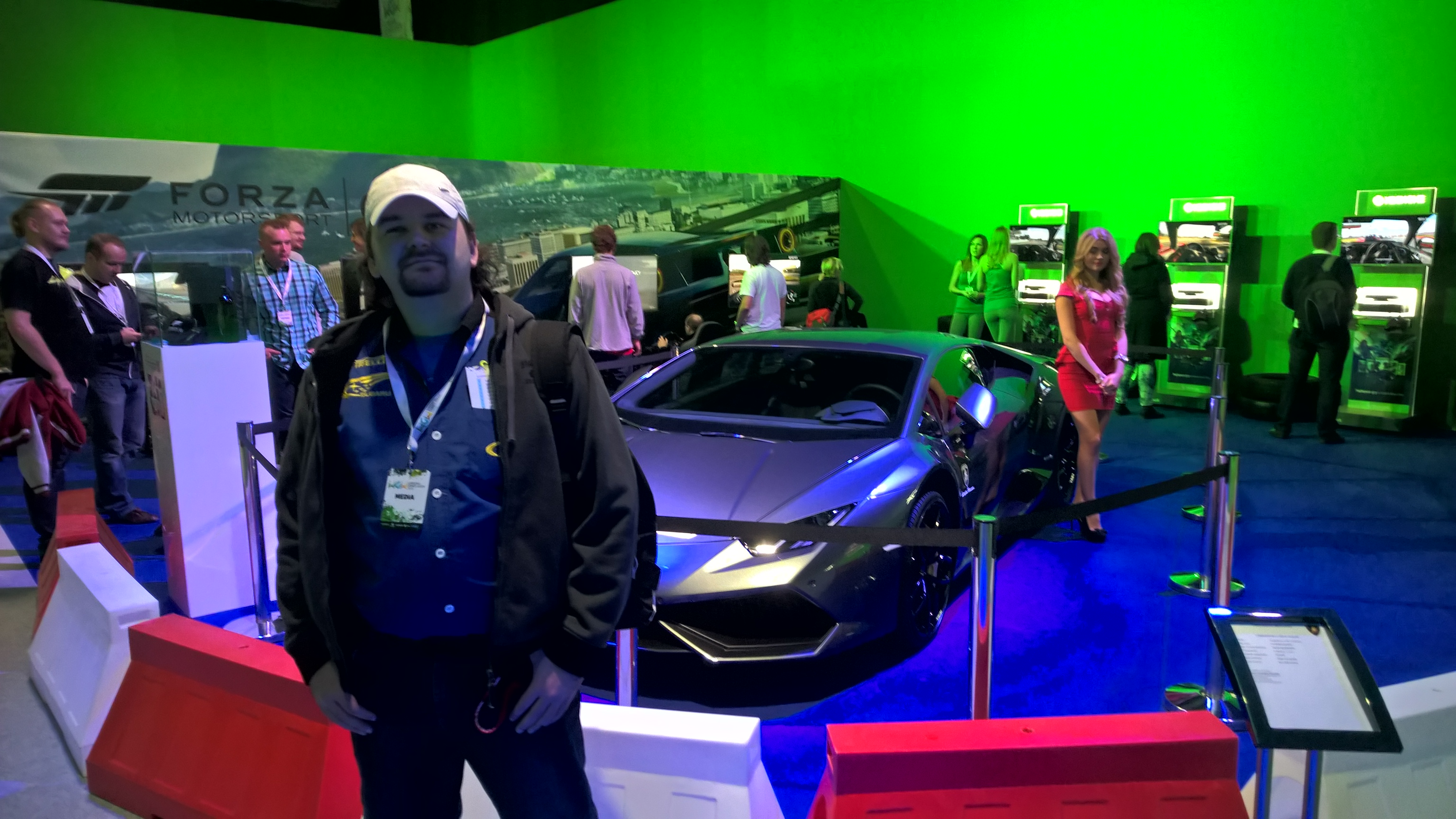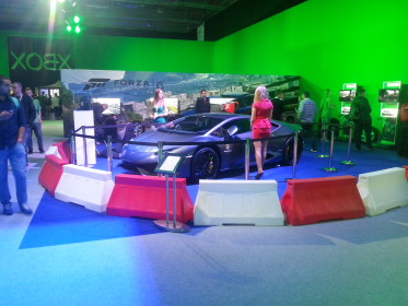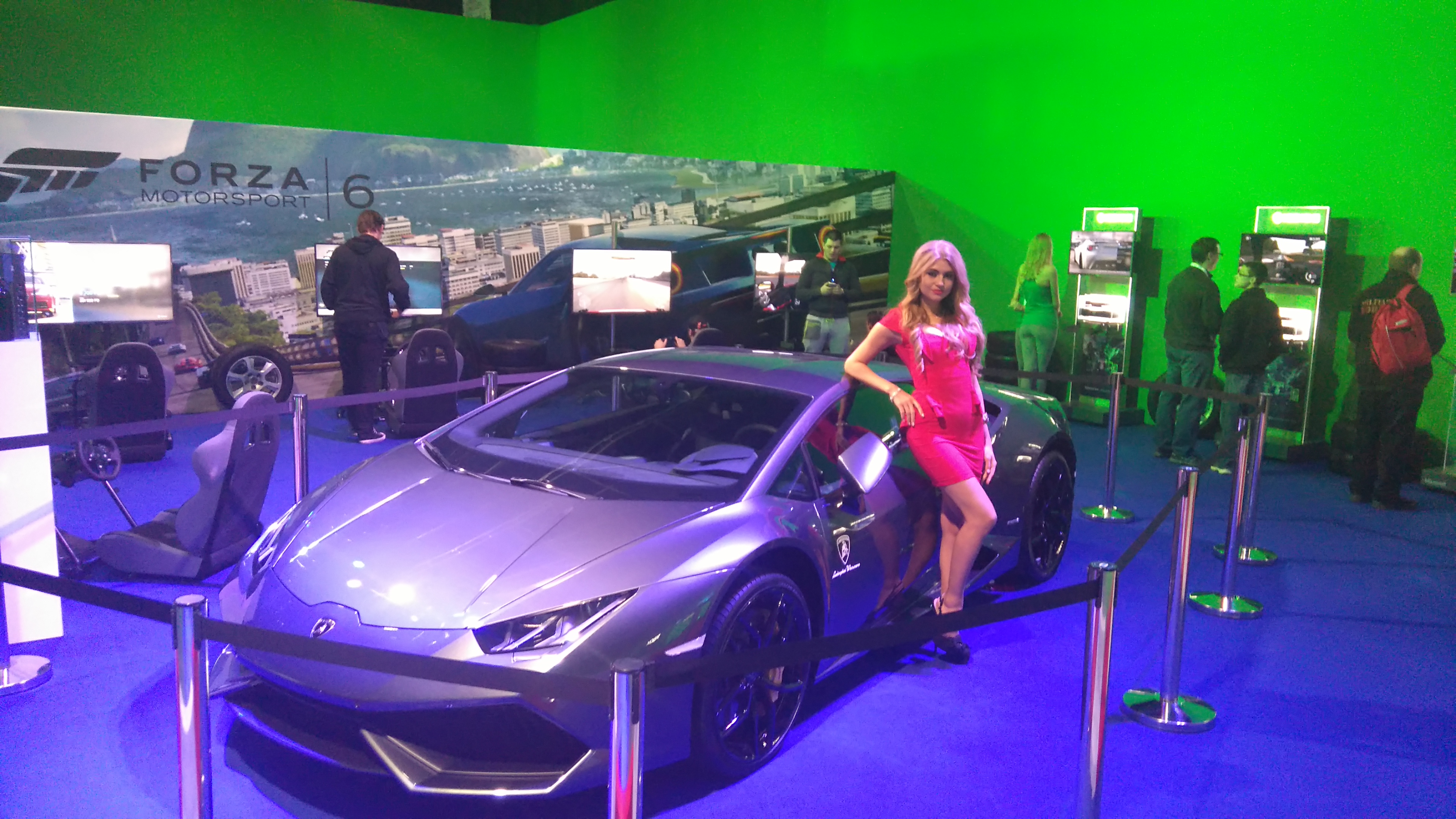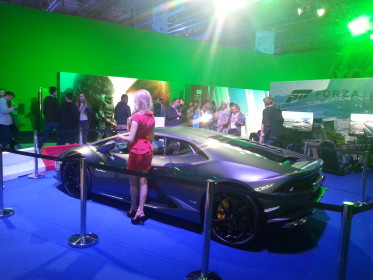 Nie zapomniano też o Forzie. Można było pościgać się korzystając z profesjonalnych foteli i kierownic. Oczy cieszyło również postawione obok Lamboghini oraz dzielnie stojąca obok hostessa.