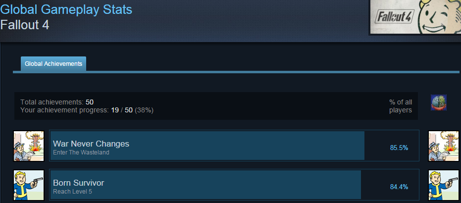 Tak przynajmniej wynika z statystyk osiągnięć na platformie Steam. Osiągnięcie przyznawane za wyjście ze schronu będzie dla wielu graczy pierwszym jakie zdobyli w najnowszej grze Bethesdy. Można je zdobyć grając w grę kilkanaście minut. Jak widzicie na poniższym zrzucie ekranu osiągnięcie zdobyło jedynie 85,5% graczy. To oznacza, że 14,5 % graczy, którzy zakupili Fallouta 4 nie doszło nawet do tego momentu.