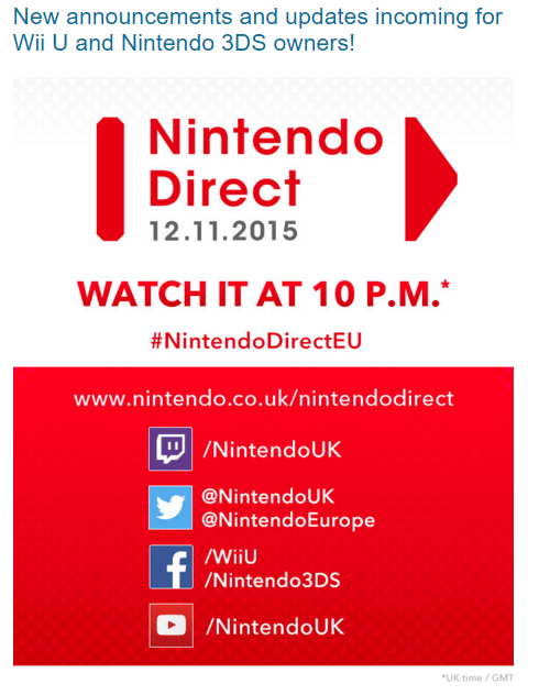 Nintendo potwierdziło, że najbliższy Nintendo Direct odbędzie się już 12 listopada 2015 o godzinie 23:00 czasu polskiego. Firma przekaże na nim informacje na temat nadchodzących w najbliższym czasie produkcji dla konsol Wii U oraz 3DS.