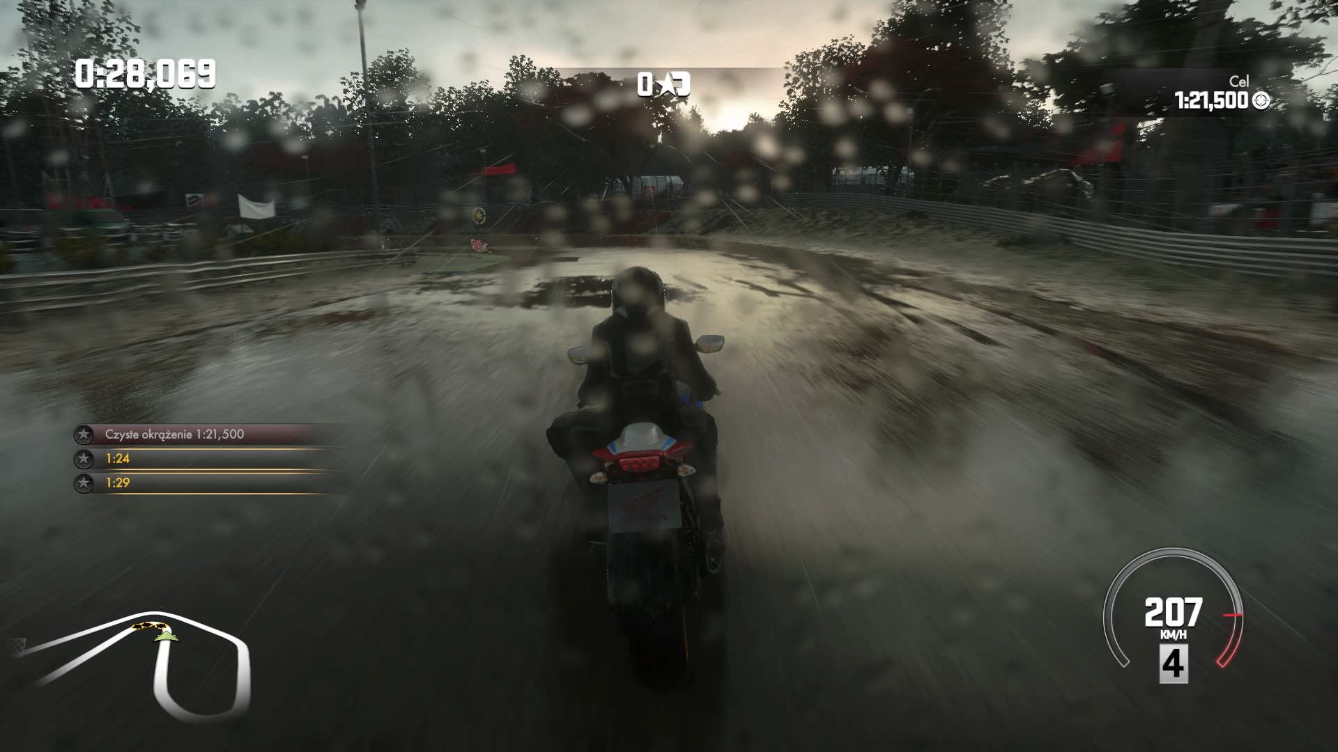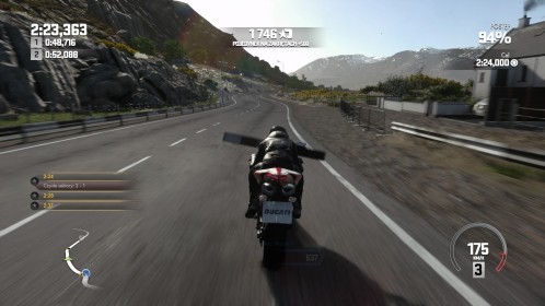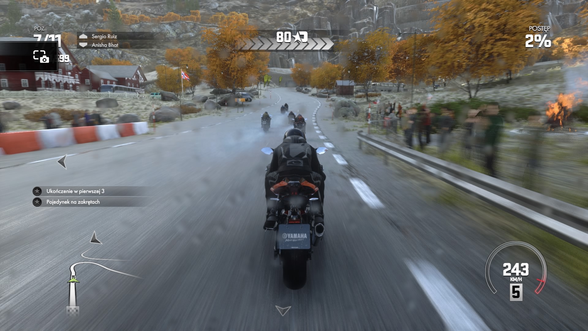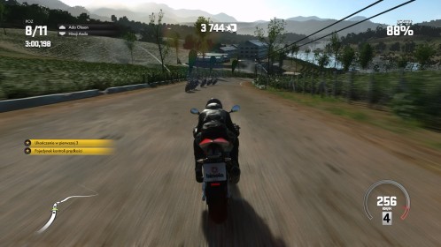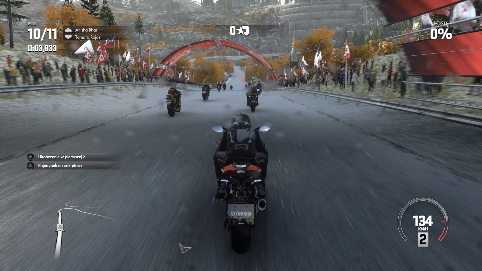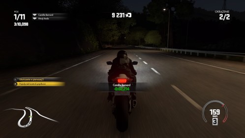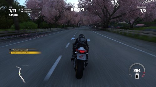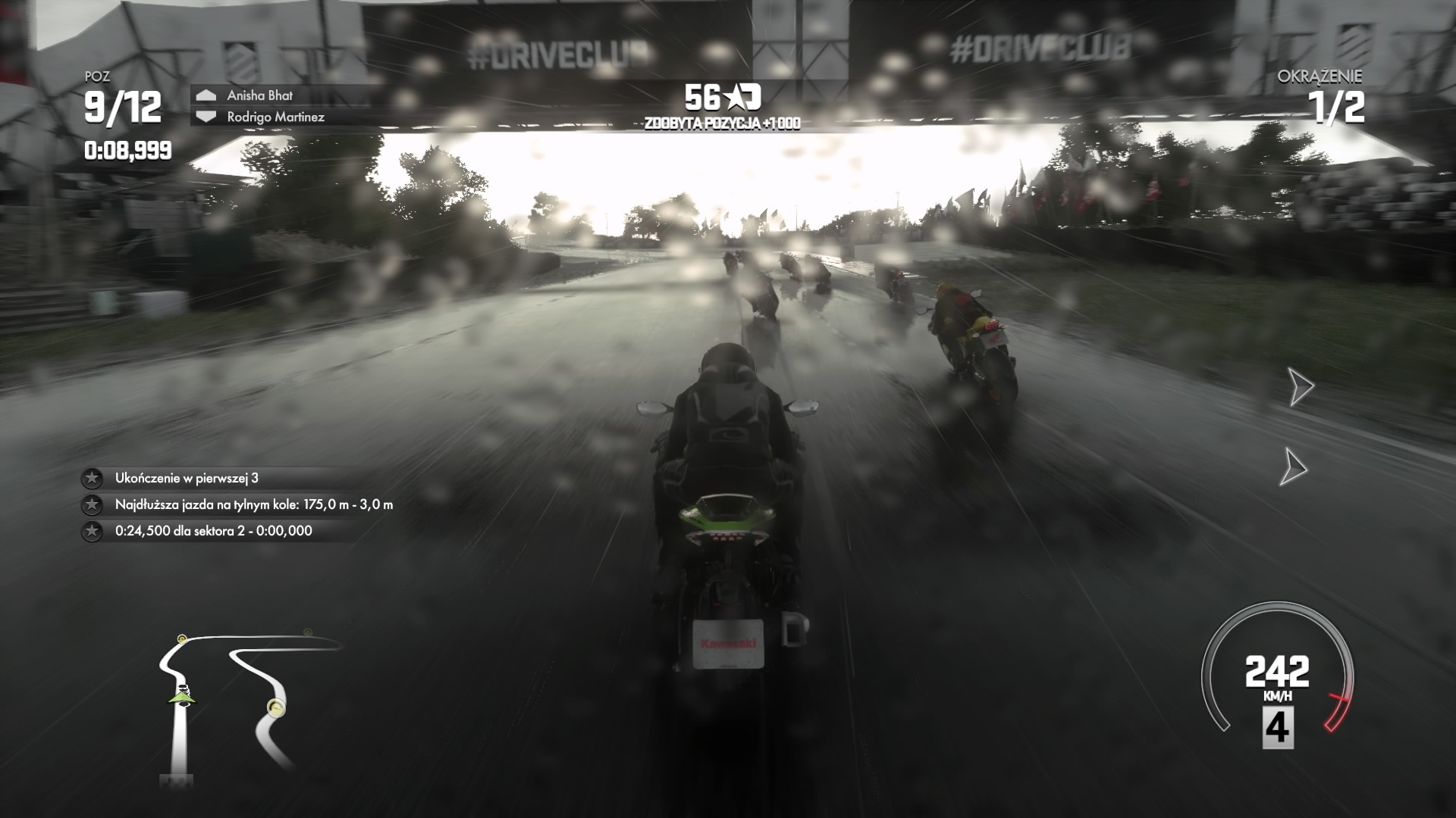 Model jazdy znajduje się gdzieś na pograniczu typowo arcadowego i symulacji. Nie jest ciężko, ale też nie jest zupełnie łatwo. Władanie maszyną zależy przede wszystkim od jej mocy – tak jak i w życiu. “Rozpędzić się jest łatwo, ale zatrzymać się możesz nie mieć już okazji”. Motocykle niższej klasy można opanować dużo szybciej, niemniej jednak nie wystarczy dusić wyłącznie gazu i pokonywać zakręty na uślizgu. To na pewno nie skończy się dla nikogo dobrze. Jeśli już mowa o tym, to warto zaznaczyć, że nie oglądamy gleby naszego zawodnika. Zamiast latających kukieł, które już widywaliśmy w innym motocyklowych ścigałkach, widzimy ekran z napisem Driveclub i maszyna zostaje postawiono do pionu, a my tylko wąchamy smród spalonych opon przeciwników, którzy właśnie nas minęli.