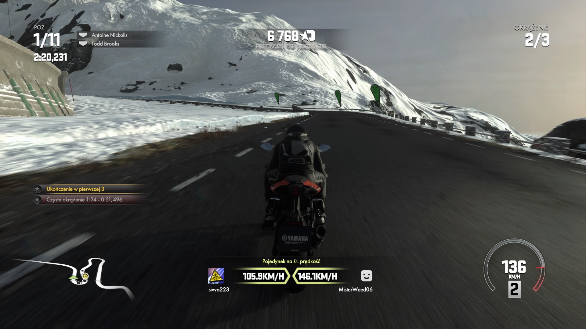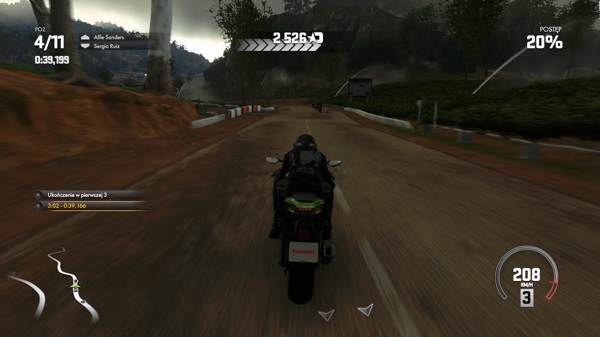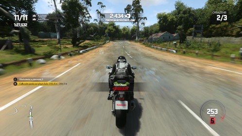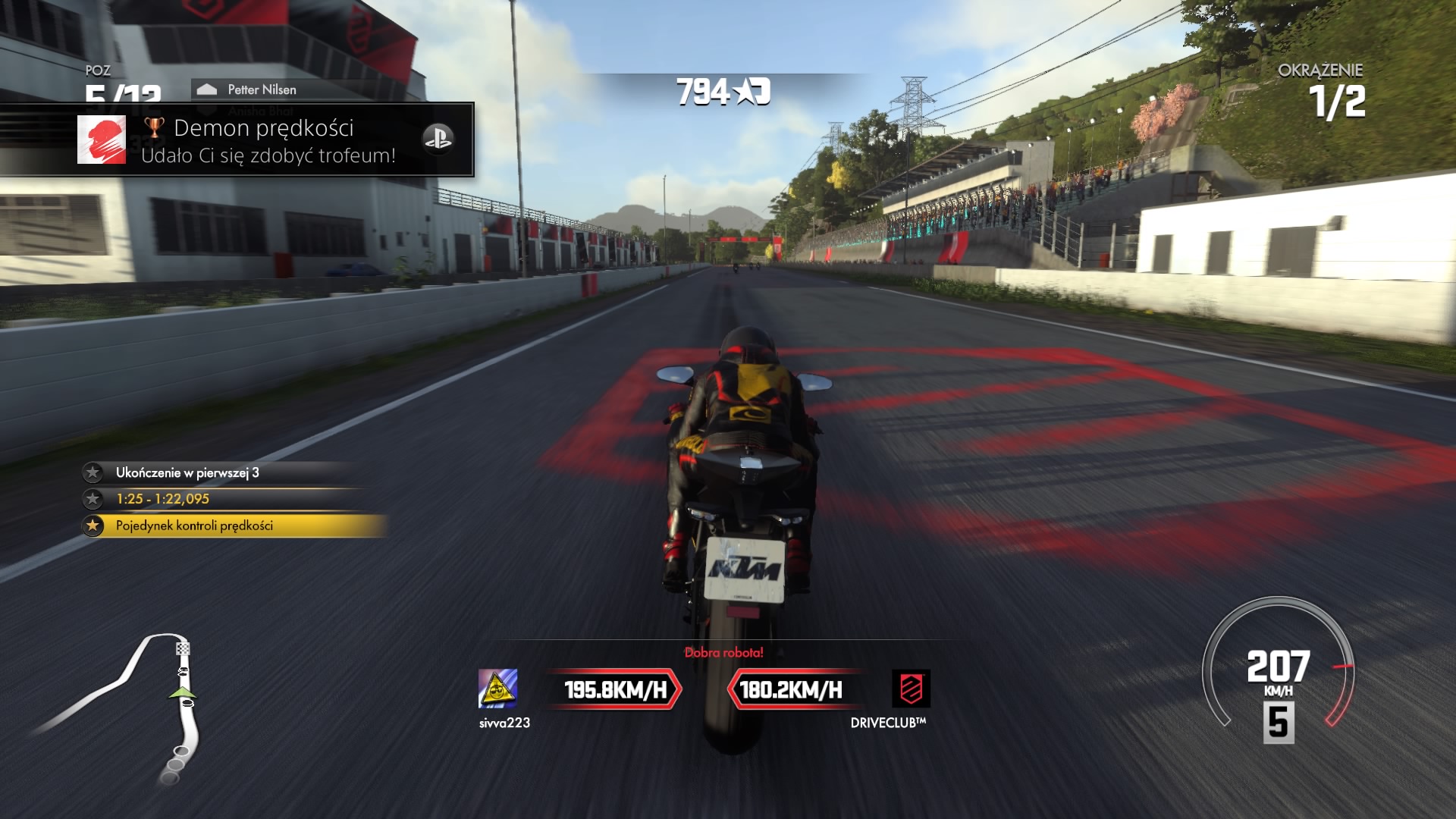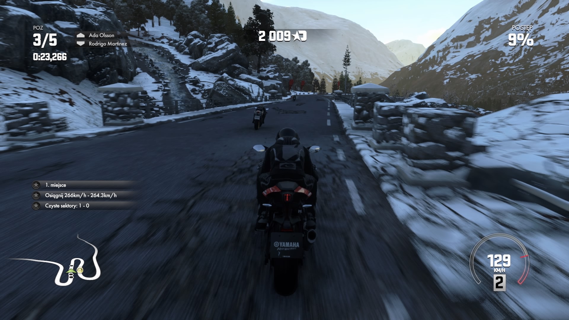 Model jazdy znajduje się gdzieś na pograniczu typowo arcadowego i symulacji. Nie jest ciężko, ale też nie jest zupełnie łatwo. Władanie maszyną zależy przede wszystkim od jej mocy – tak jak i w życiu. “Rozpędzić się jest łatwo, ale zatrzymać się możesz nie mieć już okazji”. Motocykle niższej klasy można opanować dużo szybciej, niemniej jednak nie wystarczy dusić wyłącznie gazu i pokonywać zakręty na uślizgu. To na pewno nie skończy się dla nikogo dobrze. Jeśli już mowa o tym, to warto zaznaczyć, że nie oglądamy gleby naszego zawodnika. Zamiast latających kukieł, które już widywaliśmy w innym motocyklowych ścigałkach, widzimy ekran z napisem Driveclub i maszyna zostaje postawiono do pionu, a my tylko wąchamy smród spalonych opon przeciwników, którzy właśnie nas minęli.