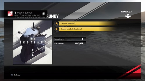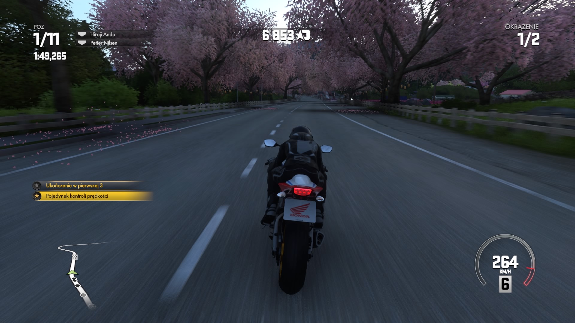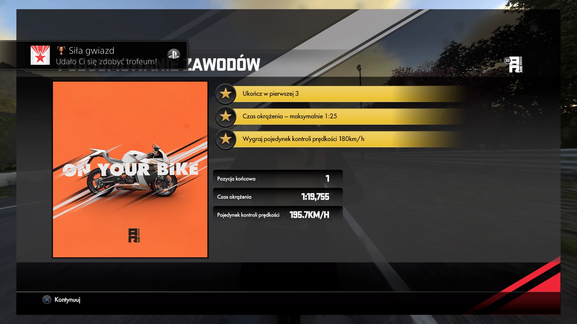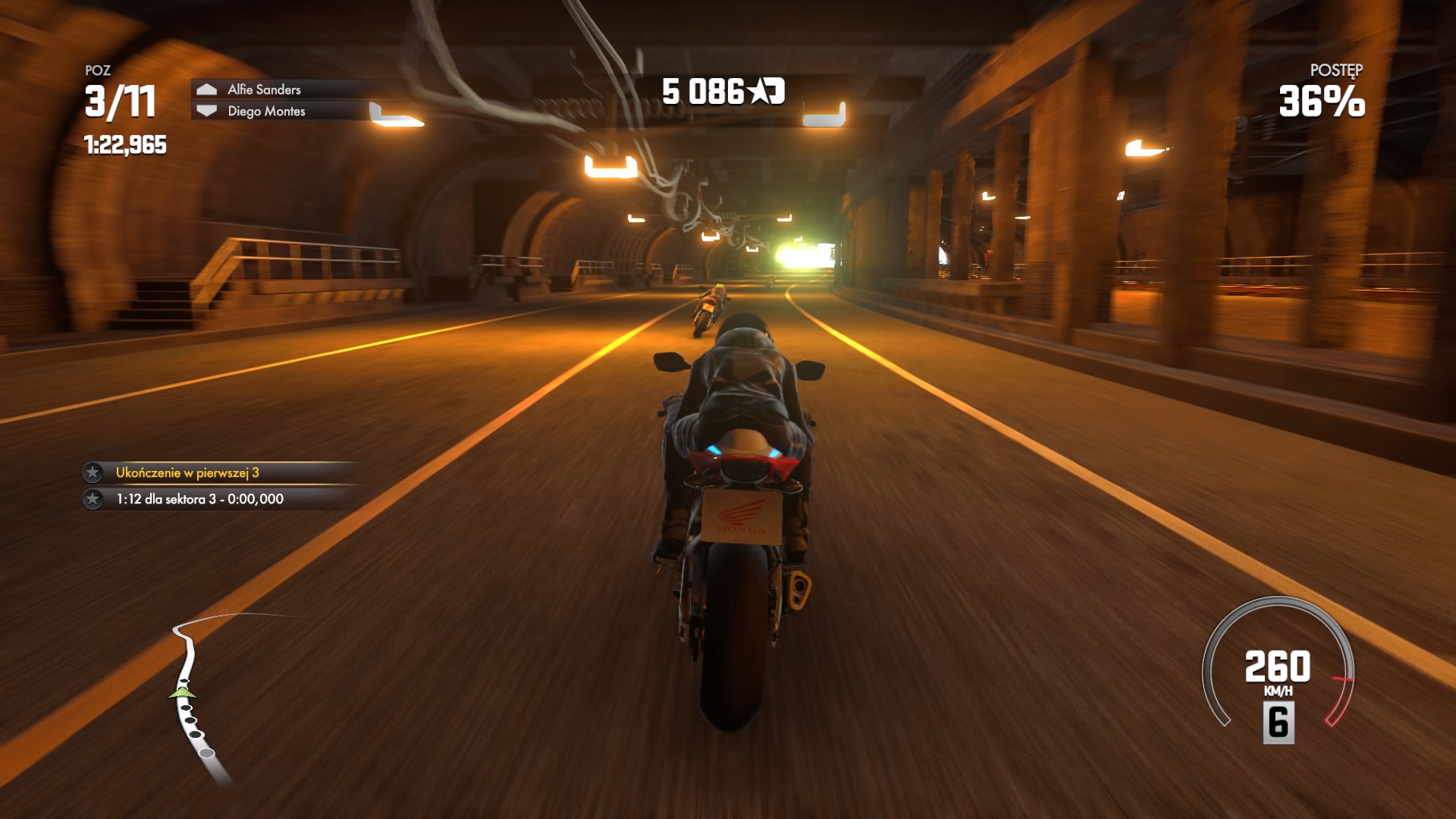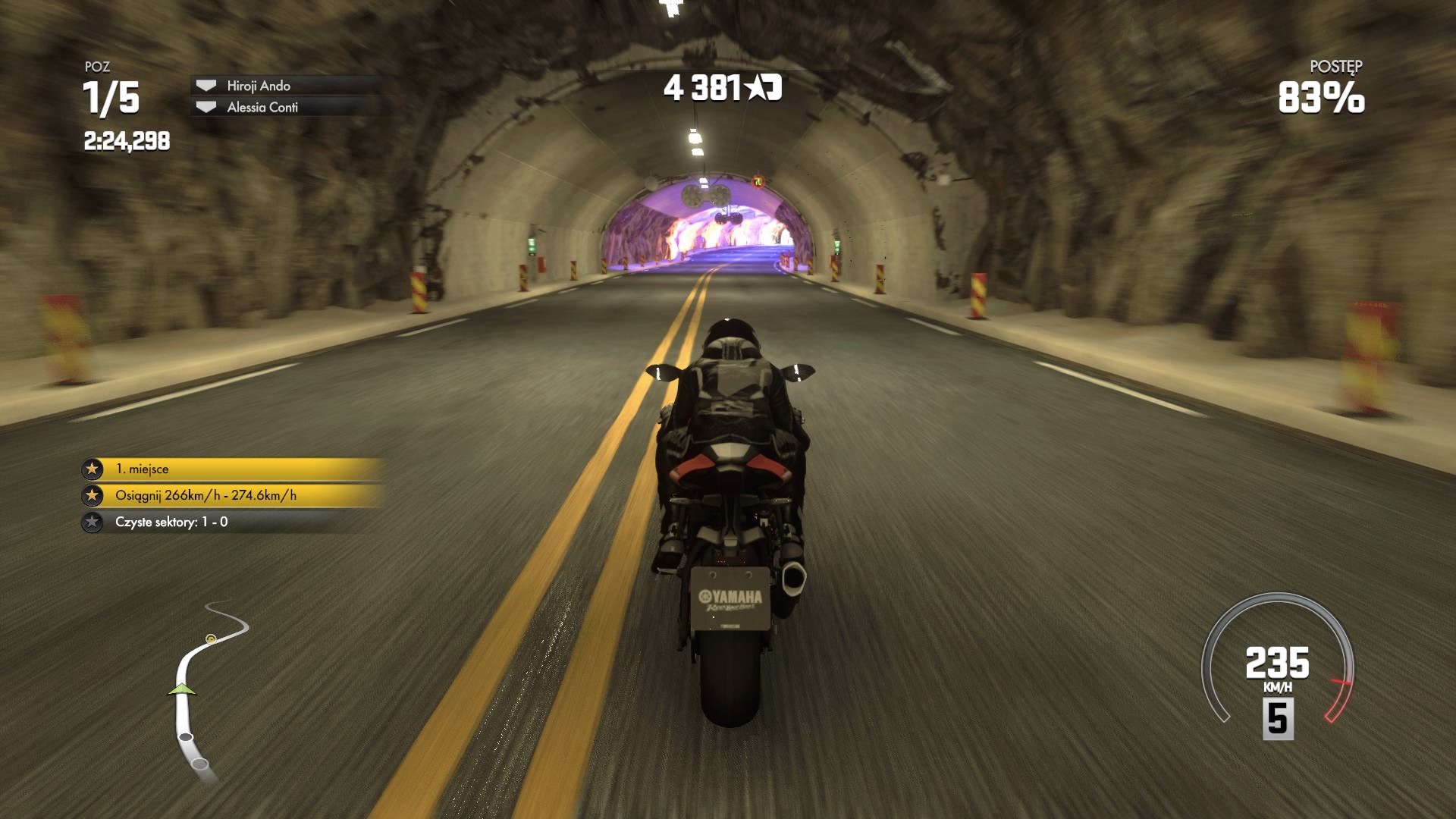 W trybie Tour mamy do zdobycia 162 gwiazdki, co przekłada się na 54 zawody o różnym stopniu trudności i w różnym rodzaju. Sporo… Oprócz tego są także pojedyncze zawody, na które składają się zwykłe, tradycyjne wyścigi, sprinty na krótkich odcinkach, próby czasowe oraz to co w przypadku samochodów nazywało się driftem tutaj jest nazwane “biegłością”. O co w tym chodzi? Jest to względnie krótki odcinek trasy, który pokonujemy w czasie do 30 sekund. Po drodze musimy w odpowiednich miejscach przejechać się na tylnym lub przednim kole czy też uzyskać docelową prędkość tak, aby fotoradar cyknął nam fotkę. Za każdy ten element otrzymujemy punkty, które z kolei przekładają się na ostateczną liczbę gwiazdek, które zdobędziemy z tegoż wyzwania.