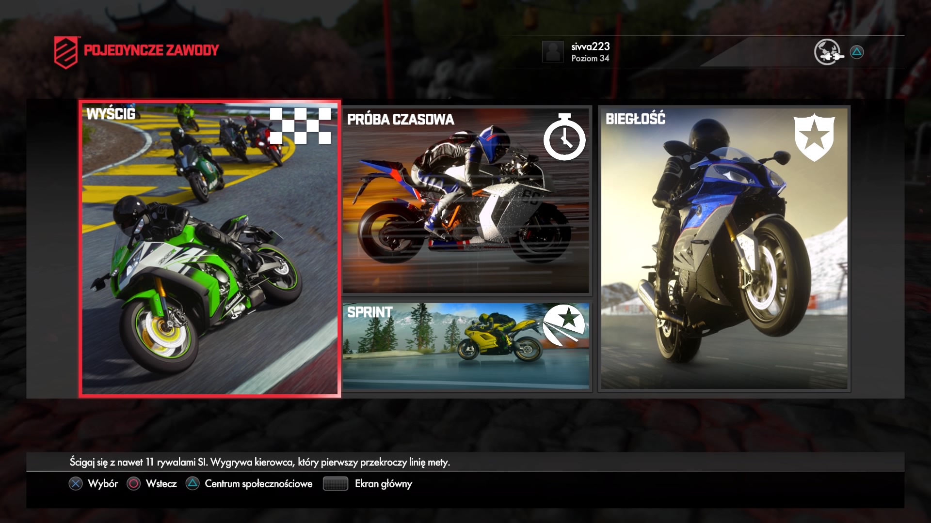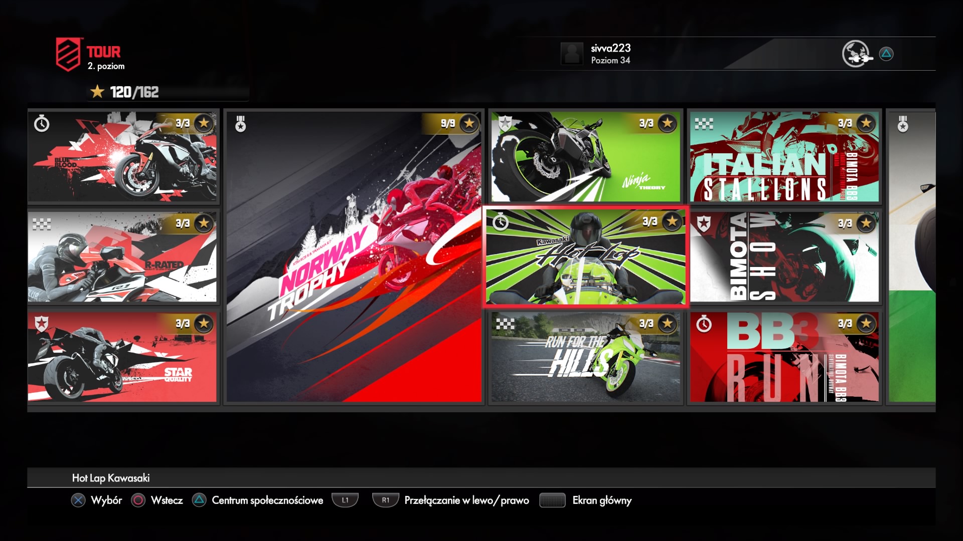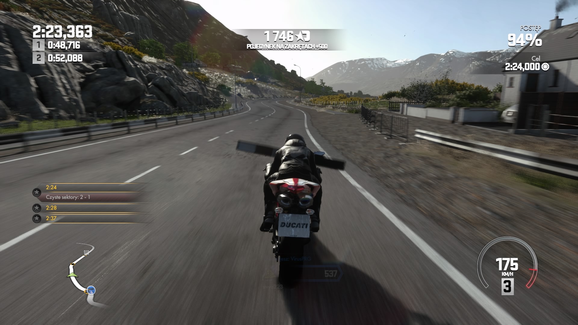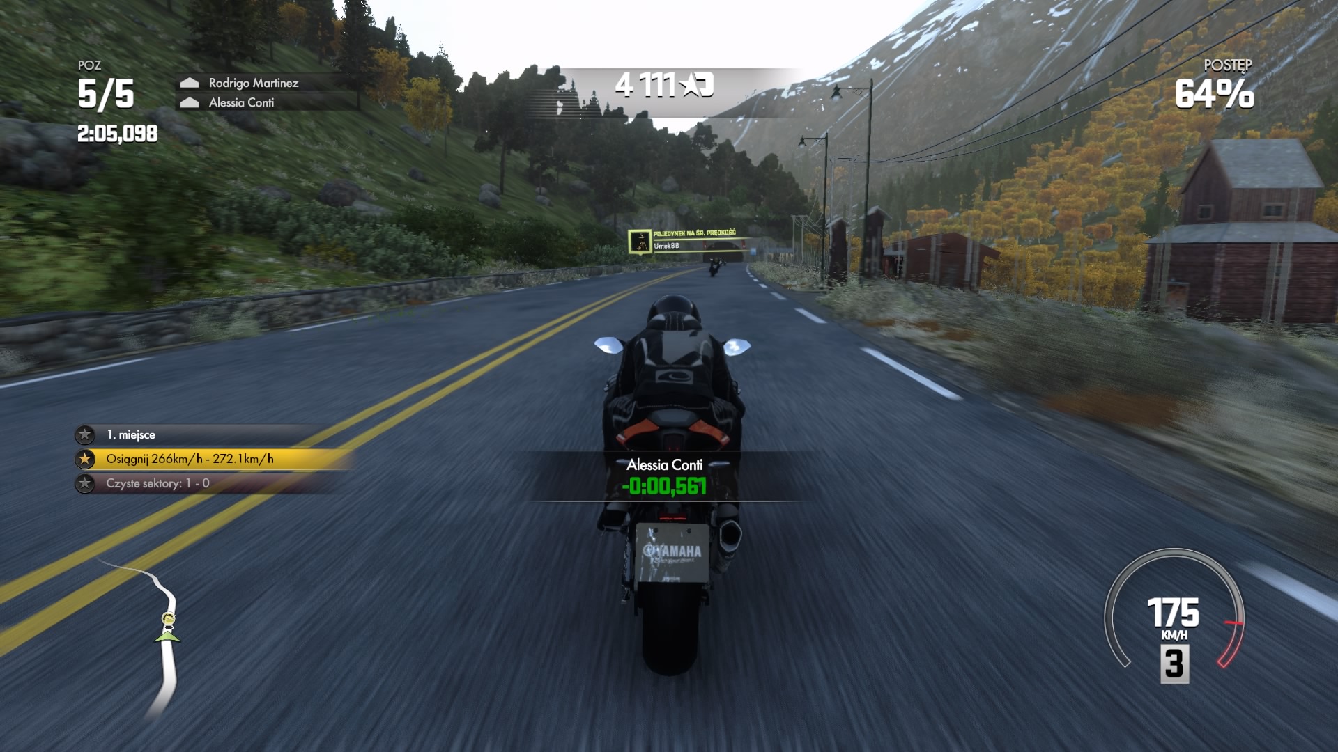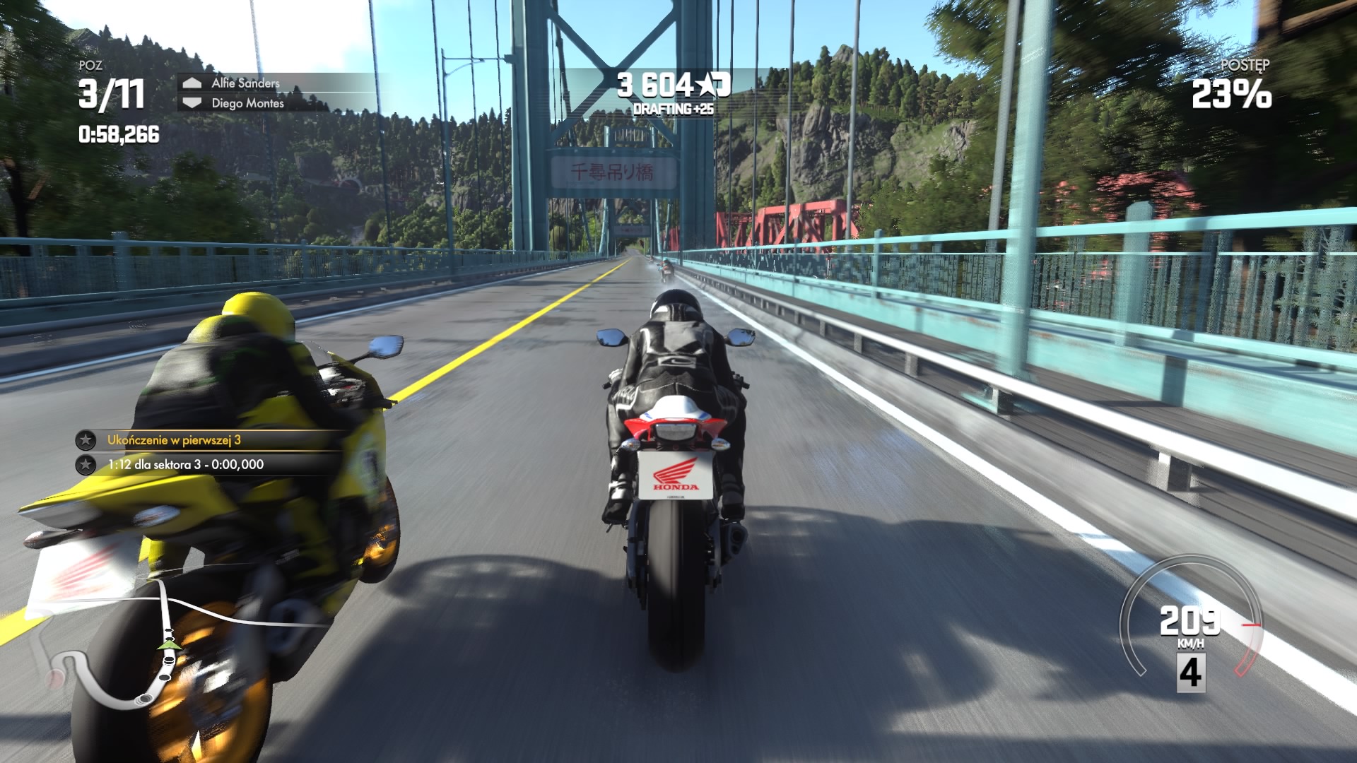 W trybie Tour mamy do zdobycia 162 gwiazdki, co przekłada się na 54 zawody o różnym stopniu trudności i w różnym rodzaju. Sporo… Oprócz tego są także pojedyncze zawody, na które składają się zwykłe, tradycyjne wyścigi, sprinty na krótkich odcinkach, próby czasowe oraz to co w przypadku samochodów nazywało się driftem tutaj jest nazwane “biegłością”. O co w tym chodzi? Jest to względnie krótki odcinek trasy, który pokonujemy w czasie do 30 sekund. Po drodze musimy w odpowiednich miejscach przejechać się na tylnym lub przednim kole czy też uzyskać docelową prędkość tak, aby fotoradar cyknął nam fotkę. Za każdy ten element otrzymujemy punkty, które z kolei przekładają się na ostateczną liczbę gwiazdek, które zdobędziemy z tegoż wyzwania.
