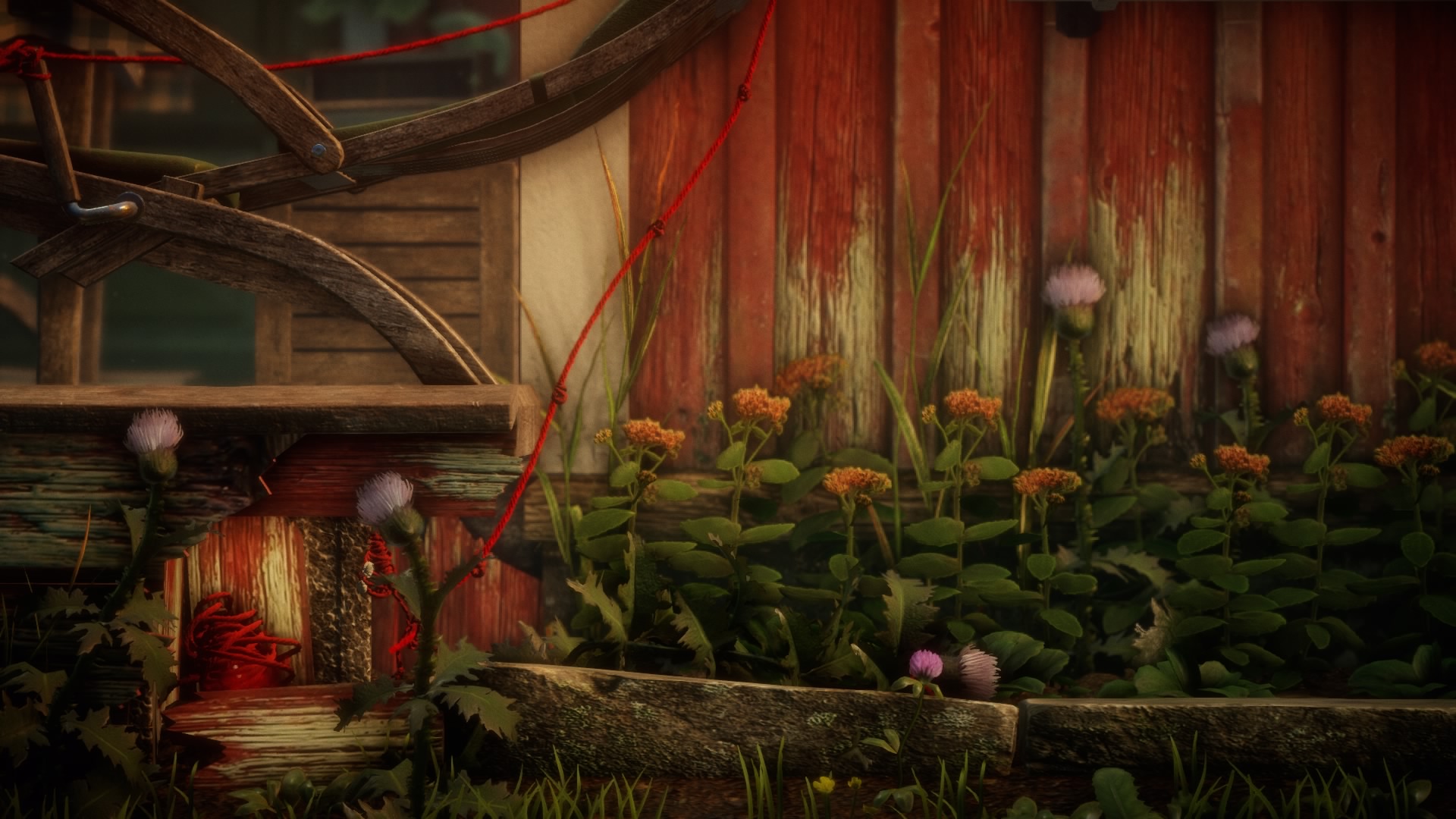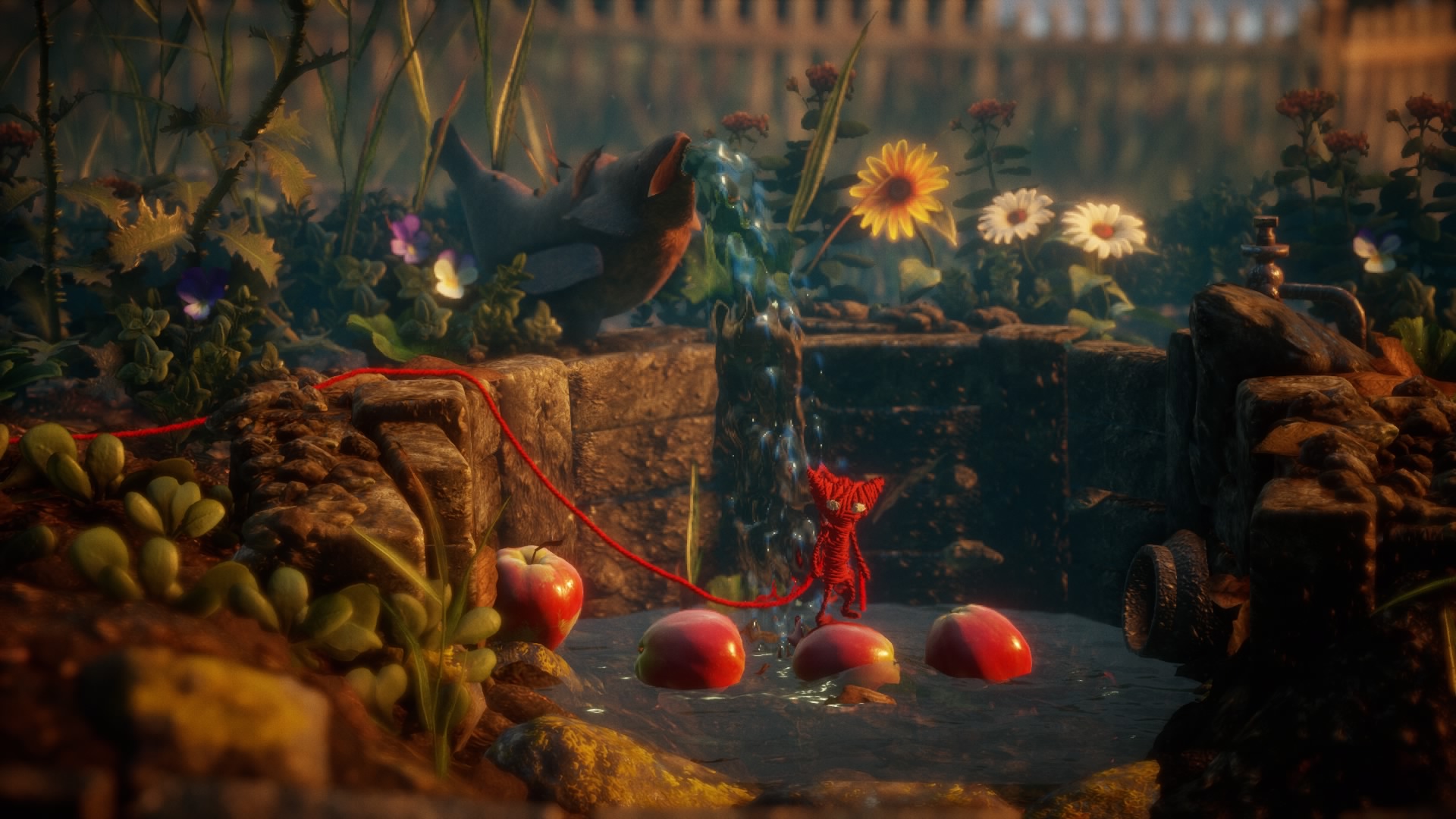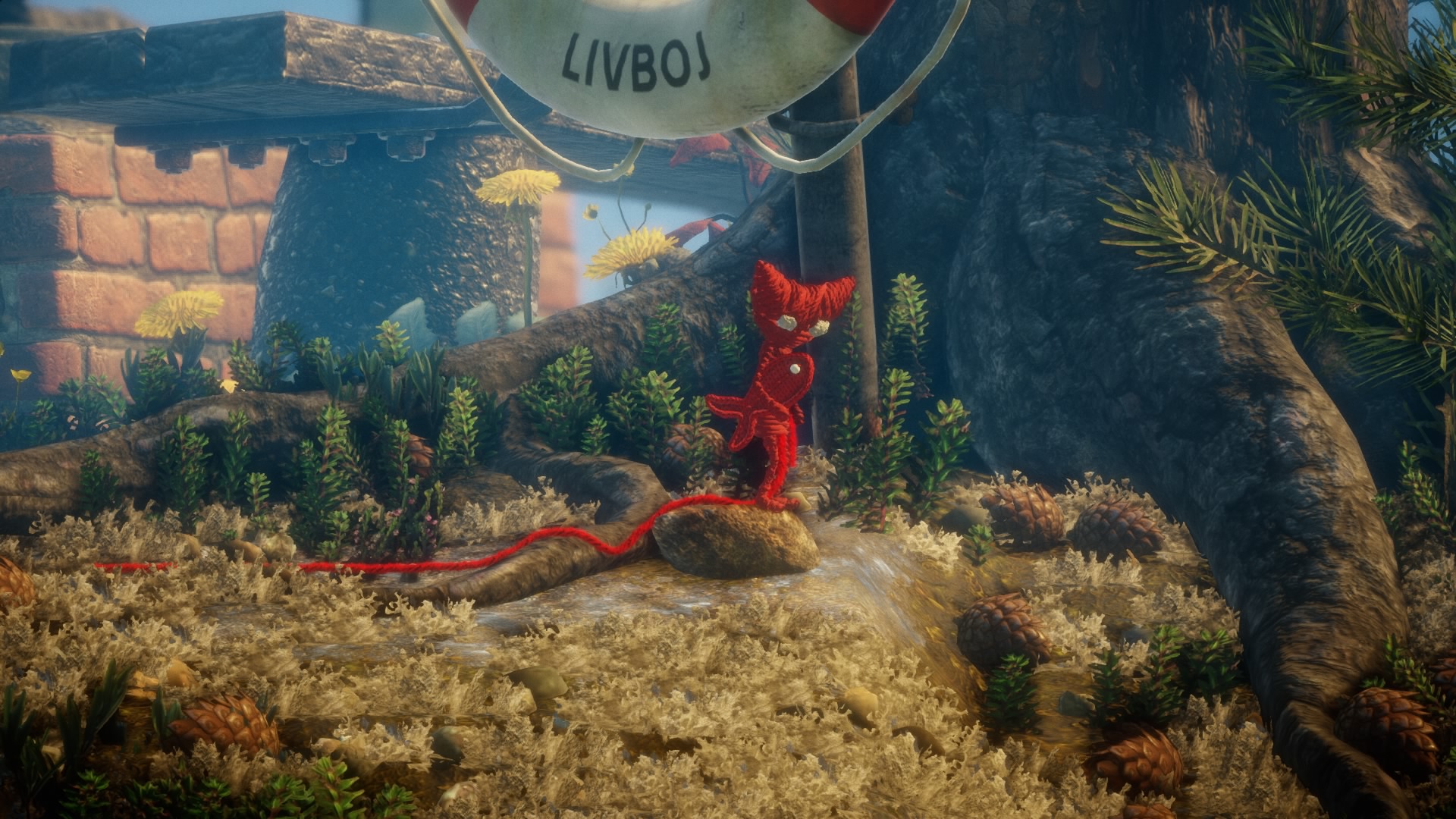 Unravel w fantastyczny sposób pokazuje, że można zrobić przepiękną grę na konsolach, jestem ciągle pod ogromnym wrażeniem, w jaki realistyczny sposób została zaprezentowana roślinność. Wszystko tutaj jest wykonane idealnie, nawet takie najdrobniejsze szczegóły jak źdźbła traw, mech na skałach, przepiękna woda, szyszki, jabłka, pojedyncze liście, kwiaty – mogę tak zachwycać się modelami 3D cały dzień. Odwzorowanie fizyki jest kolejną zaletą tej gry. Duże wrażenie zrobiły na mnie jesienne i zimowe poziomy. Jesienią mamy już zamarznięte małe zbiorniki wodne, gdy Yarny podskoczy na takim cienkim lodzie, to tafla najpierw delikatnie pęknie i nabierze wody, a dopiero po drugim skoku całkowicie się rozkruszy. Możemy także zrzucić śnieg z gałęzi, czy toczyć kule śnieżne.