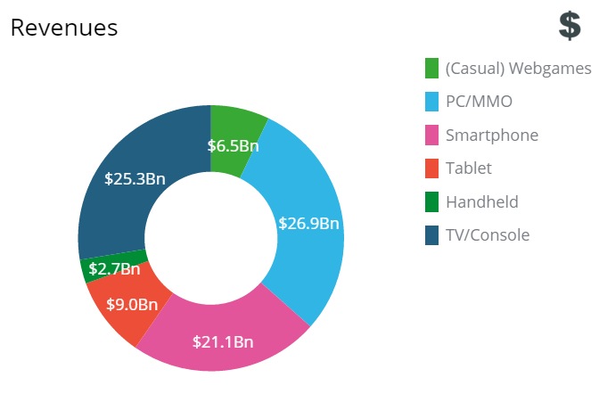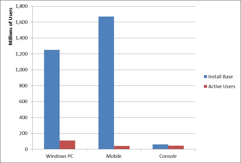 Spójrzcie na wykresy poniżej. Zarejestrowanych graczy PC jest bez porównania więcej. Jednak aktywnych graczy jest podobna ilość. Przekłada się to na bardzo zbliżony dochód z tych dwóch platform. Po piętach depczą im jednak smartfony!
